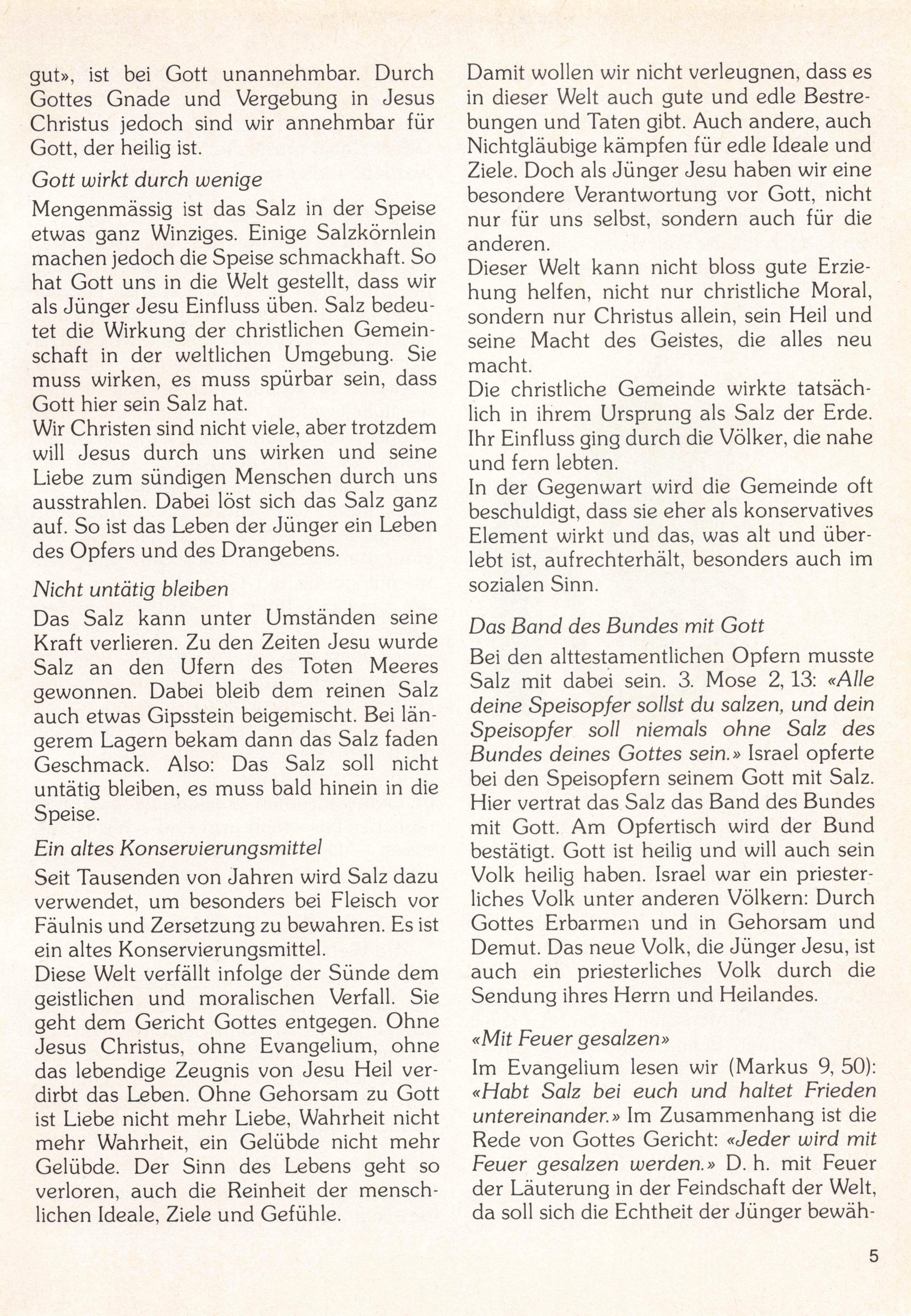 Im Evangelium lesen wir (Markus 9, 50): «Habt Salz bei euch und haltet Frieden untereinander.» Im Zusammenhang ist die Rede von Gottes Gericht: «Jeder wird mit Feuer gesalzen werden.» D. h. mit Eeuer der Läuterung in der Feindschaft der Welt, da soll sich die Echtheit der Jünger bewäh-