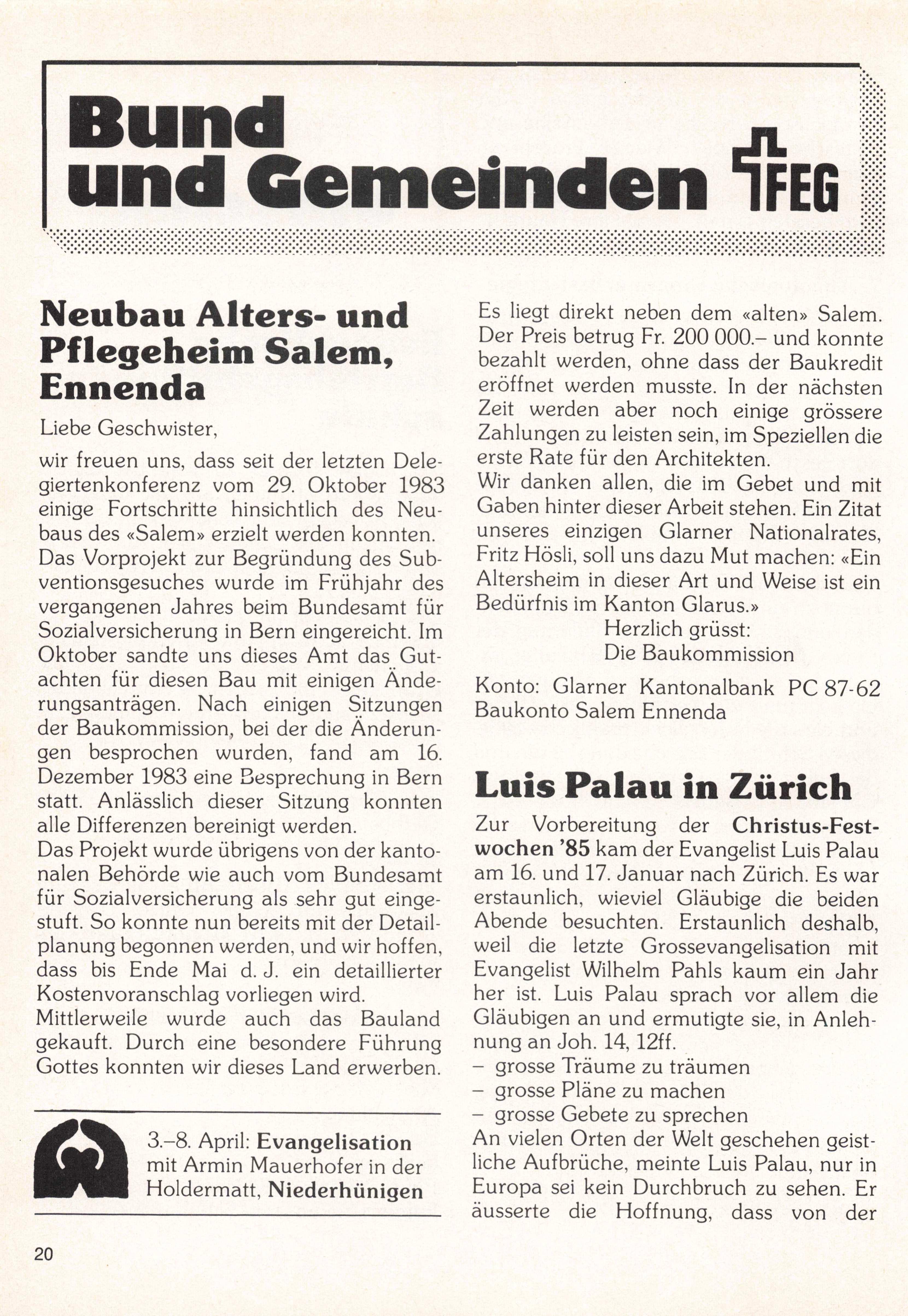 Zur Vorbereitung der Christus-Fest wochen ’85 kam der Evangelist Luis Palau am 16. und 17. Januar nach Zürich. Es war erstaunlich, wieviel Gläubige die beiden Abende besuchten. Erstaunlich deshalb, weil die letzte Grossevangelisation mit Evangelist Wilhelm Pahls kaum ein Jahr her ist. Luis Palau sprach vor allem die Gläubigen an und ermutigte sie, in Anleh nung an Joh. 14,12ff.