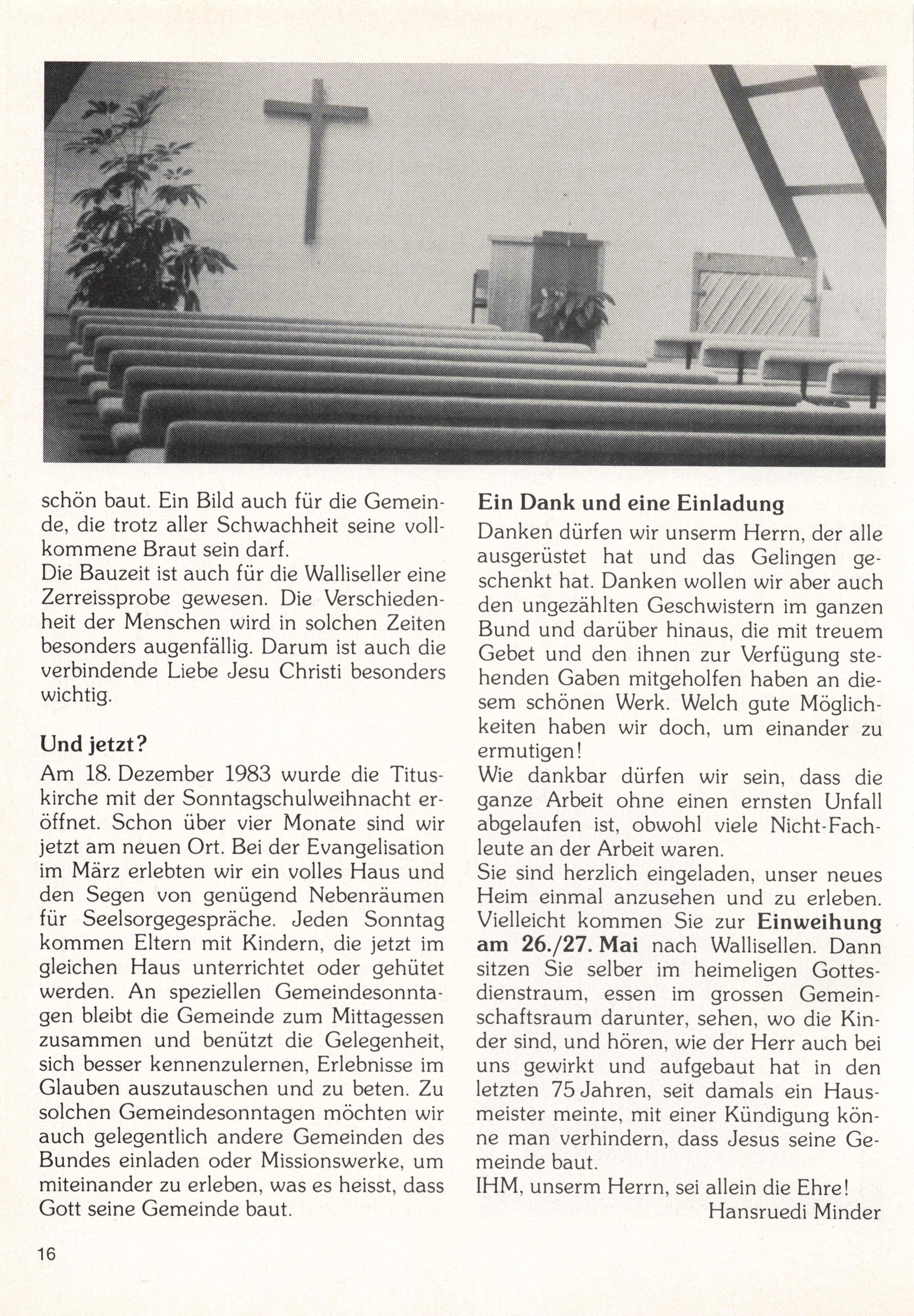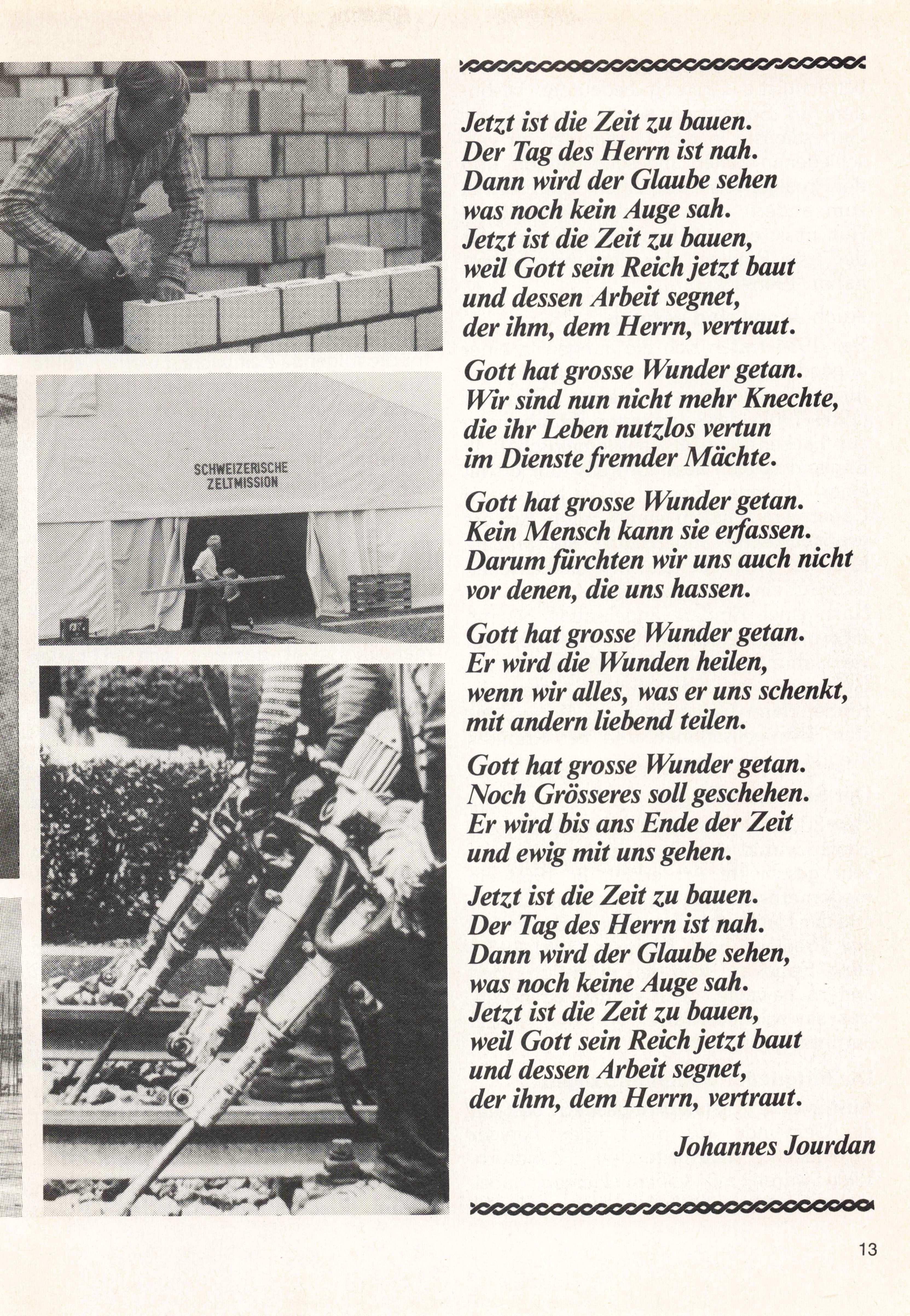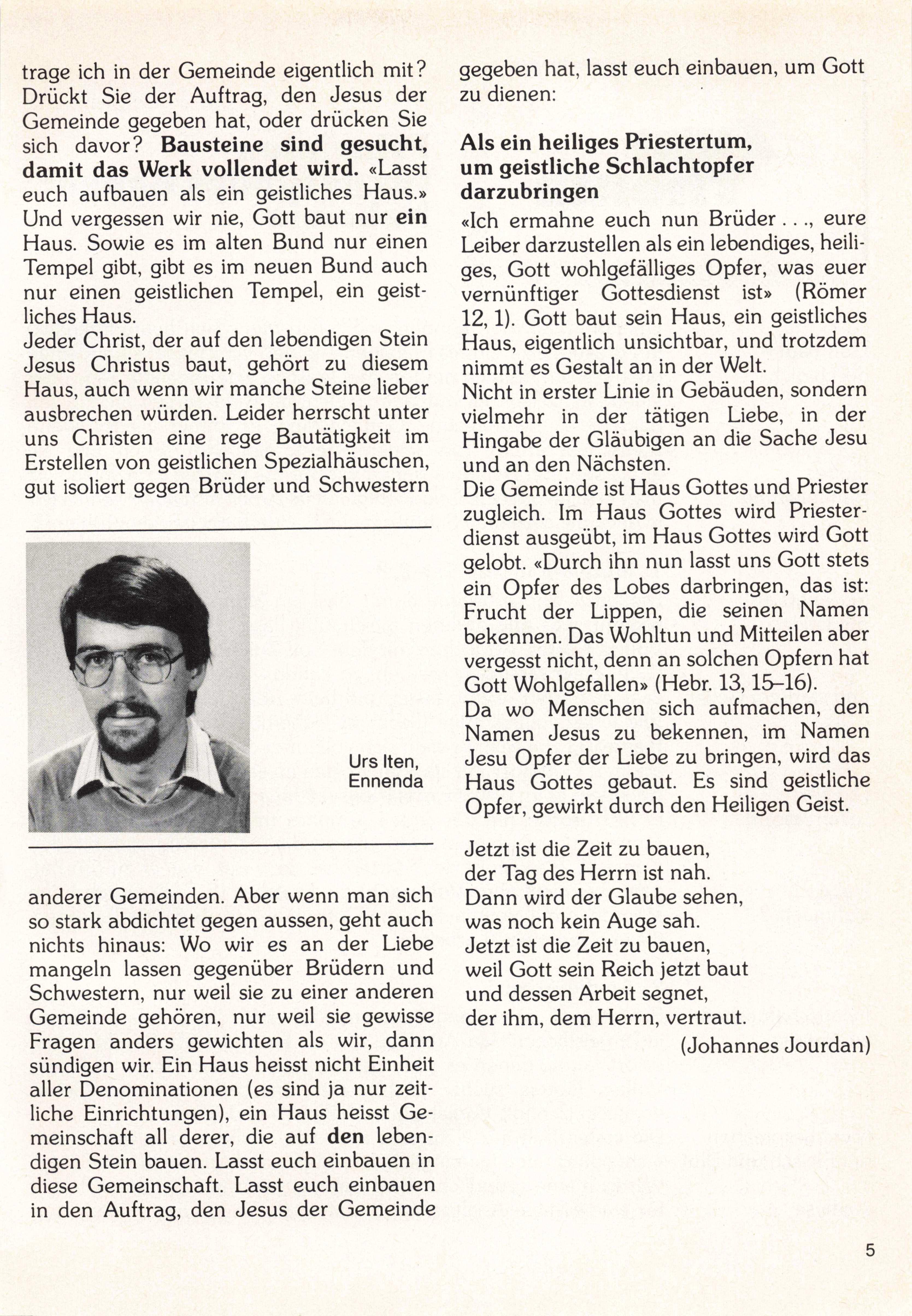 Jetzt ist die Zeit zu bauen, der Tag des Herrn ist nah. Dann wird der Glaube sehen, was noch kein Auge sah. Jetzt ist die Zeit zu bauen, weil Gott sein Reich jetzt baut und dessen Arbeit segnet, der ihm, dem Herrn, vertraut. anderer Gemeinden. Aber wenn man sich so stark abdichtet gegen aussen, geht auch nichts hinaus: Wo wir es an der Liebe mangeln lassen gegenüber Brüdern und Schwestern, nur weil sie zu einer anderen Gemeinde gehören, nur weil sie gewisse Fragen anders gewichten als wir, dann sündigen wir. Ein Haus heisst nicht Einheit aller Denominationen (es sind ja nur zeit liche Einrichtungen), ein Haus heisst Ge meinschaft all derer, die auf den leben digen Stein bauen. Lasst euch einbauen in diese Gemeinschaft. Lasst euch einbauen in den Auftrag, den Jesus der Gemeinde (Johannes Jourdan)