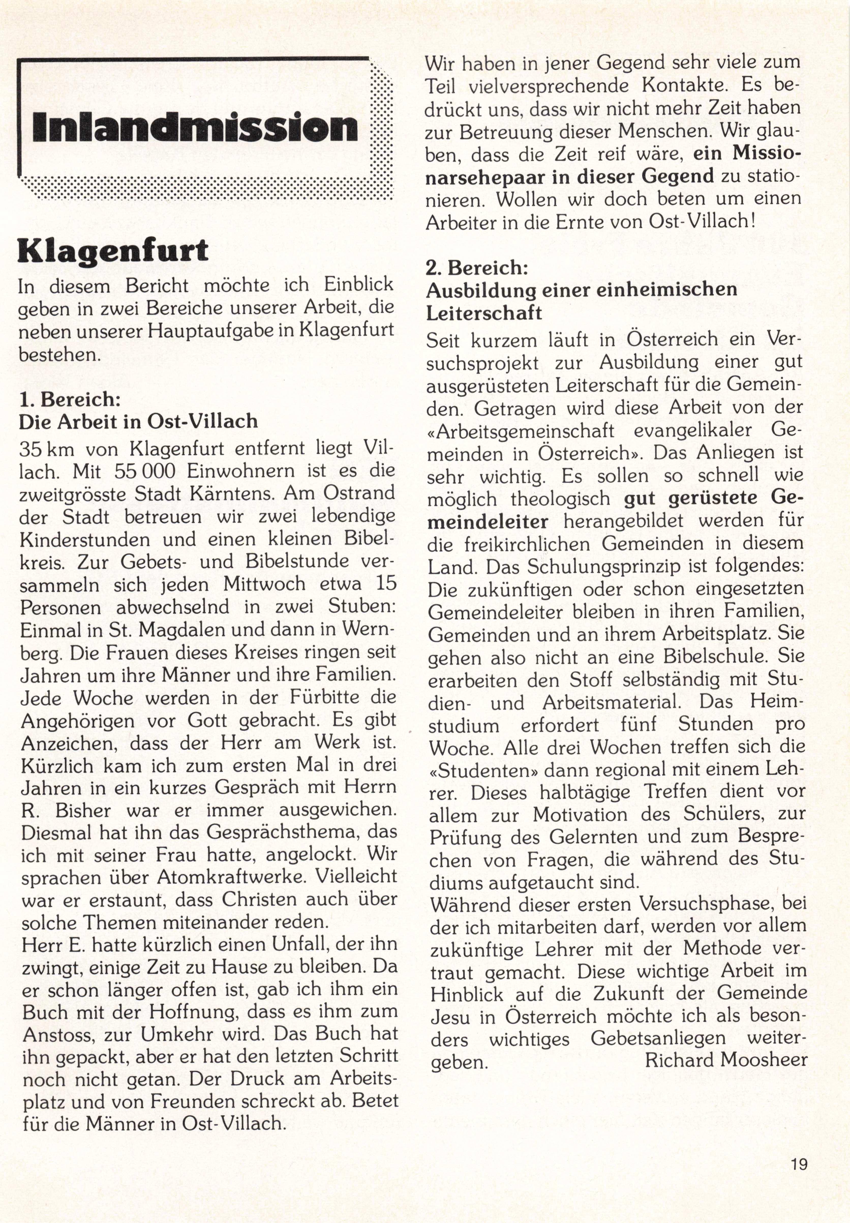 Wir haben in jener Gegend sehr viele zum Teil vielversprechende Kontakte. Es be drückt uns, dass wir nicht mehr Zeit haben zur Betreuung dieser Menschen. Wir glau ben, dass die Zeit reif wäre, ein Missio narsehepaar in dieser Gegend zu statio nieren. Wollen wir doch beten um einen Arbeiter in die Ernte von Ost-Villach!