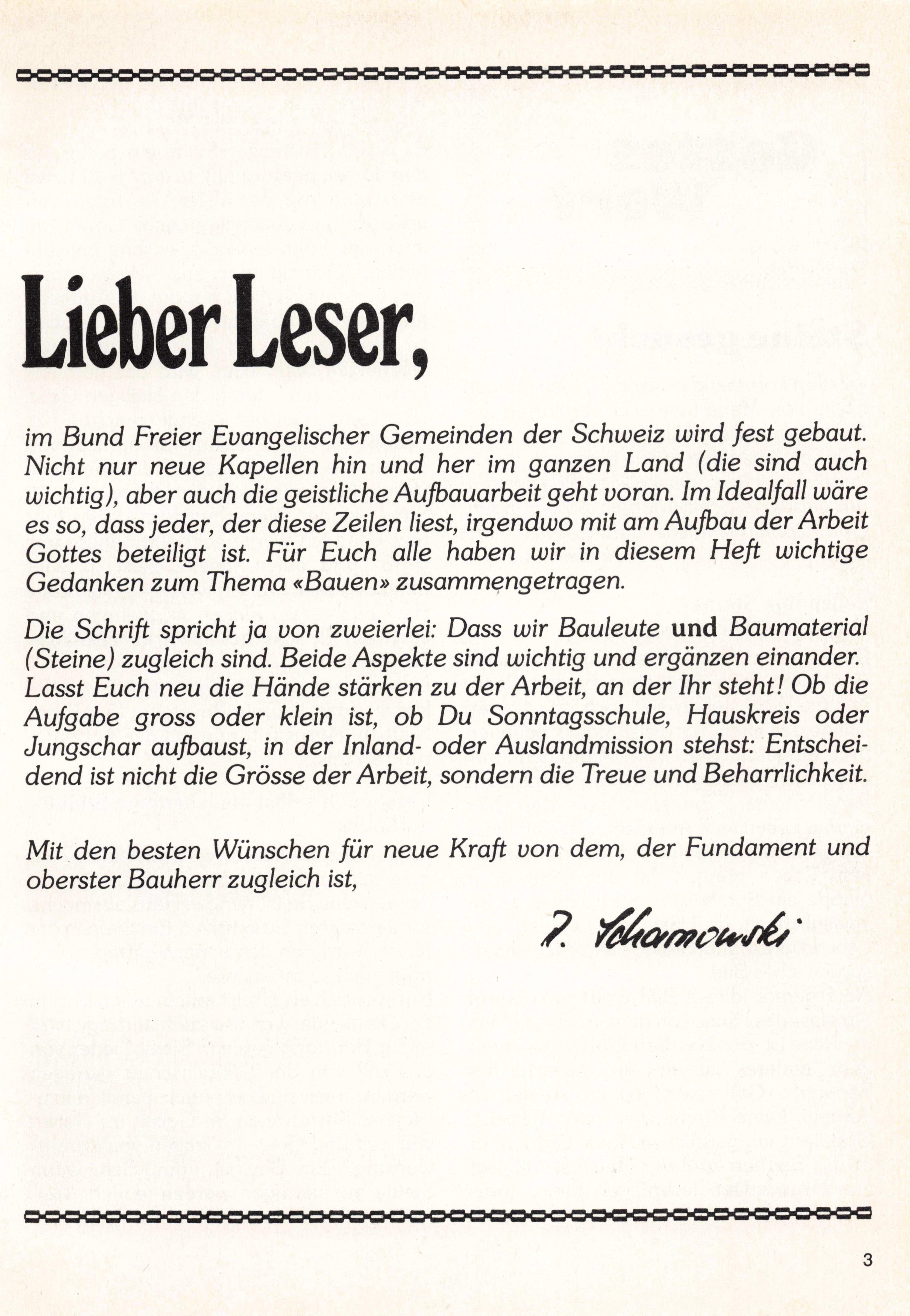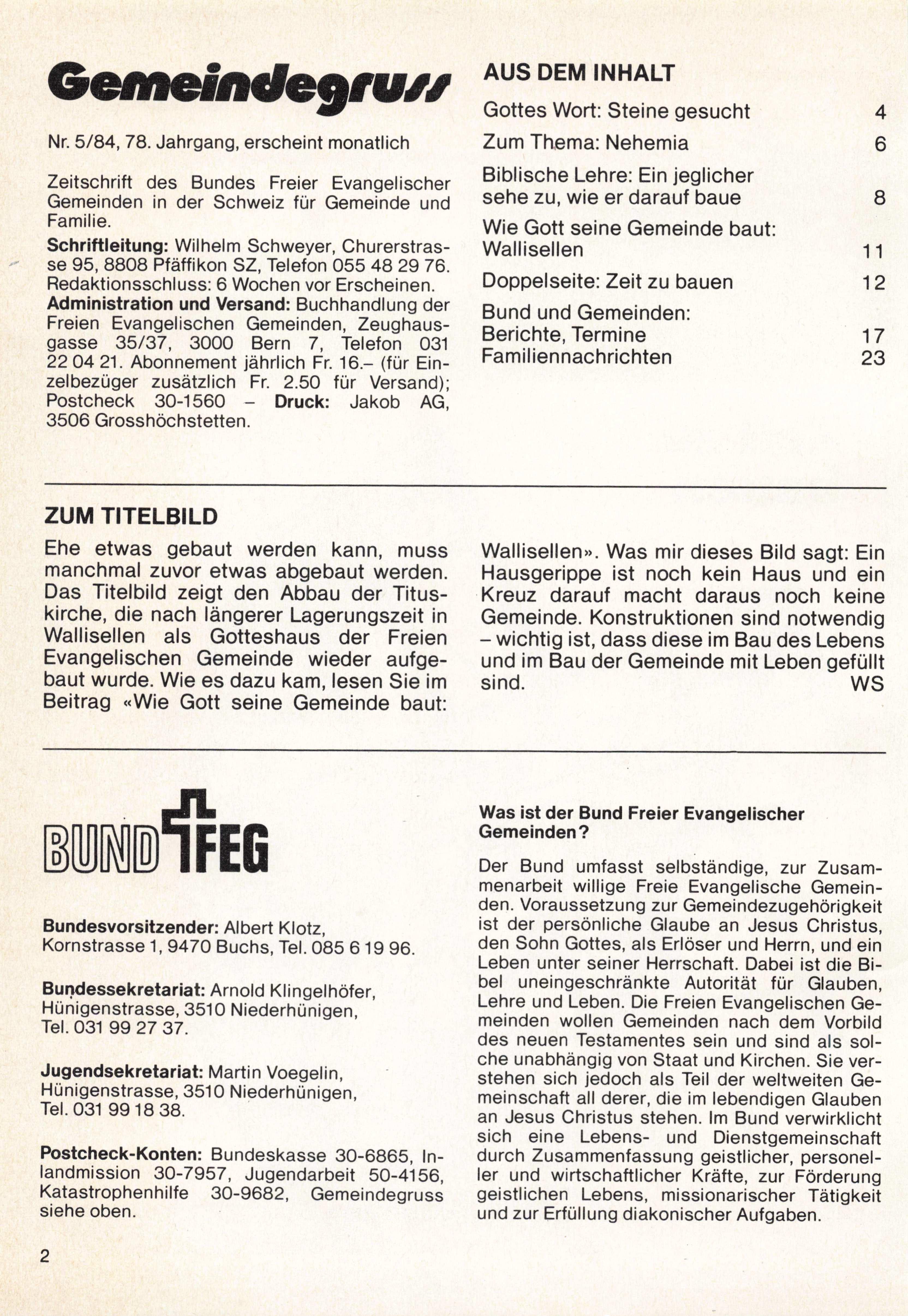 Schriftleitung: Wilhelm Schweyer, Churerstrasse 95, 8808 Pfäffikon SZ, Telefon 055 48 29 76. Redaktionsschluss: 6 Wochen vor Erscheinen. Administration und Versand: Buchhandlung der Freien Evangelischen Gemeinden, Zeughaus gasse 35/37, 3000 Bern 7, Telefon 031 22 04 21. Abonnement jährlich Fr. 16.- (für Ein zelbezüger zusätzlich Fr. 2.50 für Versand); Postcheck 30-15603506 Grosshöchstetten.