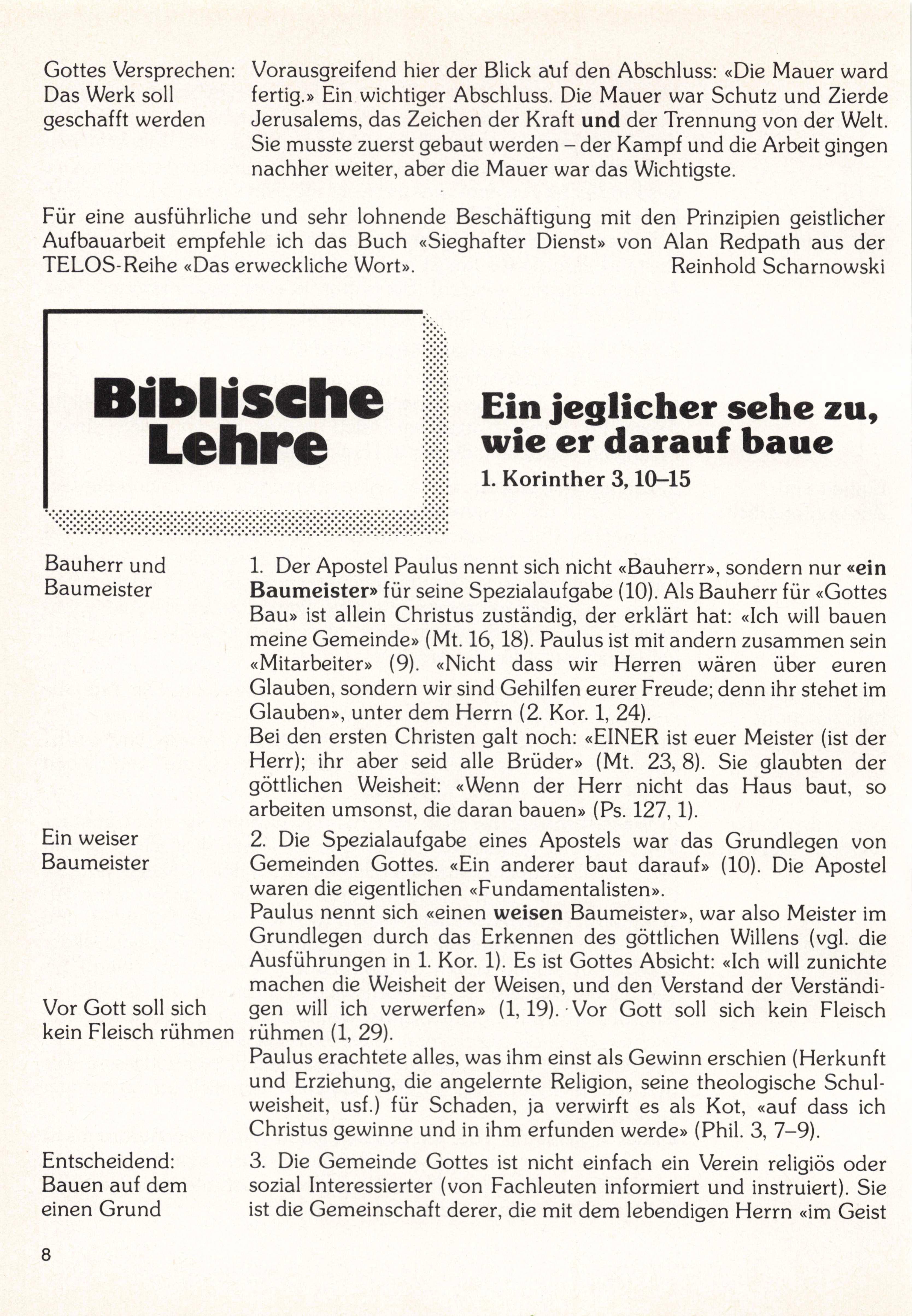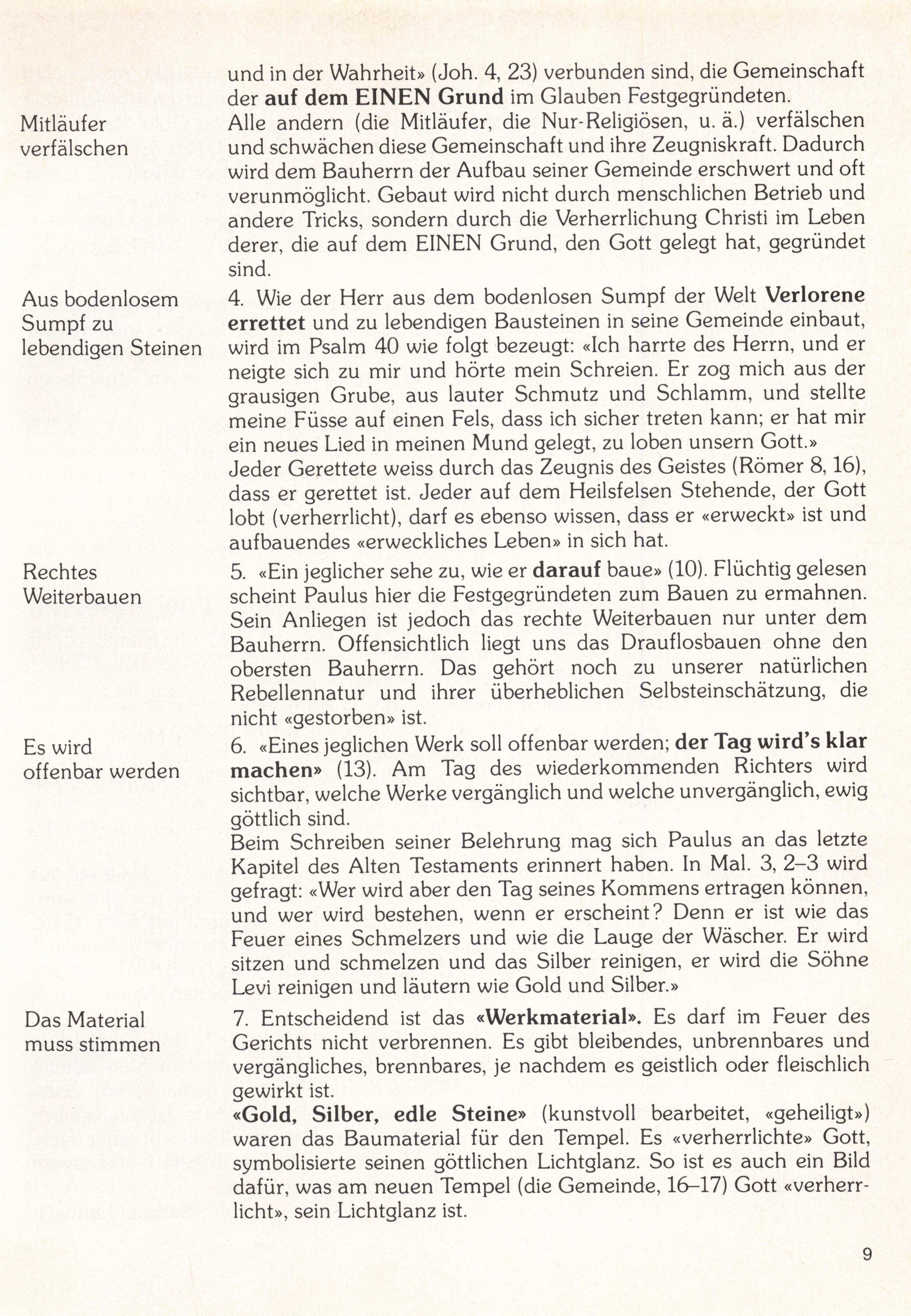 5. «Ein jeglicher sehe zu, wie er darauf baue» (10). Flüchtig gelesen scheint Paulus hier die Festgegründeten zum Bauen zu ermahnen. Sein Anliegen ist jedoch das rechte Weiterbauen nur unter dem Bauherrn. Offensichtlich liegt uns das Drauflosbauen ohne den obersten Bauherrn. Das gehört noch zu unserer natürlichen Rebellennatur und ihrer überheblichen Selbsteinschätzung, die nicht «gestorben» ist.