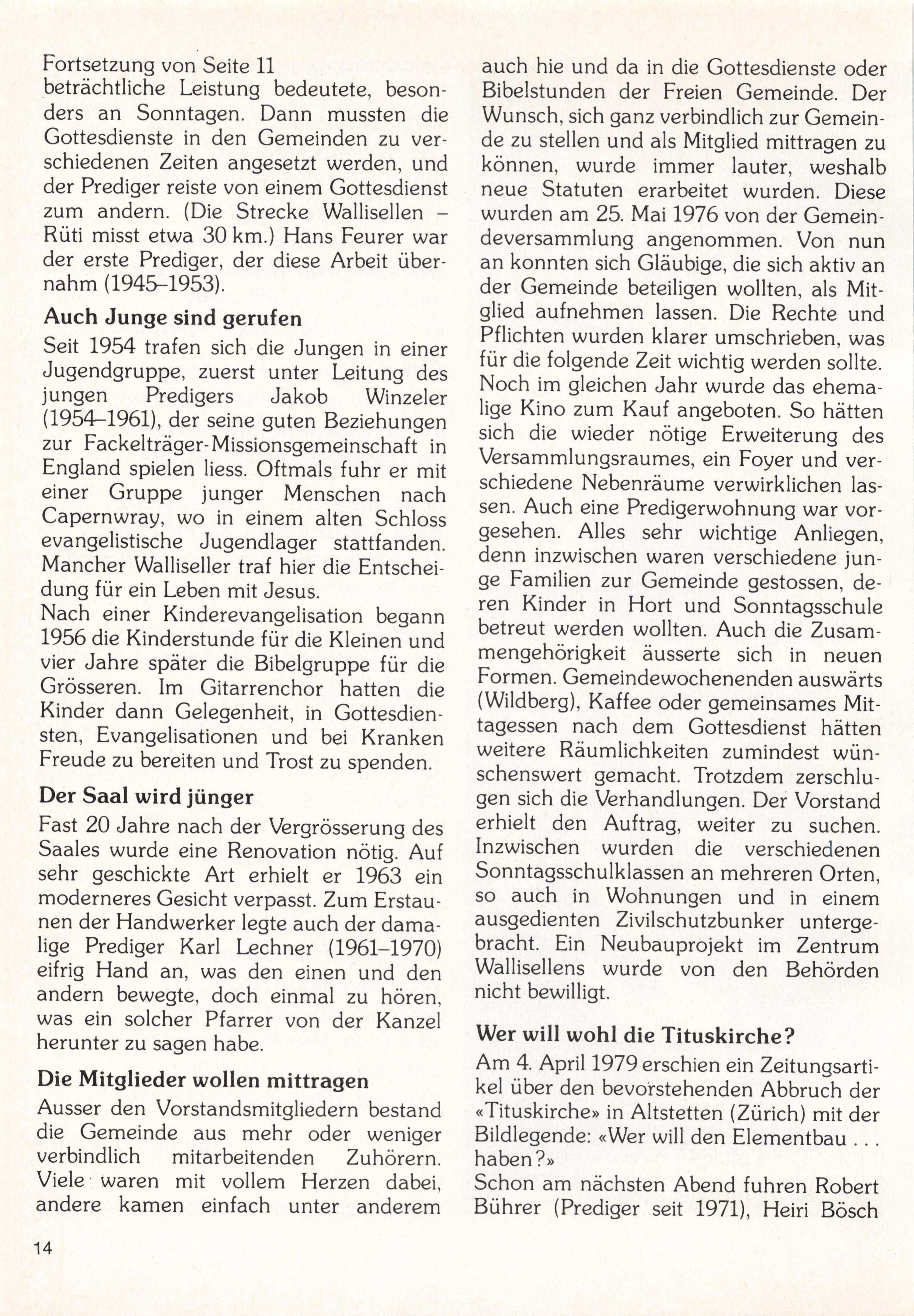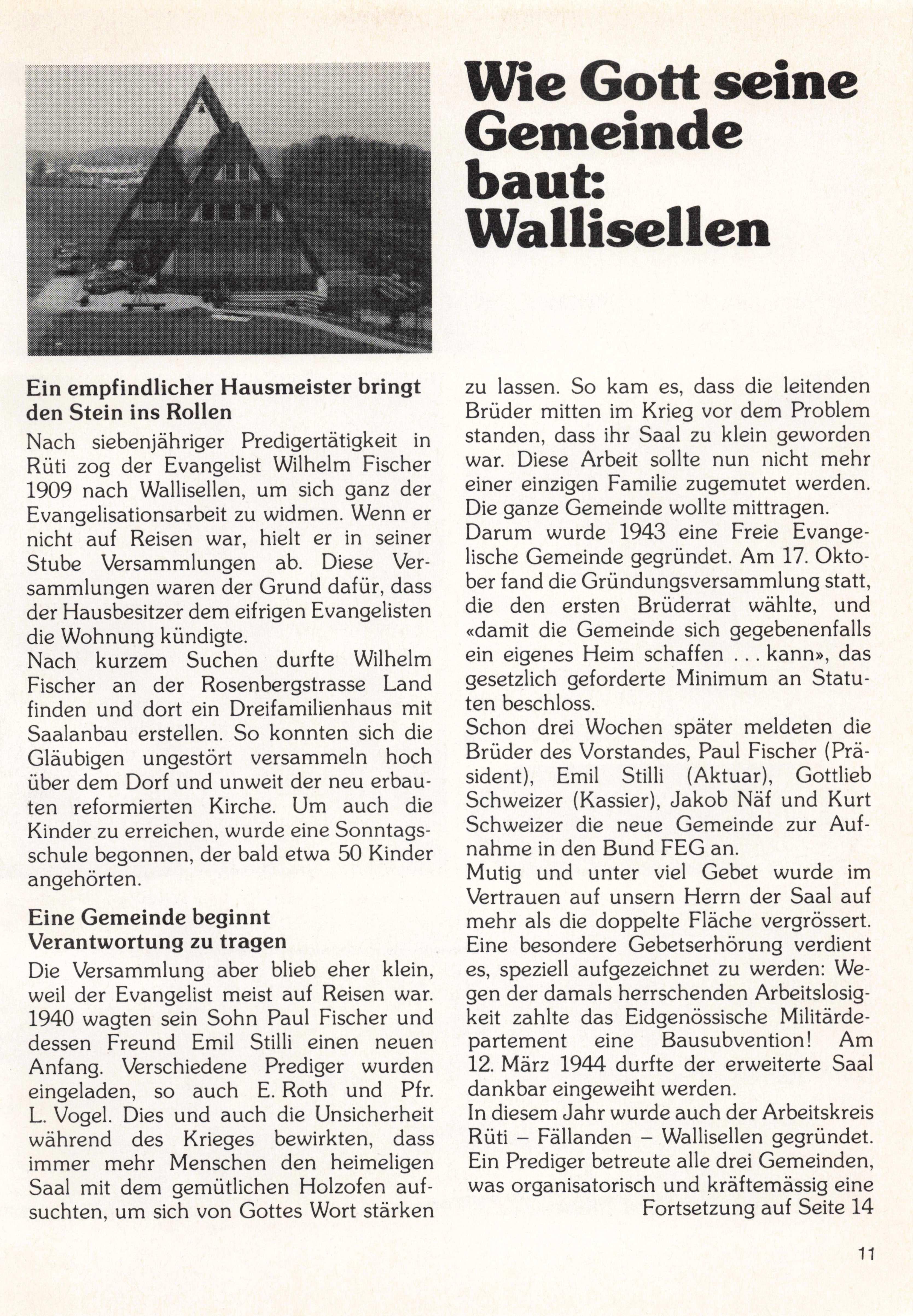 An der Delegierten-Konferenz des Bundes der Freien Evangelischen Gemeinden in der Schweiz vom 29. Oktober 1983 in Winterthur wurde unsere Gemeinde (vor mals Evangelische Missionsgemeinde, EMG) einstimmig in den Bund der FEG aufgenommen. Seit der Gründung der EMG im Jahre 1956 dienten der Gemeinde Brüder und Prediger im Nebenamt. Der Älteste und Mitgründer Paul Roth be schreibt den damaligen Auftrag wie folgt: «Von Anbeginn war uns klar, dass wir nicht einfach eine neue, nur auf sich bezogene Gemeinde bilden wollten, sondern beson ders die Mitverantwortung für die Aus sendung und Mitunterstützung von Missio naren zu übernehmen bereit waren. Im Laufe der Jahre wuchs die Verbindung zu 20 Missionsgeschwistern, teils zur EMG gehörend, teils befreundet, die in aller Welt ihren Auftrag erfüllen. Wir sind heute hundert Gemeindeglieder und eine Anzahl treuer Freunde aus Zürich sowie der nähe ren und weiteren Umgebung.»