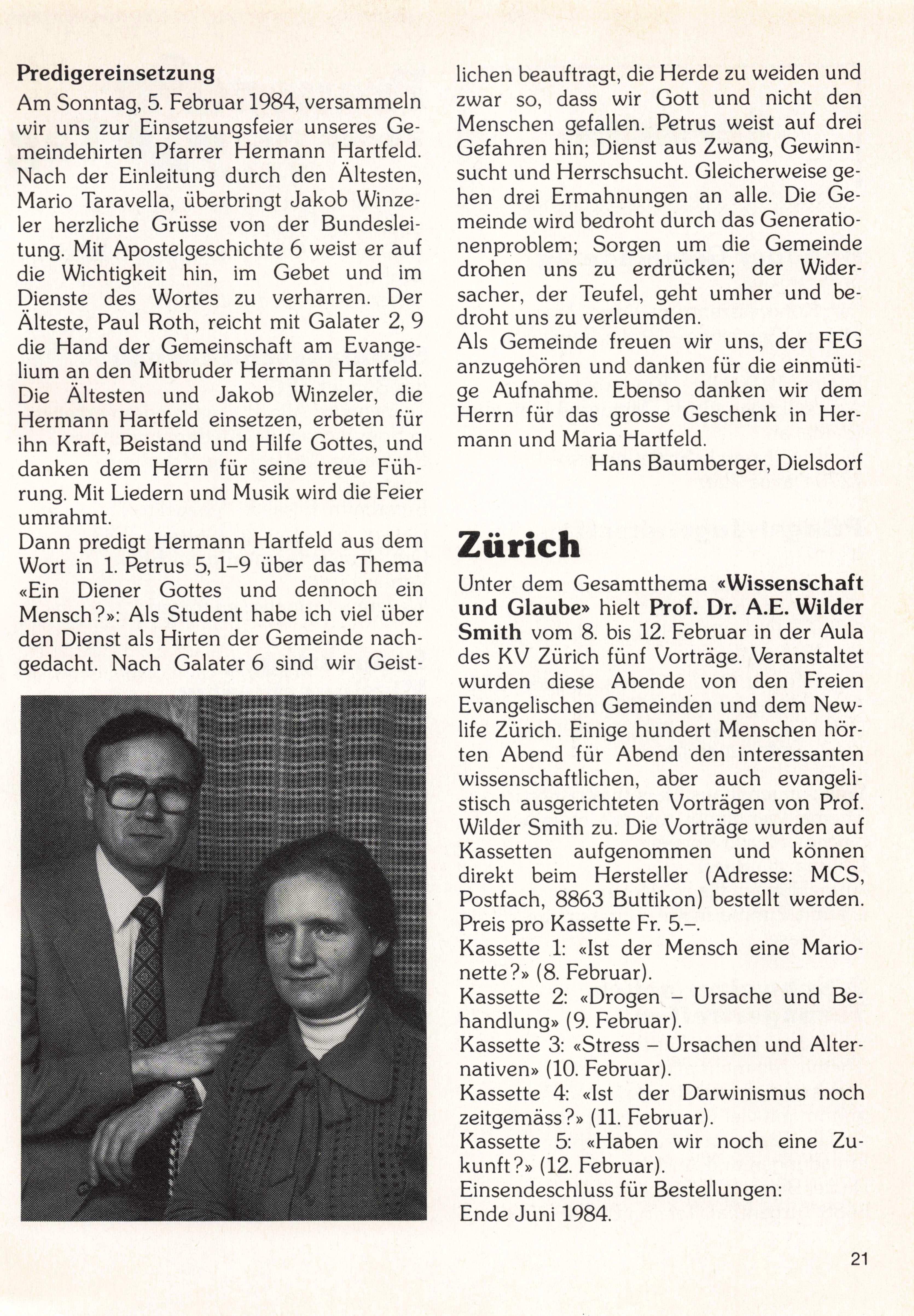 Am Sonntag, 5. Februar 1984, versammeln wir uns zur Einsetzungsfeier unseres Ge meindehirten Pfarrer Hermann Hartfeld. Nach der Einleitung durch den Ältesten, Mario Taravella, überbringt Jakob Winze1er herzliche Grüsse von der Bundeslei tung. Mit Apostelgeschichte 6 weist er auf die Wichtigkeit hin, im Gebet und im Dienste des Wortes zu verharren. Der Älteste, Paul Roth, reicht mit Galater 2, 9 die Hand der Gemeinschaft am Evange lium an den Mitbruder Hermann Hartfeld. Die Ältesten und Jakob Winzeier, die Hermann Hartfeld einsetzen, erbeten für ihn Kraft, Beistand und Hilfe Gottes, und danken dem Herrn für seine treue Füh rung. Mit Liedern und Musik wird die Feier umrahmt.