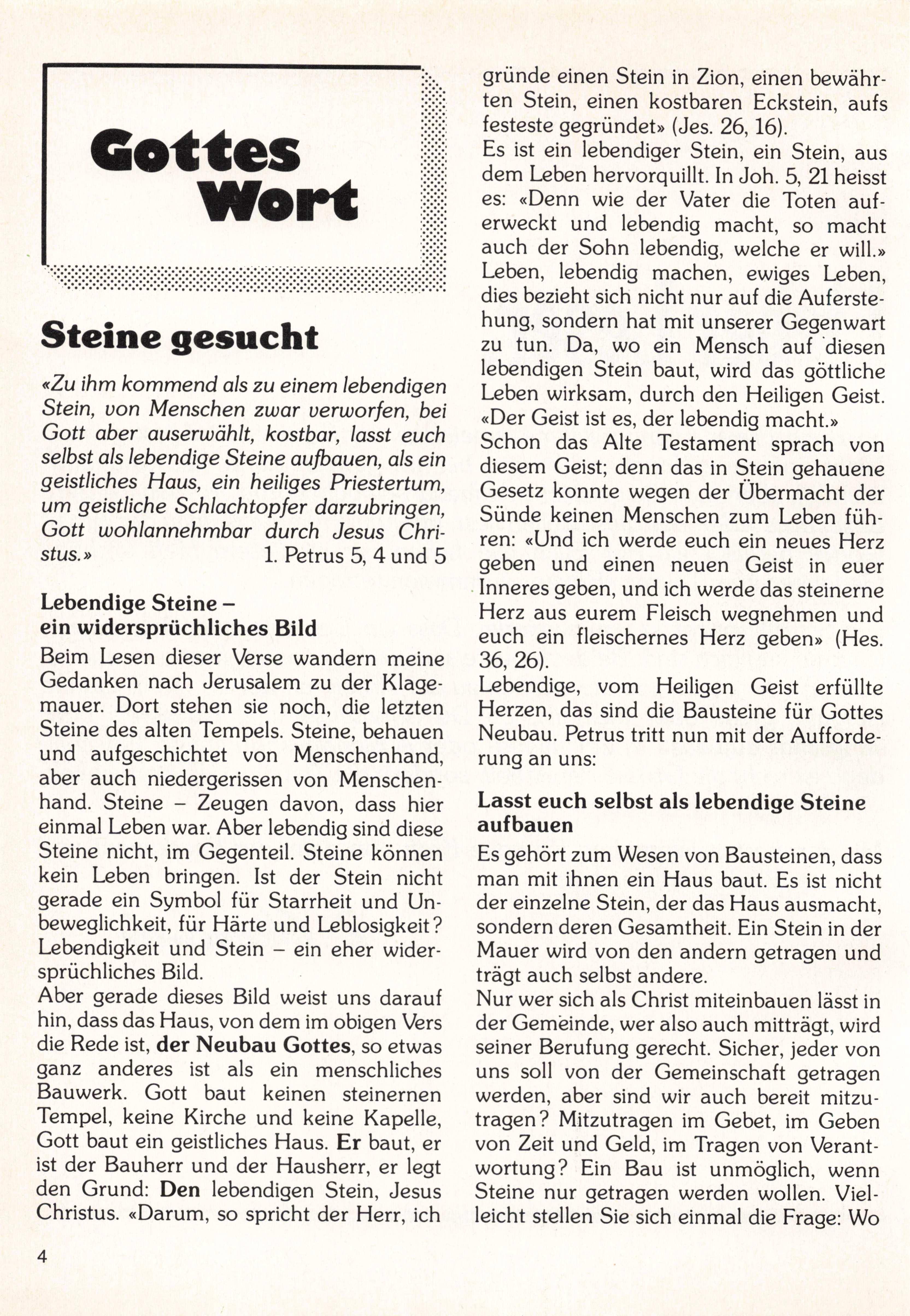 Es ist ein lebendiger Stein, ein Stein, aus dem Leben hervorquillt. In Joh. 5, 21 heisst es: «Denn wie der Vater die Toten auf erweckt und lebendig macht, so macht auch der Sohn lebendig, welche er will.» Leben, lebendig machen, ewiges Leben, dies bezieht sich nicht nur auf die Auferste hung, sondern hat mit unserer Gegenwart zu tun. Da, wo ein Mensch auf diesen lebendigen Stein baut, wird das göttliche Leben wirksam, durch den Heiligen Geist. «Der Geist ist es, der lebendig macht.» Schon das Alte Testament sprach von diesem Geist; denn das in Stein gehauene Gesetz konnte wegen der Übermacht der Sünde keinen Menschen zum Leben füh ren: «Und ich werde euch ein neues Herz geben und einen neuen Geist in euer Inneres geben, und ich werde das steinerne Herz aus eurem Fleisch wegnehmen und euch ein fleischernes Herz geben» (Hes. 36, 26).