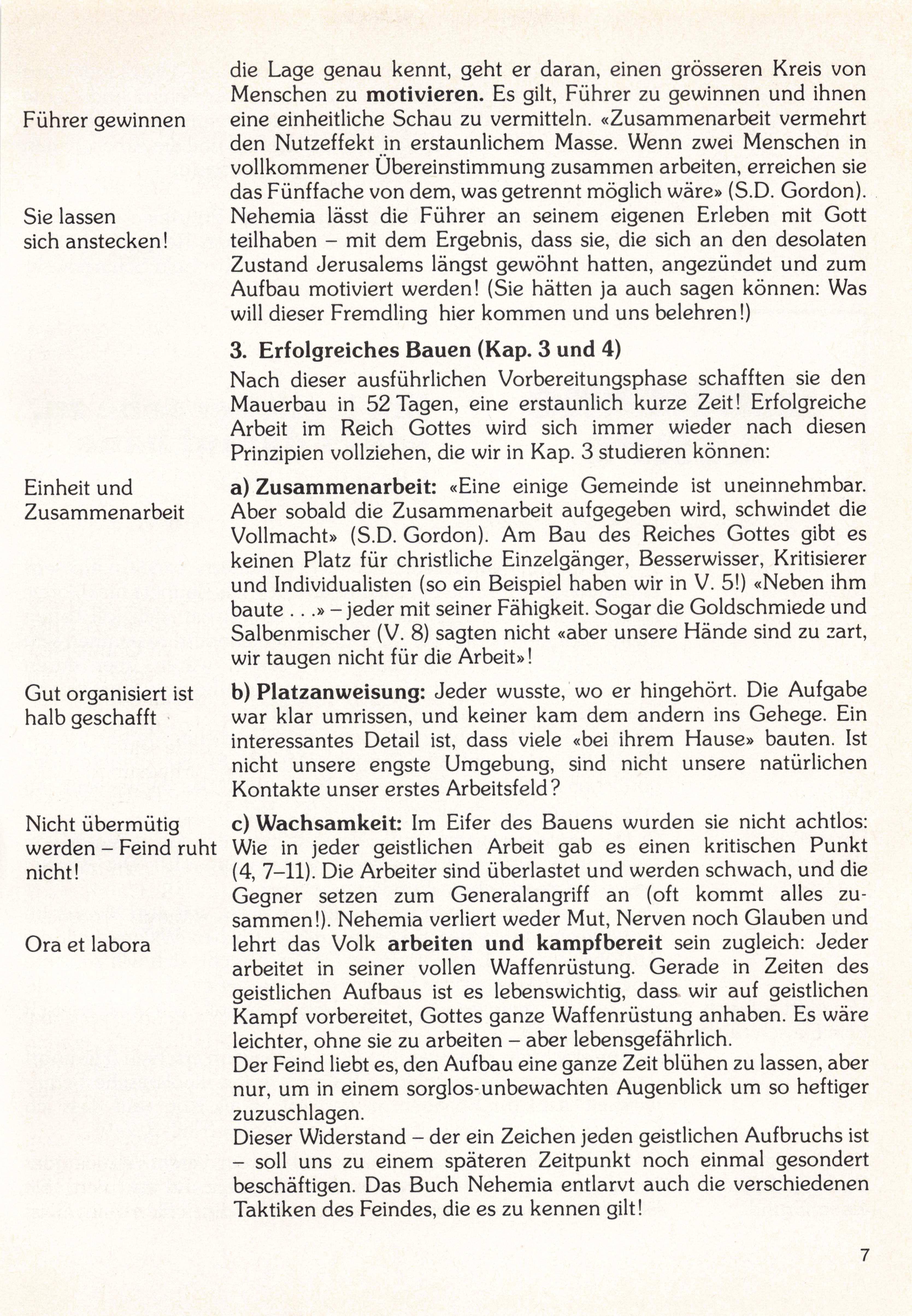 a) Zusammenarbeit: «Eine einige Gemeinde ist uneinnehmbar. Aber sobald die Zusammenarbeit aufgegeben wird, schwindet die Vollmacht» (S.D. Gordon). Am Bau des Reiches Gottes gibt es keinen Platz für christliche Einzelgänger, Besserwisser, Kritisierer und Individualisten (so ein Beispiel haben wir in V. 5!) «Neben ihm baute ...»- jeder mit seiner Fähigkeit. Sogar die Goldschmiede und Salbenmischer (V. 8) sagten nicht «aber unsere Hände sind zu zart, wir taugen nicht für die Arbeit»!