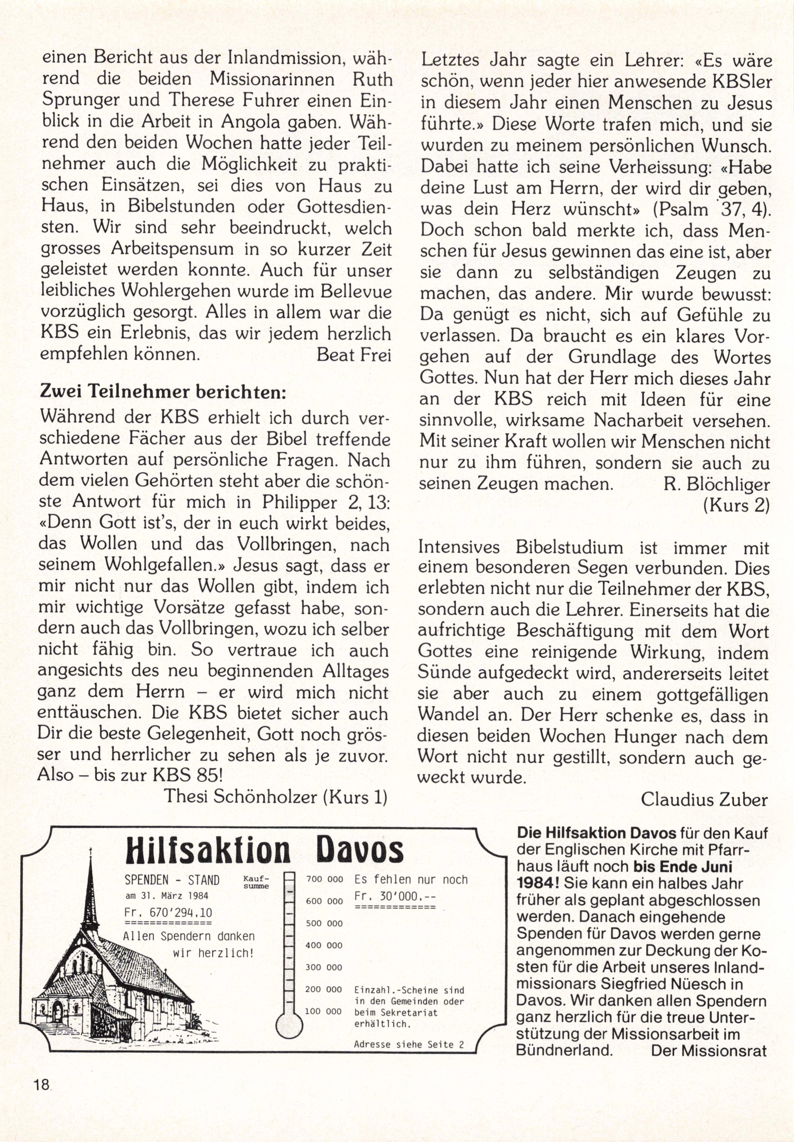 Die Hilfsaktion Davos für den Kauf der Englischen Kirche mit Pfarr haus läuft noch bis Ende Juni 1984! Sie kann ein halbes Jahr früher als geplant abgeschlossen werden. Danach eingehende Spenden für Davos werden gerne angenommen zur Deckung der Ko sten für die Arbeit unseres Inland missionars Siegfried Nüesch in Davos. Wir danken allen Spendern ganz herzlich für die treue Unter stützung der Missionsarbeit im Bündnerland.