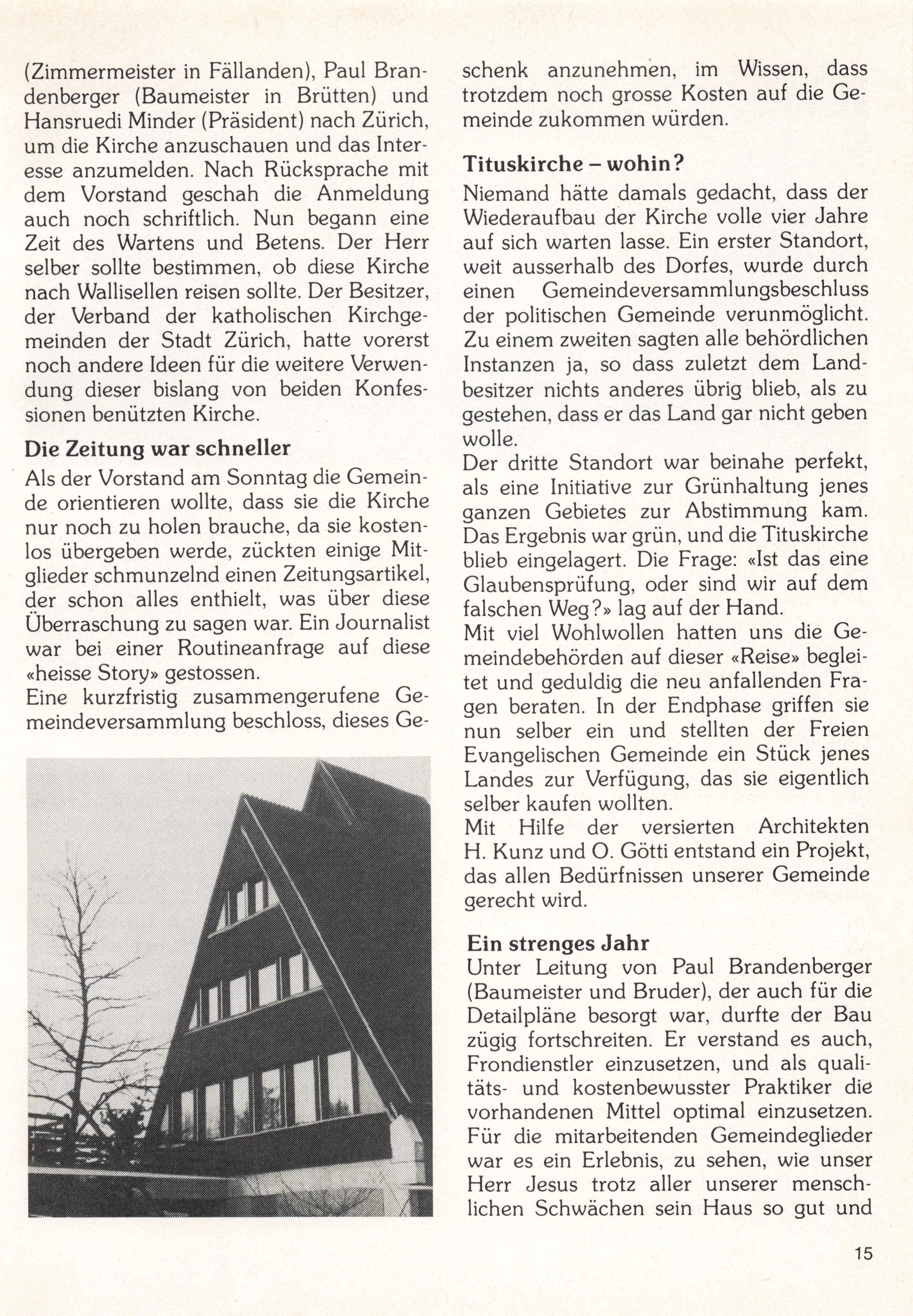 Ehe etwas gebaut werden kann, muss manchmal zuvor etwas abgebaut werden. Das Titelbild zeigt den Abbau der Titus kirche, die nach längerer Lagerungszeit in Wallisellen als Gotteshaus der Freien Evangelischen Gemeinde wieder aufge baut wurde. Wie es dazu kam, lesen Sie im Beitrag «Wie Gott seine Gemeinde baut: