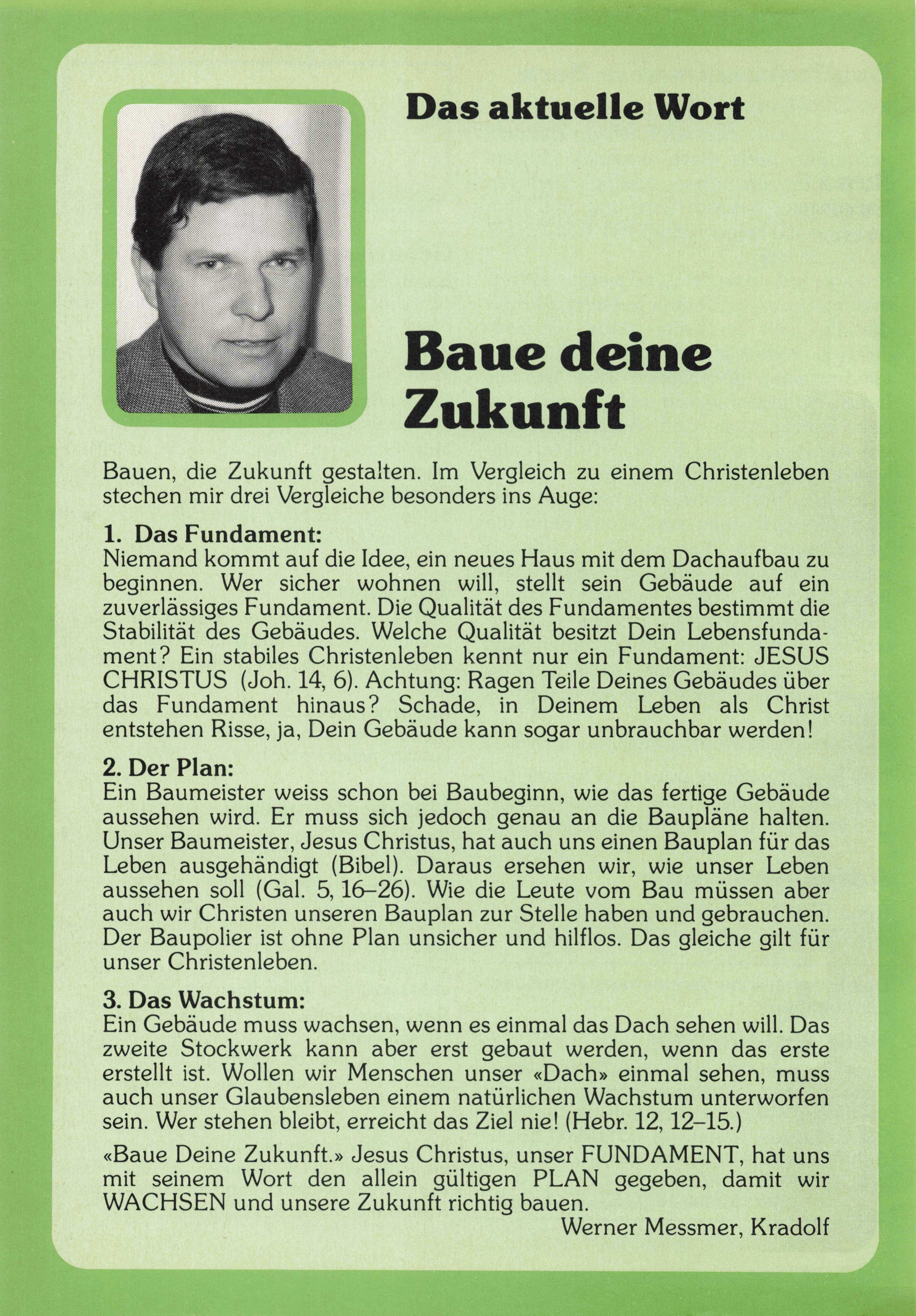 «Baue Deine Zukunft.» Jesus Christus, unser FUNDAMENT, hat uns mit seinem Wort den allein gültigen PLAN gegeben, damit wir WACHSEN und unsere Zukunft richtig bauen.
