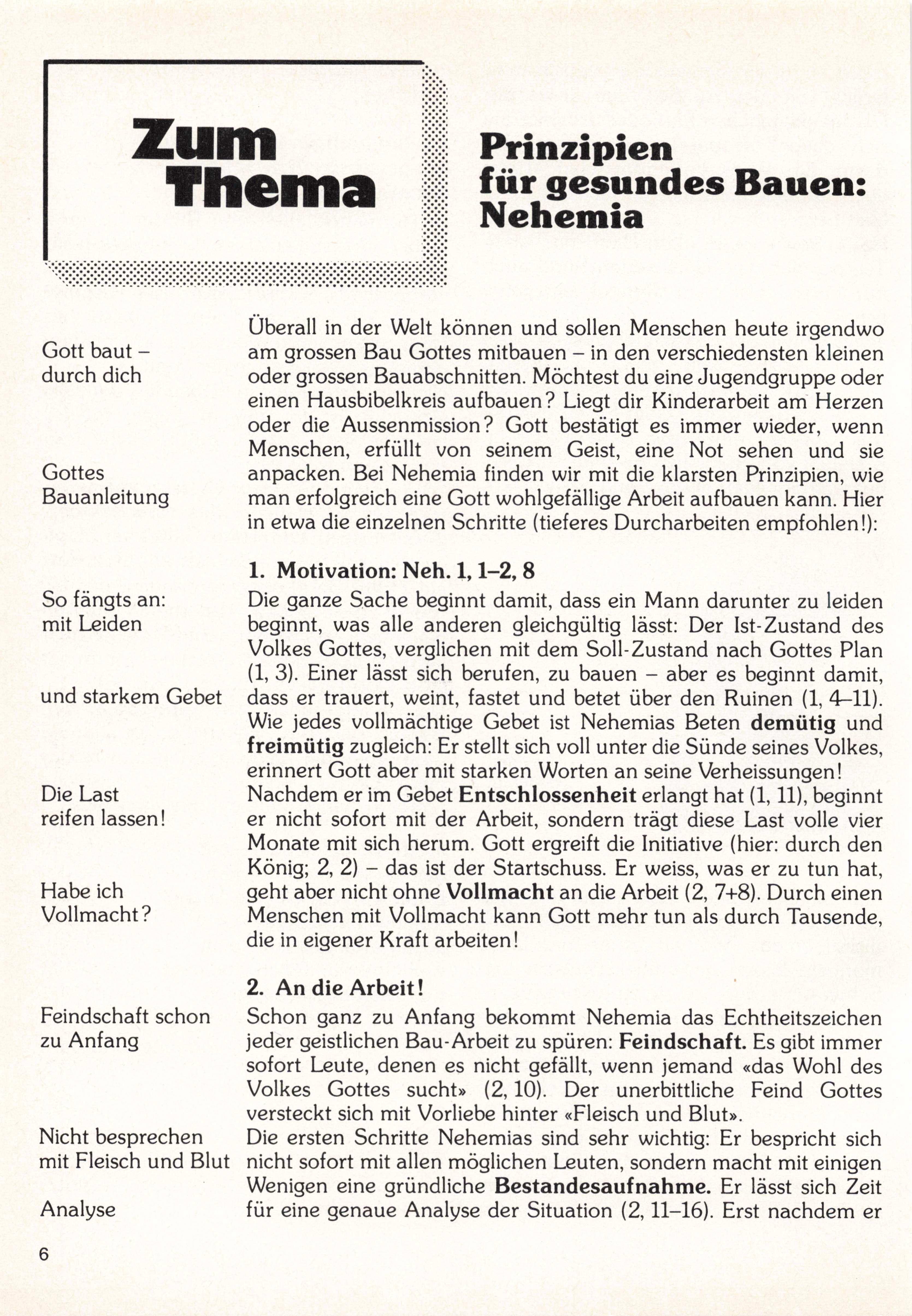 überall in der Welt können und sollen Menschen heute irgendwo am grossen Bau Gottes mitbauen - in den verschiedensten kleinen oder grossen Bauabschnitten. Möchtest du eine Jugendgruppe oder einen Hausbibelkreis aufbauen? Liegt dir Kinderarbeit am Herzen oder die Aussenmission ? Gott bestätigt es immer wieder, wenn Menschen, erfüllt von seinem Geist, eine Not sehen und sie anpacken. Bei Nehemia finden wir mit die klarsten Prinzipien, wie man erfolgreich eine Gott wohlgefällige Arbeit aufbauen kann. Hier in etwa die einzelnen Schritte (tieferes Durcharbeiten empfohlen!):