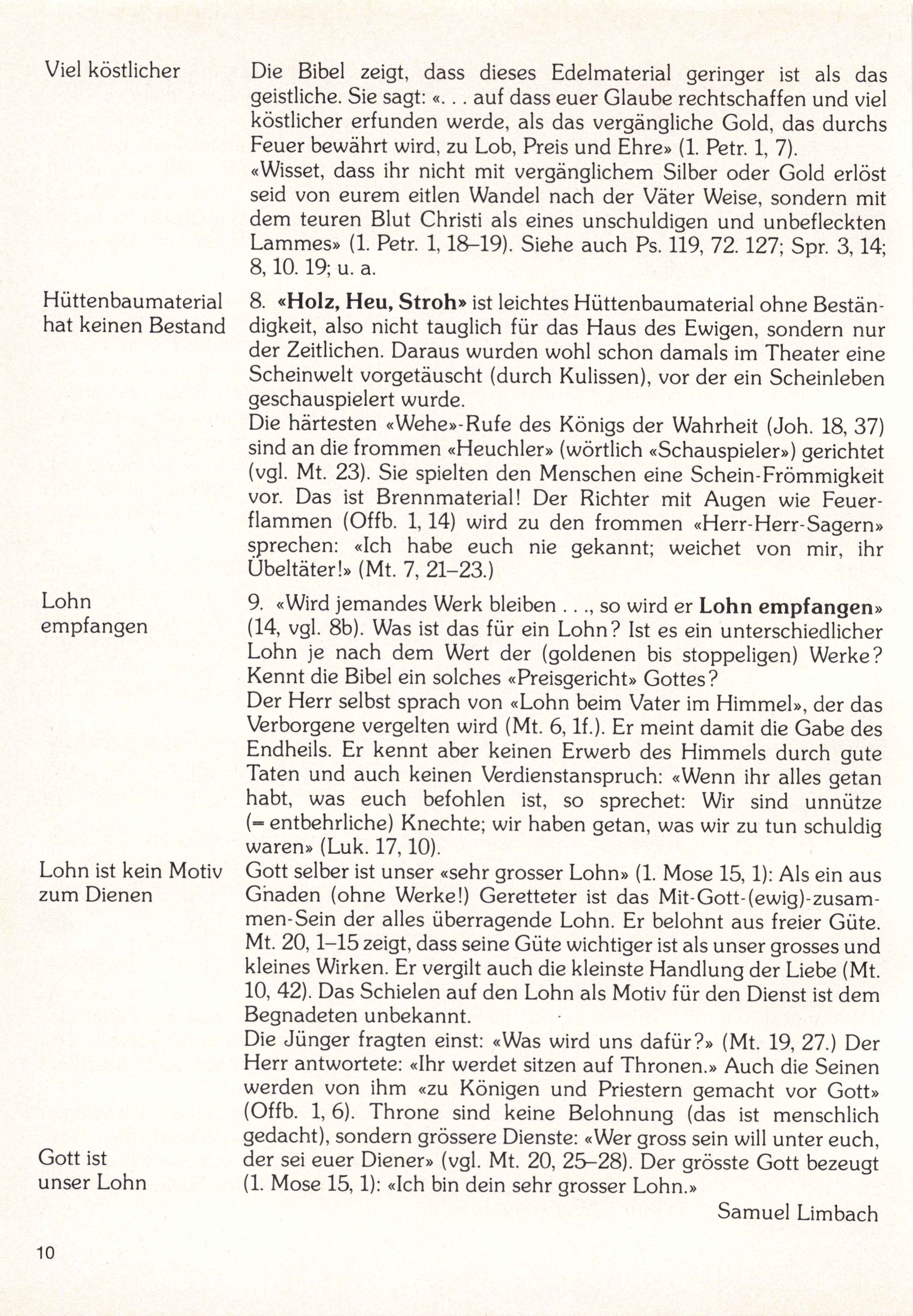 9. «Wird jemandes Werk bleiben ..., so wird er Lohn empfangen» (14, vgl. 8b). Was ist das für ein Lohn? Ist es ein unterschiedlicher Lohn je nach dem Wert der (goldenen bis stoppeligen) Werke? Kennt die Bibel ein solches «Preisgericht» Gottes?