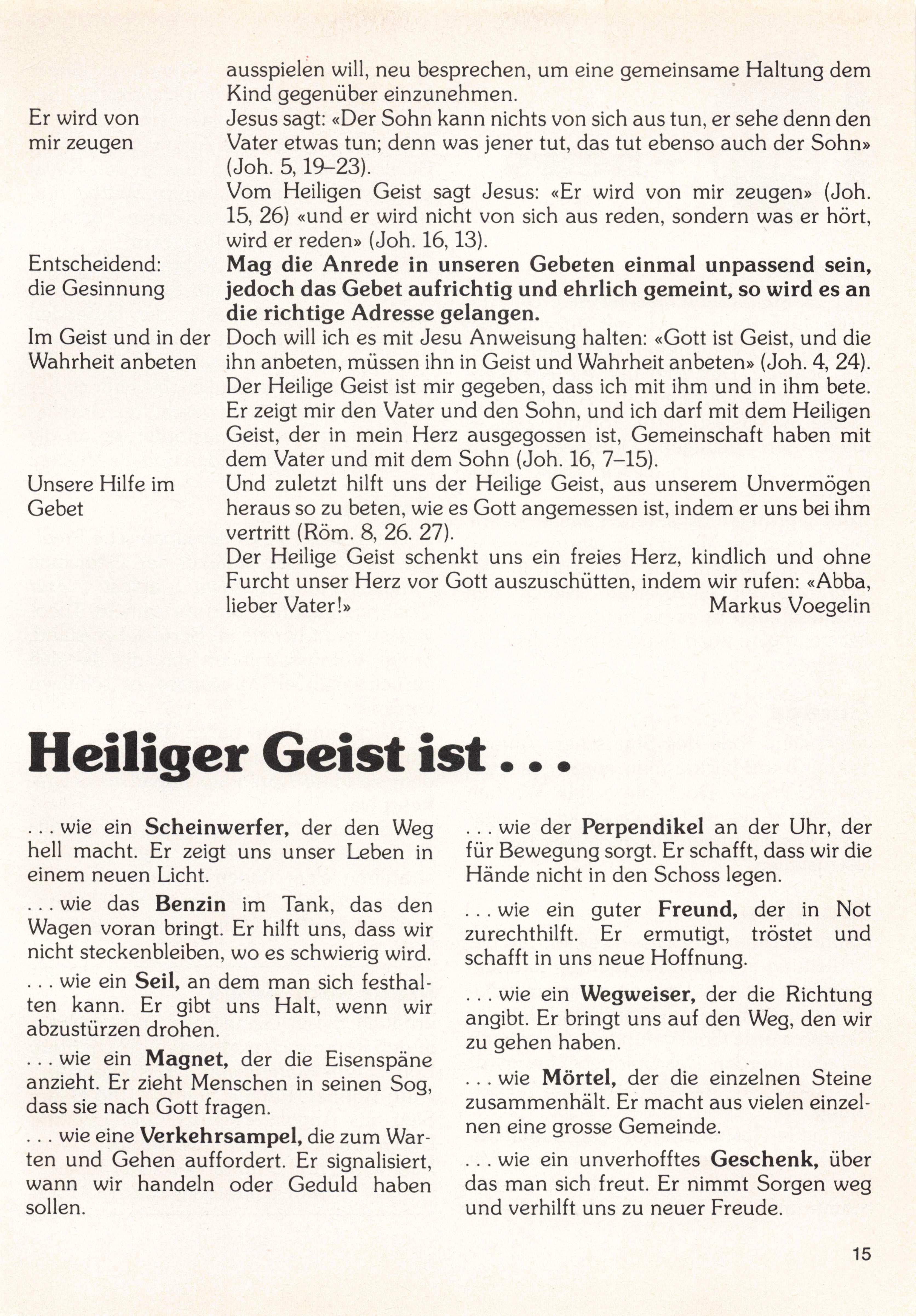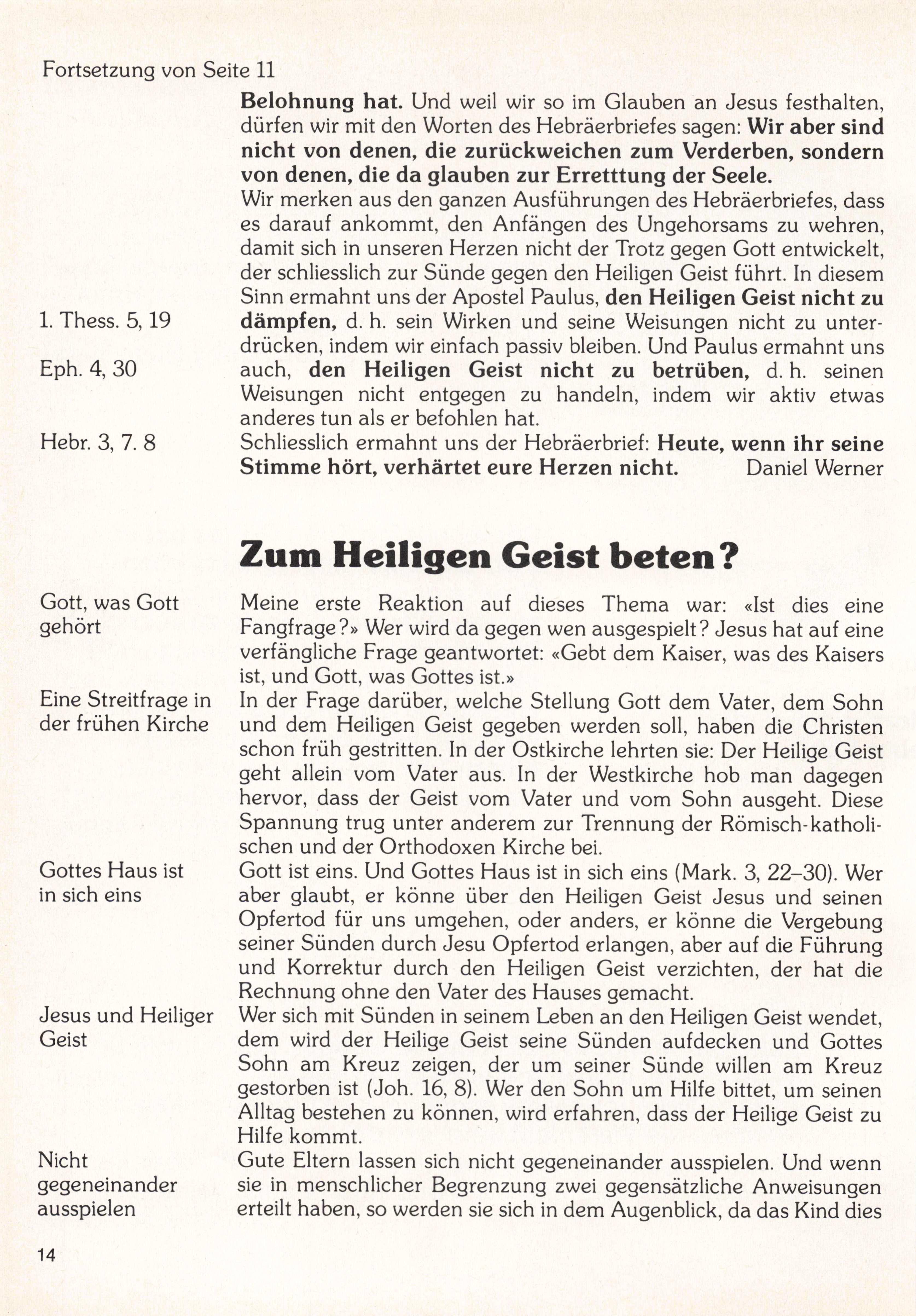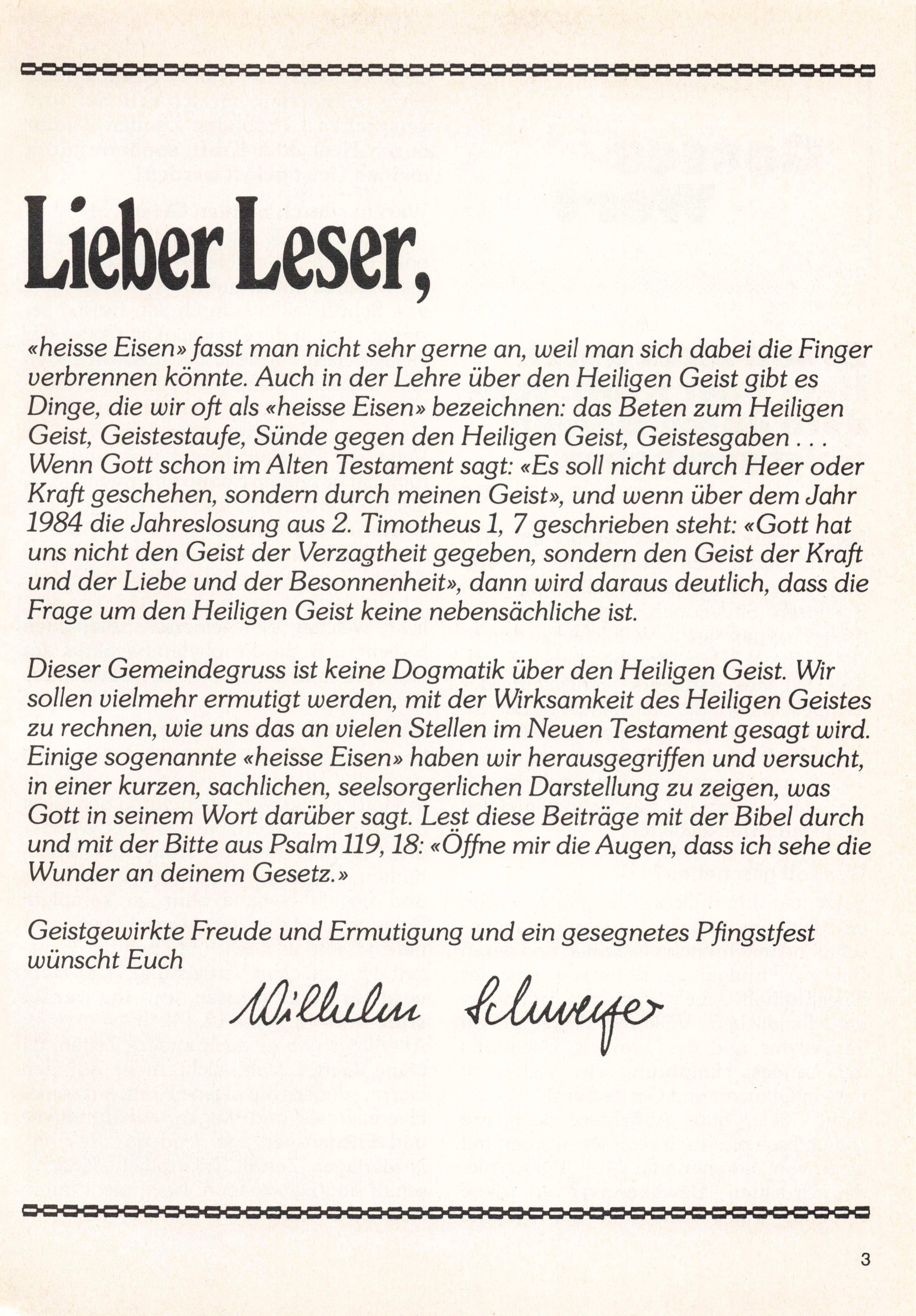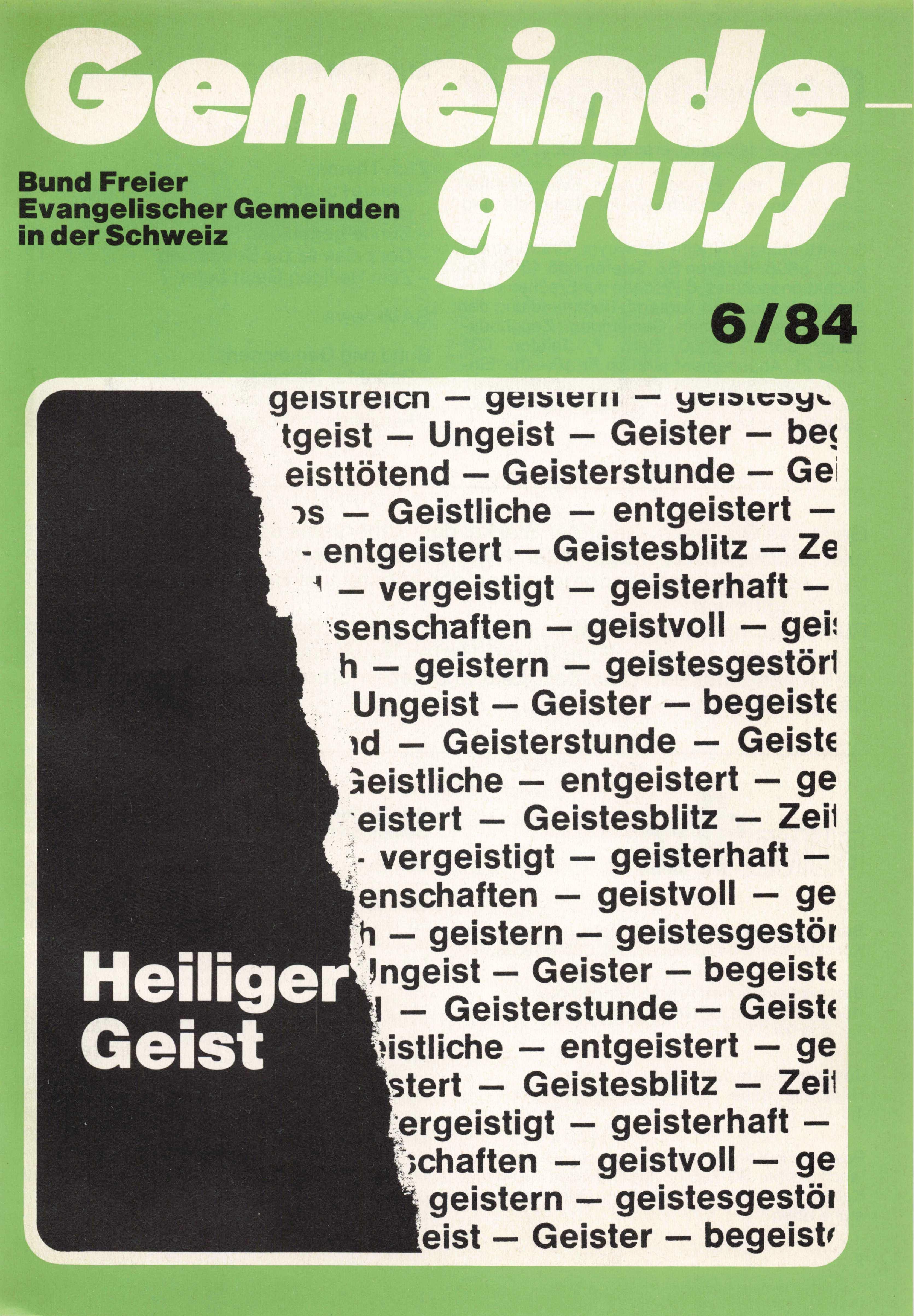 «heisse Eisen» fasst man nicht sehr gerne an, weil man sich dabei die Finger verbrennen könnte. Auch in der Lehre über den Heiligen Geist gibt es Dinge, die wir oft als «heisse Eisen» bezeichnen: das Beten zum Heiligen Geist, Geistestaufe, Sünde gegen den Heiligen Geist, Geistesgaben ... Wenn Gott schon im Alten Testament sagt: «Es soll nicht durch Heer oder Kraft geschehen, sondern durch meinen Geist», und wenn über dem Jahr 1984 die Jahreslosung aus 2. Timotheus 1, 7 geschrieben steht: «Gott hat uns nicht den Geist der Verzagtheit gegeben, sondern den Geist der Kraft und der Liebe und der Besonnenheit», dann wird daraus deutlich, dass die Frage um den Heiligen Geist keine nebensächliche ist.
