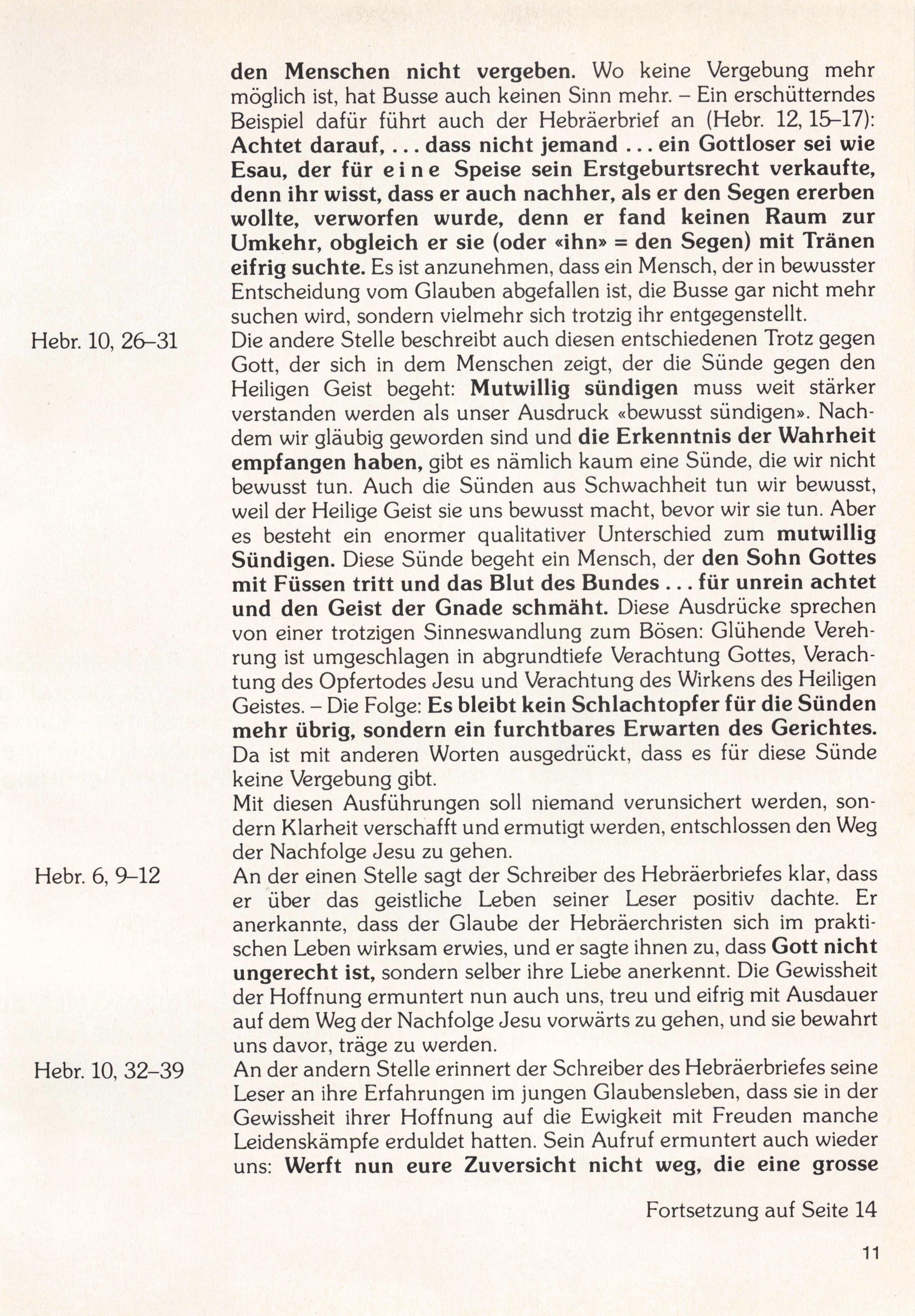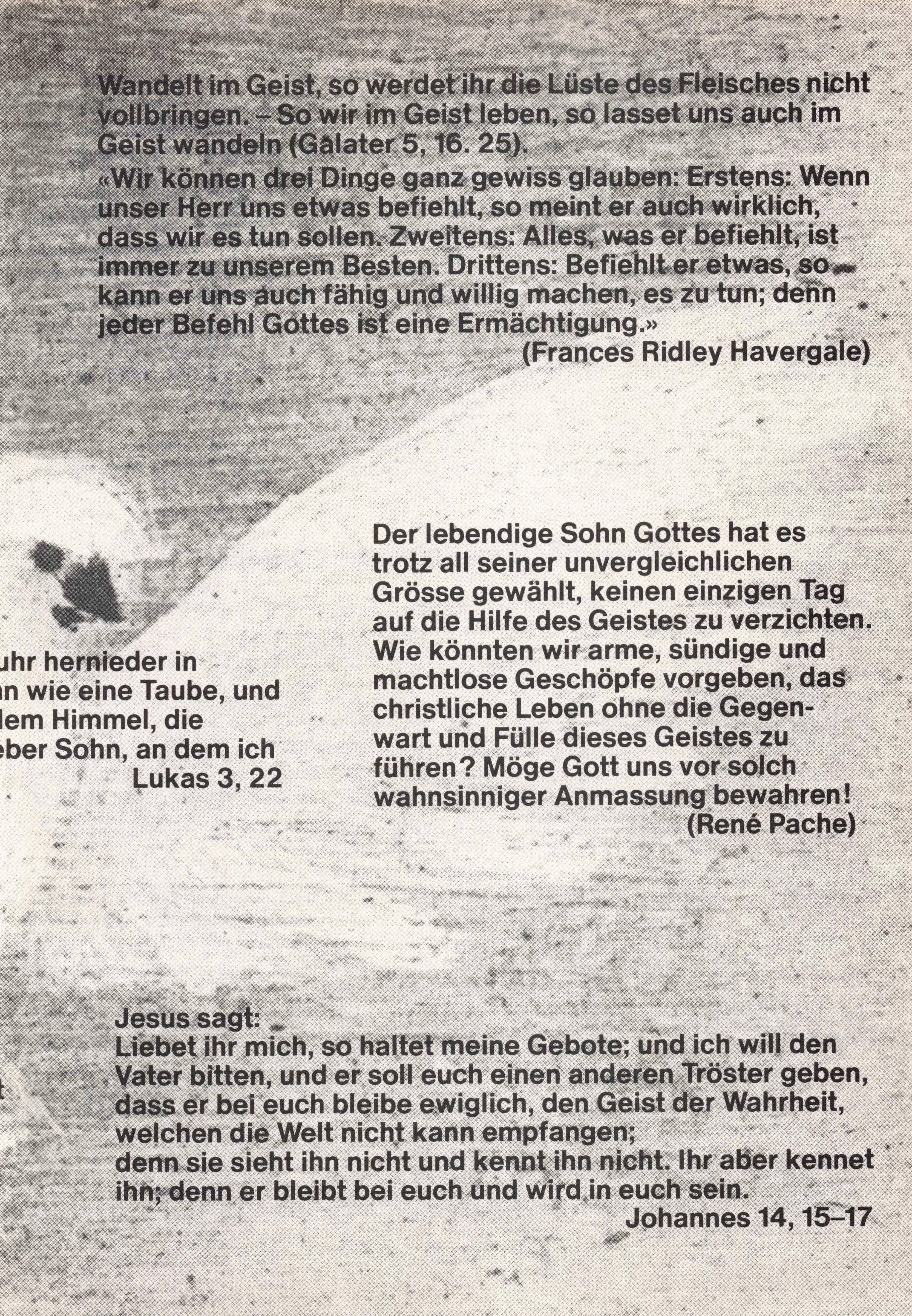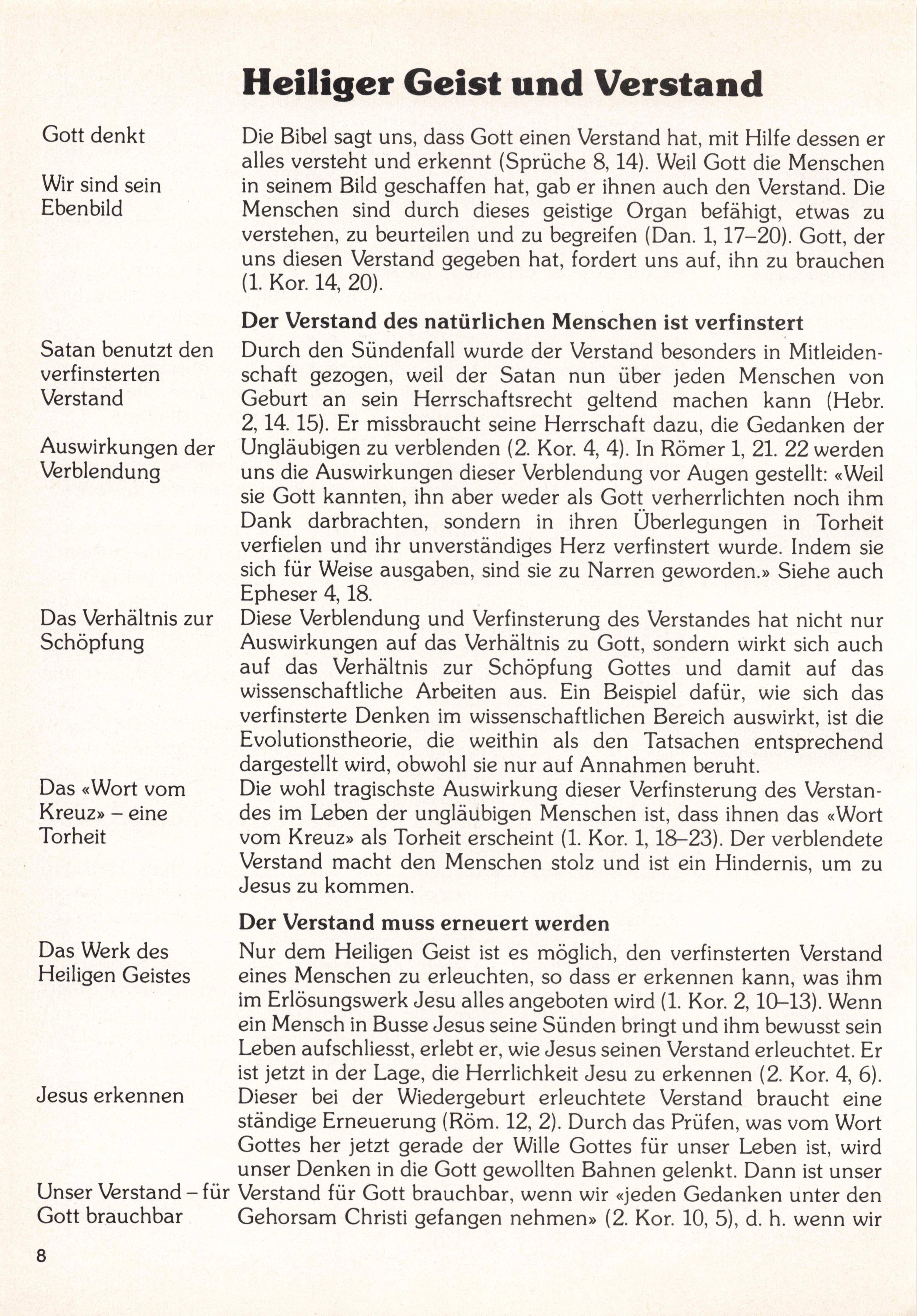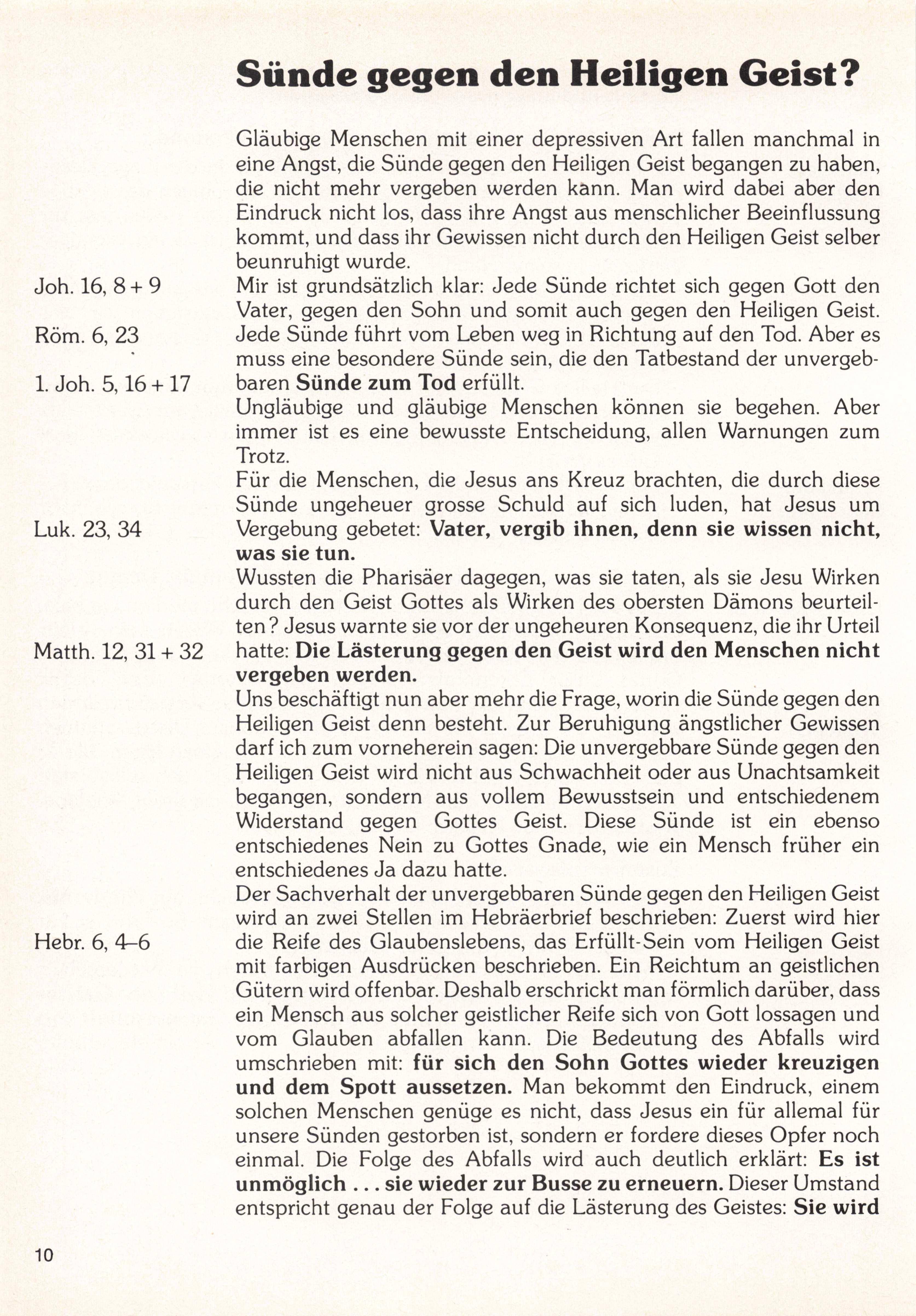 «heisse Eisen» fasst man nicht sehr gerne an, weil man sich dabei die Finger verbrennen könnte. Auch in der Lehre über den Heiligen Geist gibt es Dinge, die wir oft als «heisse Eisen» bezeichnen: das Beten zum Heiligen Geist, Geistestaufe, Sünde gegen den Heiligen Geist, Geistesgaben ... Wenn Gott schon im Alten Testament sagt: «Es soll nicht durch Heer oder Kraft geschehen, sondern durch meinen Geist», und wenn über dem Jahr 1984 die Jahreslosung aus 2. Timotheus 1, 7 geschrieben steht: «Gott hat uns nicht den Geist der Verzagtheit gegeben, sondern den Geist der Kraft und der Liebe und der Besonnenheit», dann wird daraus deutlich, dass die Frage um den Heiligen Geist keine nebensächliche ist.