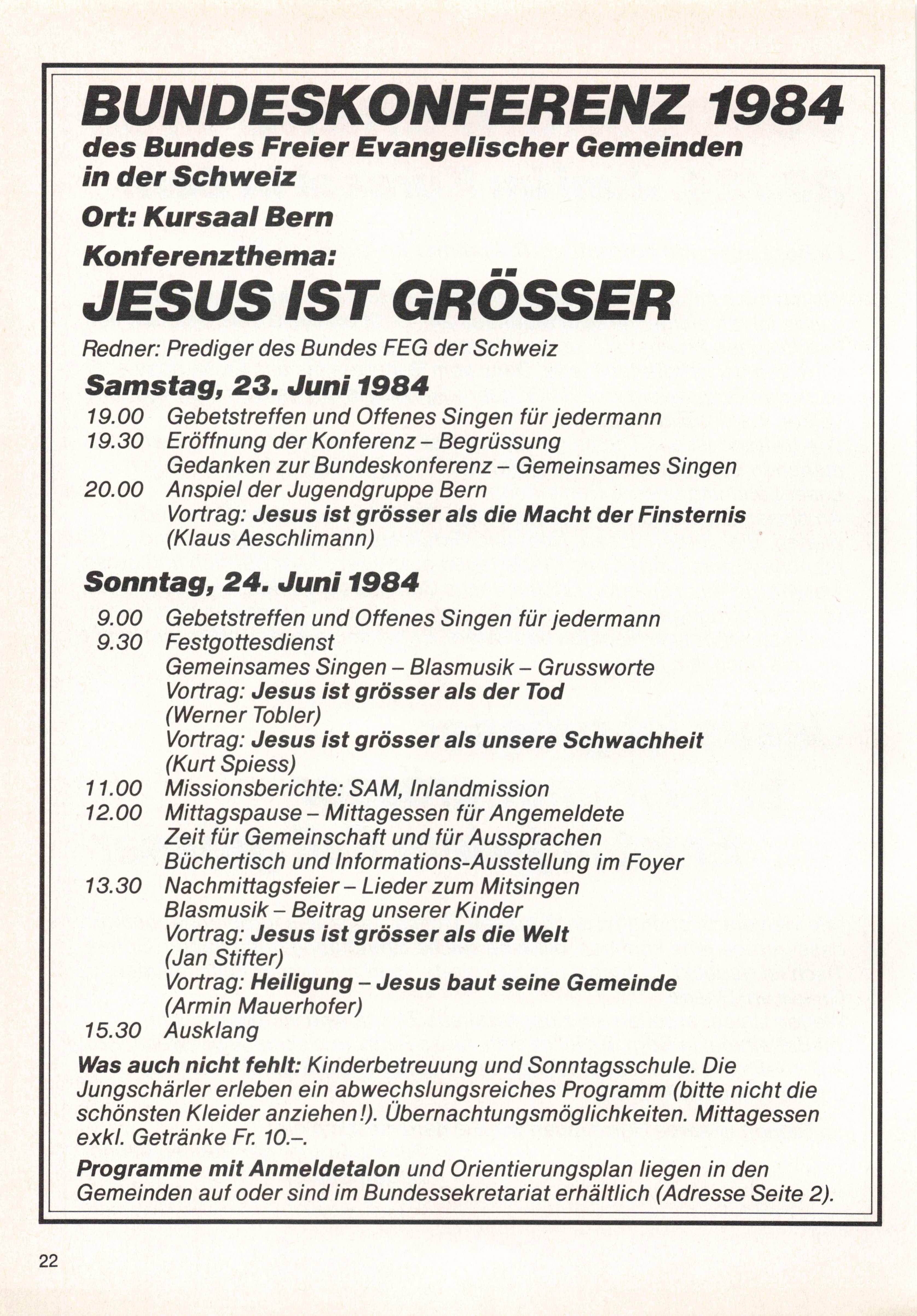 Wegen Umbauarbeiten am Kongresshaus Zürich sind wir dieses Jahr wieder einmal In Bern. Es lohnt sich, diese Reise in diesem Jahr zweimal zu unternehmen: Am 17. Juni für den Christustag und am 23.124. Juni für unsere Bundeskonferenz.