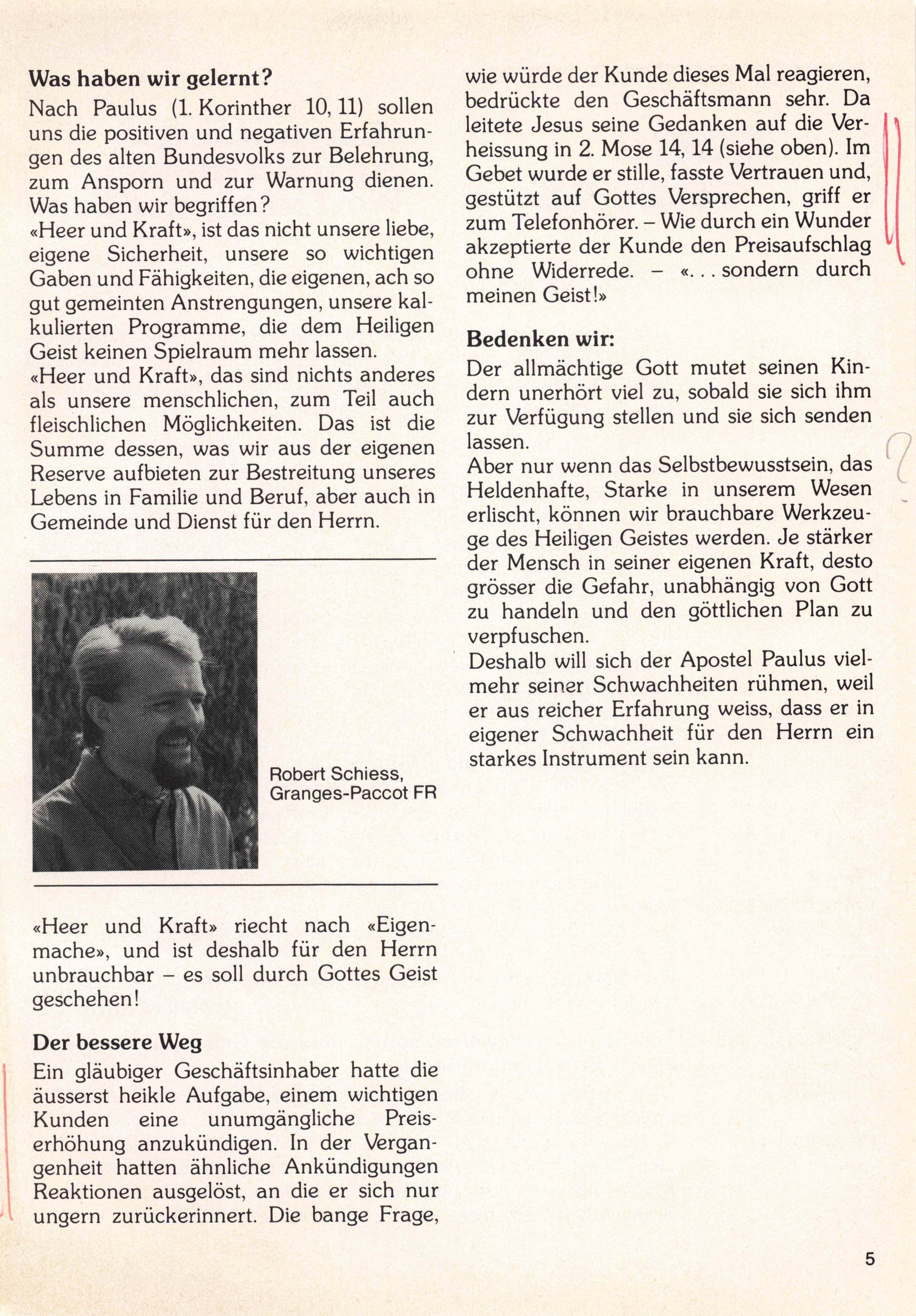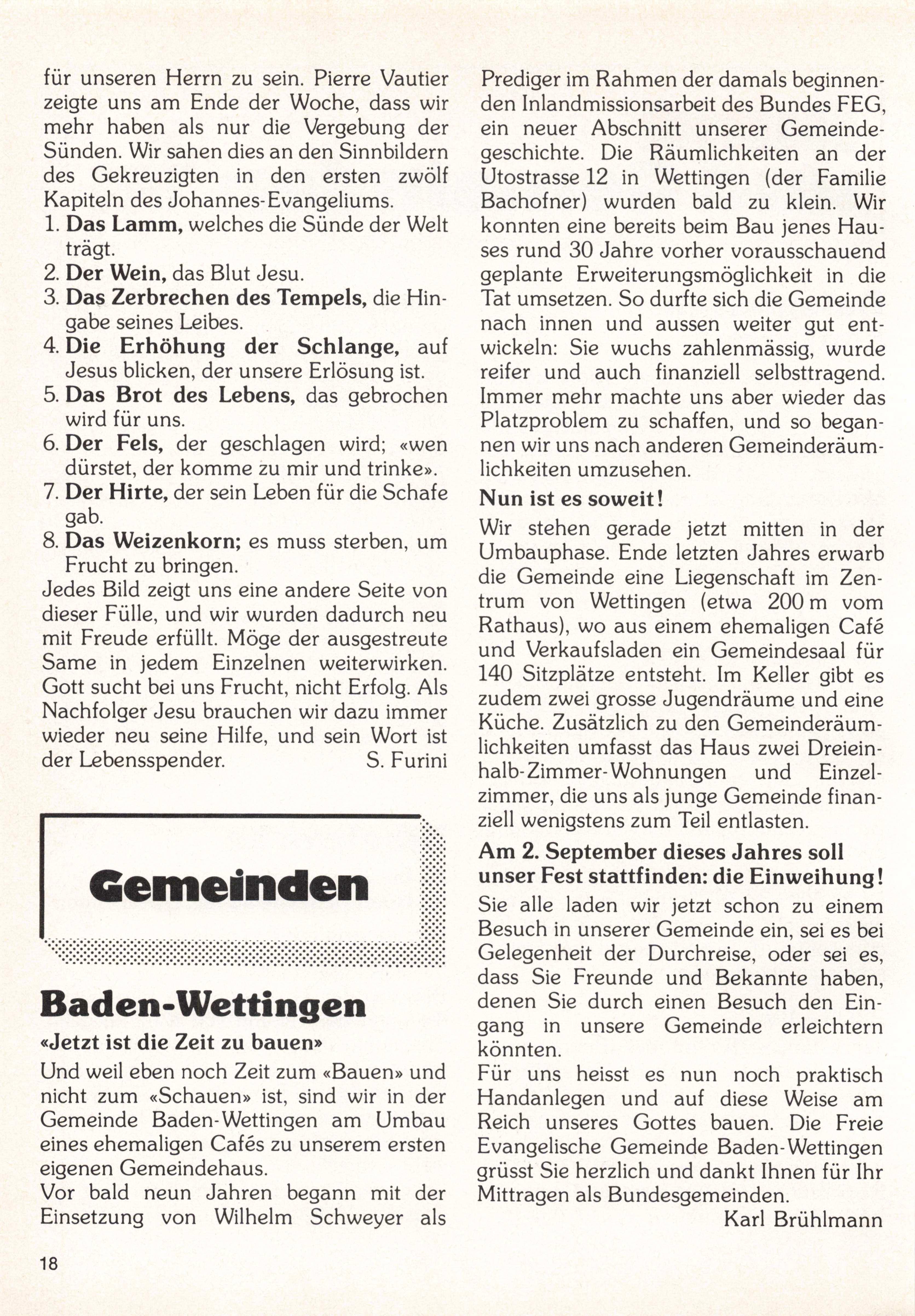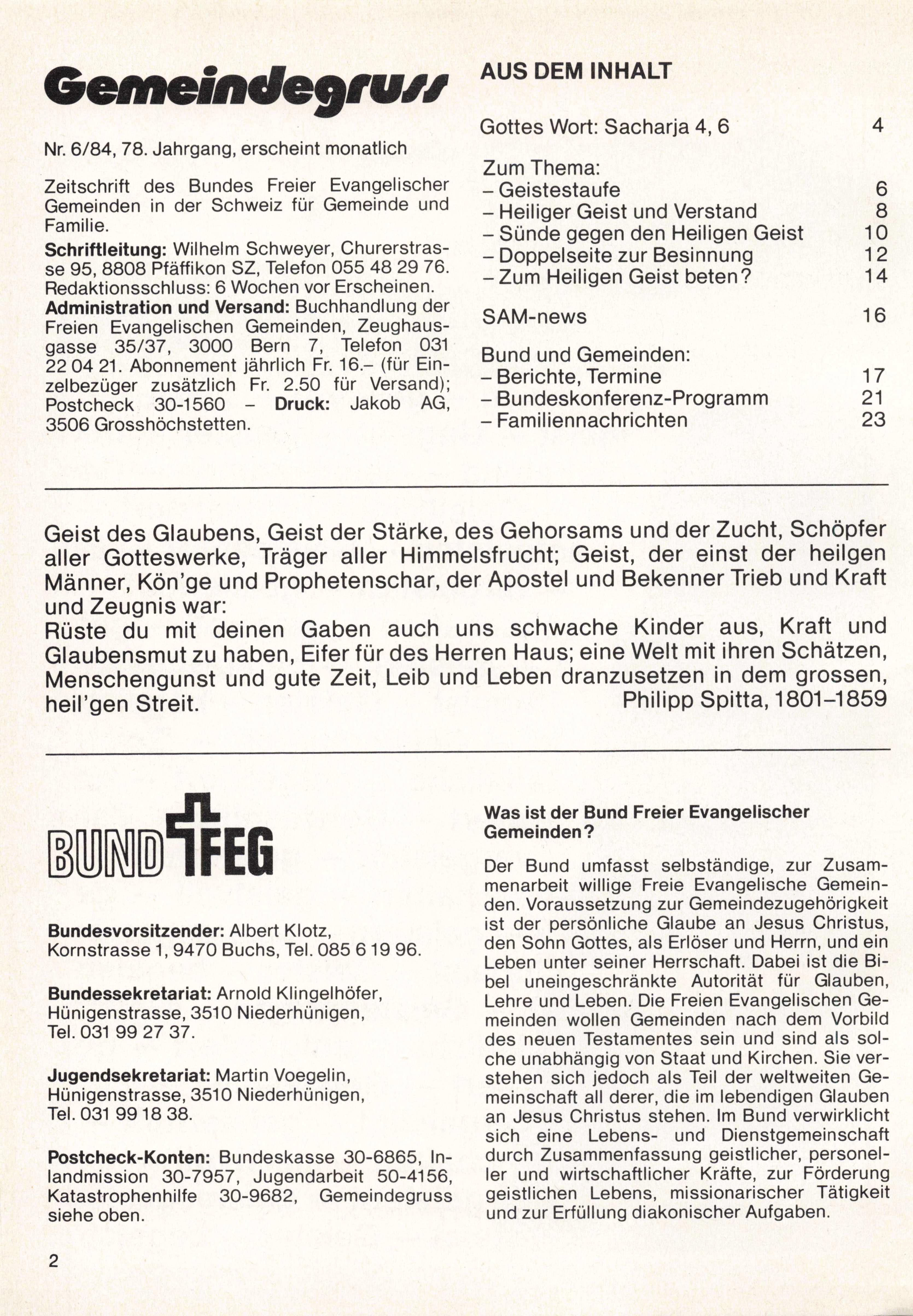 Schriftleitung: Wilhelm Schweyer, Churerstrasse 95, 8808 Pfäffikon SZ, Telefon 055 48 29 76. Redaktionsschluss: 6 Wochen vor Erscheinen. Administration und Versand: Buchhandlung der Freien Evangelischen Gemeinden, Zeughaus gasse 35/37, 3000 Bern 7, Telefon 031 22 04 21. Abonnement jährlich Fr. 16.- (für Ein zelbezüger zusätzlich Fr. 2.50 für Versand); Postcheck 30-15603506 Grosshöchstetten.