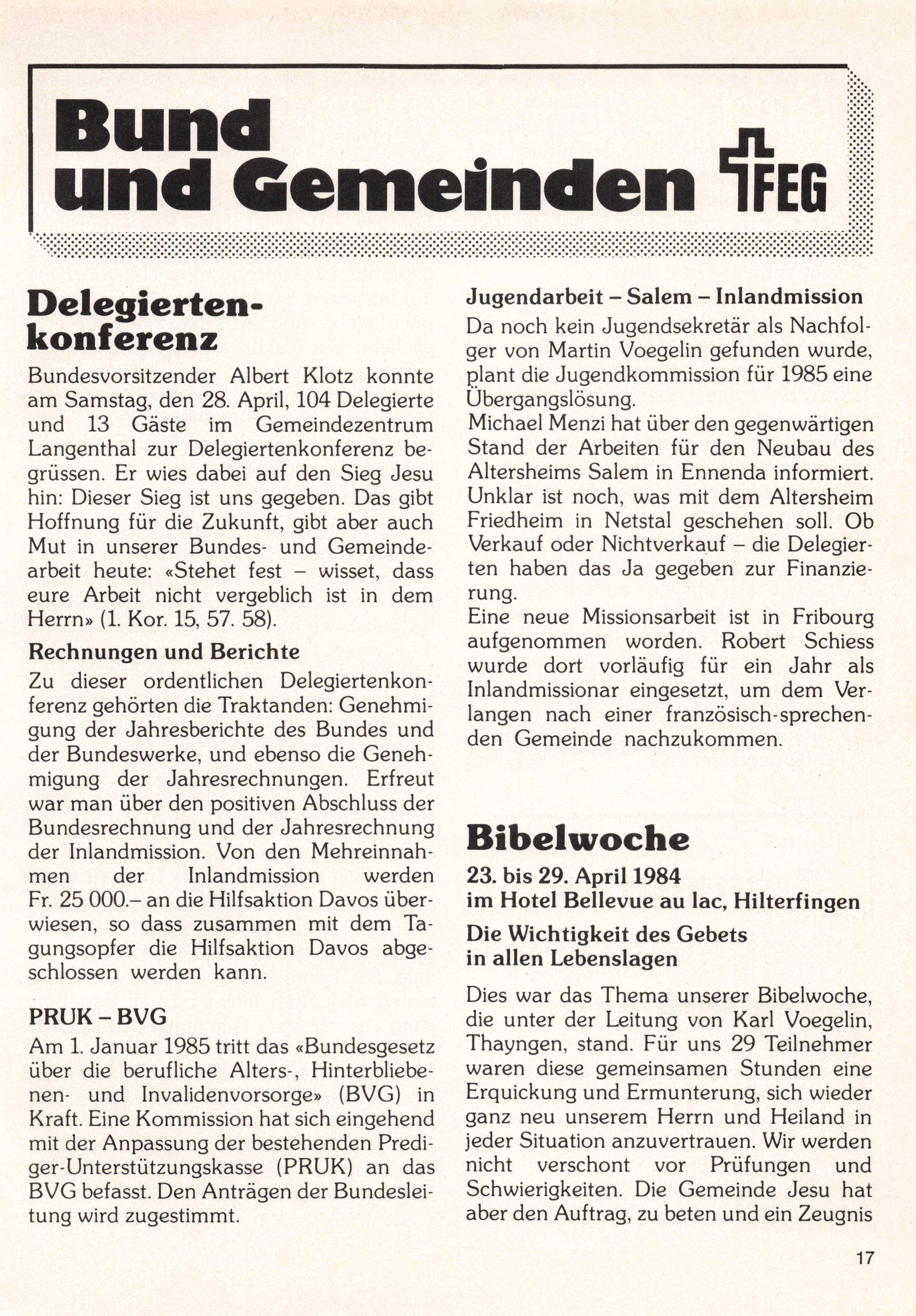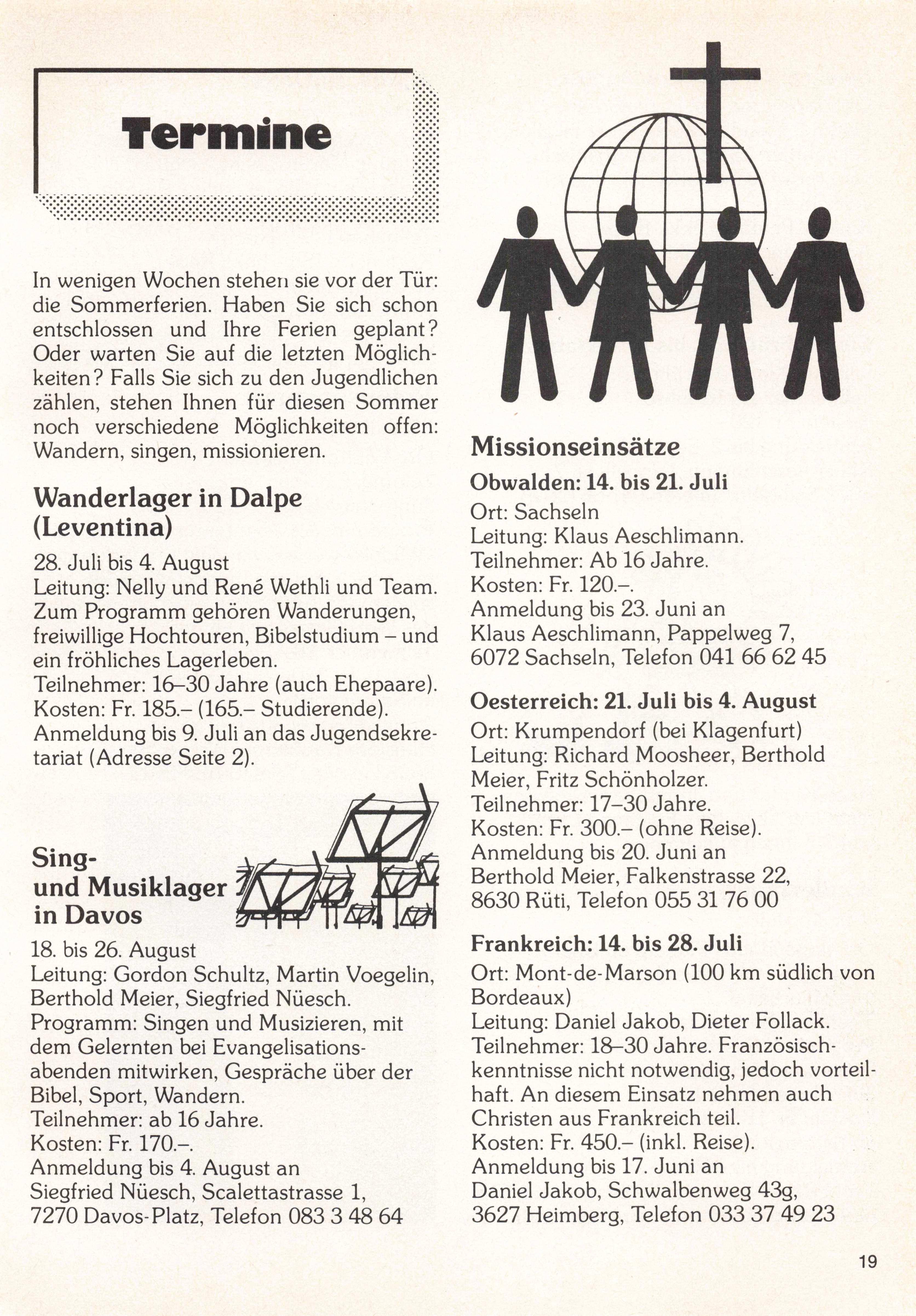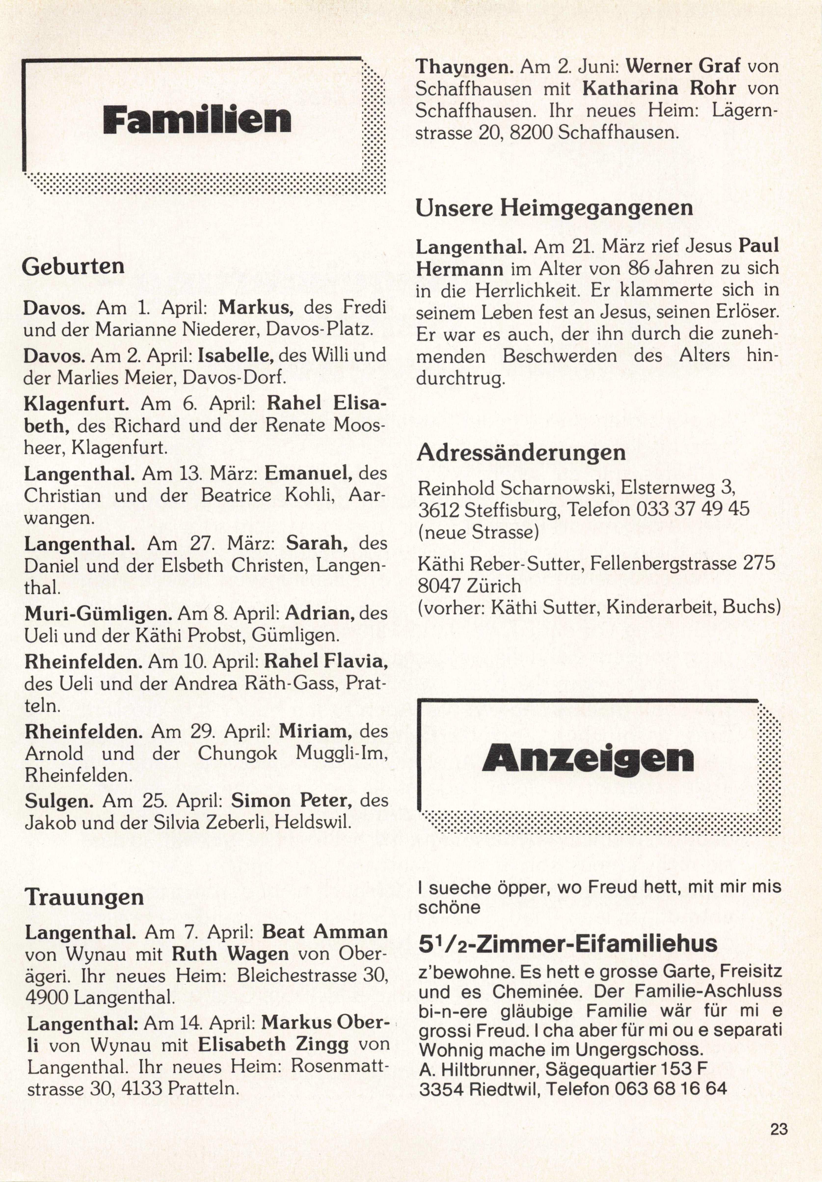 Schriftleitung: Wilhelm Schweyer, Churerstrasse 95, 8808 Pfäffikon SZ, Telefon 055 48 29 76. Redaktionsschluss: 6 Wochen vor Erscheinen. Administration und Versand: Buchhandlung der Freien Evangelischen Gemeinden, Zeughaus gasse 35/37, 3000 Bern 7, Telefon 031 22 04 21. Abonnement jährlich Fr. 16.- (für Ein zelbezüger zusätzlich Fr. 2.50 für Versand); Postcheck 30-15603506 Grosshöchstetten.