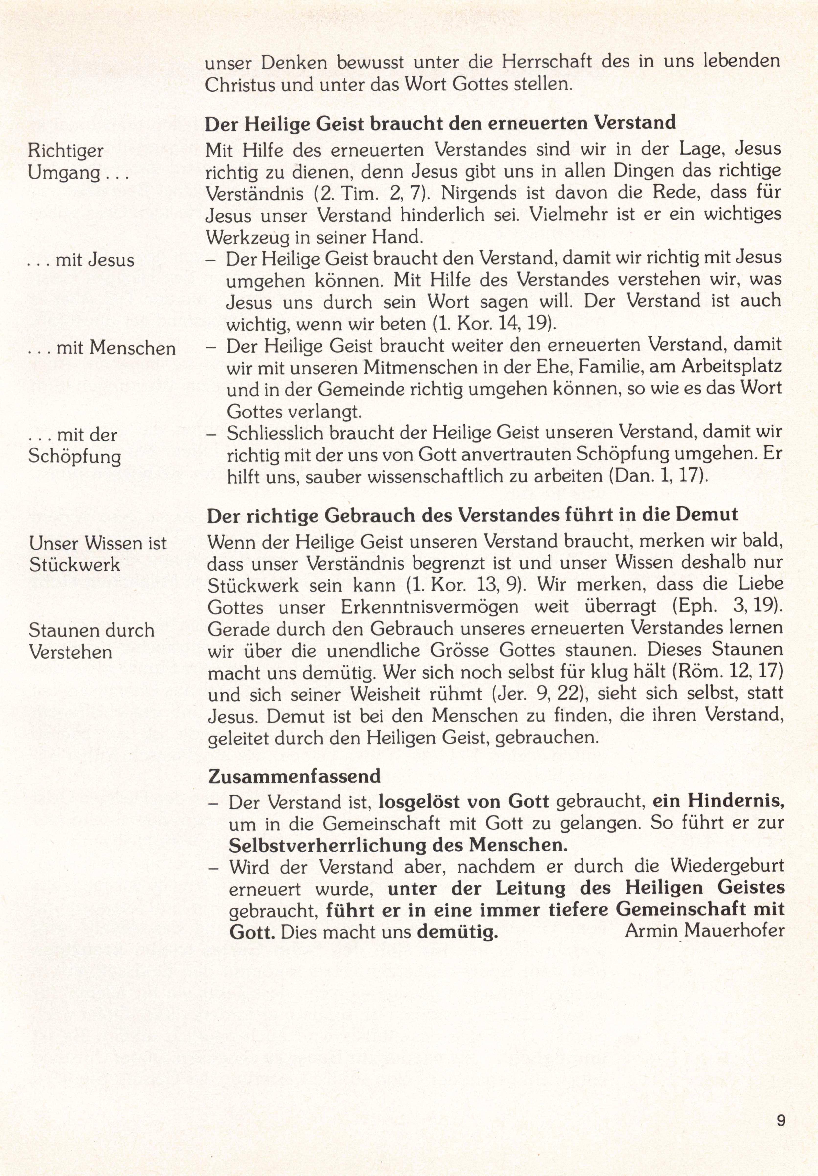 Nur dem Heiligen Geist ist es möglich, den verfinsterten Verstand eines Menschen zu erleuchten, so dass er erkennen kann, was ihm im Erlösungswerk Jesu alles angeboten wird (1. Kor. 2,10-13). Wenn ein Mensch in Busse Jesus seine Sünden bringt und ihm bewusst sein Leben aufschliesst, erlebt er, wie Jesus seinen Verstand erleuchtet. Er ist jetzt in der Lage, die Herrlichkeit Jesu zu erkennen (2. Kor. 4, 6). Dieser bei der Wiedergeburt erleuchtete Verstand braucht eine ständige Erneuerung (Röm. 12, 2). Durch das Prüfen, was vom Wort Gottes her jetzt gerade der Wille Gottes für unser Leben ist, wird unser Denken in die Gott gewollten Bahnen gelenkt. Dann ist unser Unser Verstand - für Verstand für Gott brauchbar, wenn wir «jeden Gedanken unter den Gott brauchbar