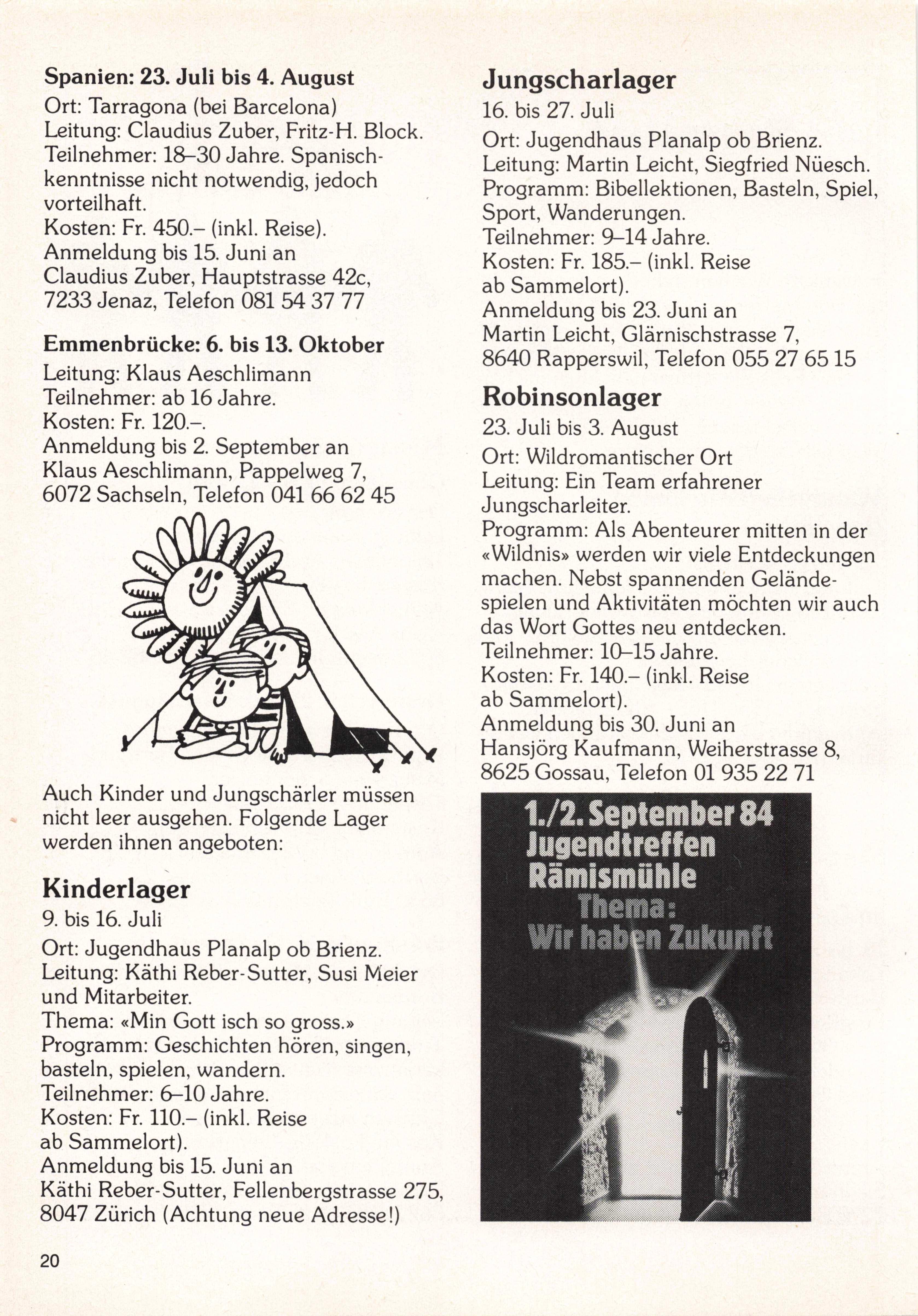 Was auch nicht fehlt: Kinderbetreuung und Sonntagsschule. Die Jungschärler erleben ein abwechslungsreiches Programm (bitte nicht die schönsten Kleider anziehenl). Übernachtungsmöglichkeiten. Mittagessen exkl. Getränke F.r 10.-.
