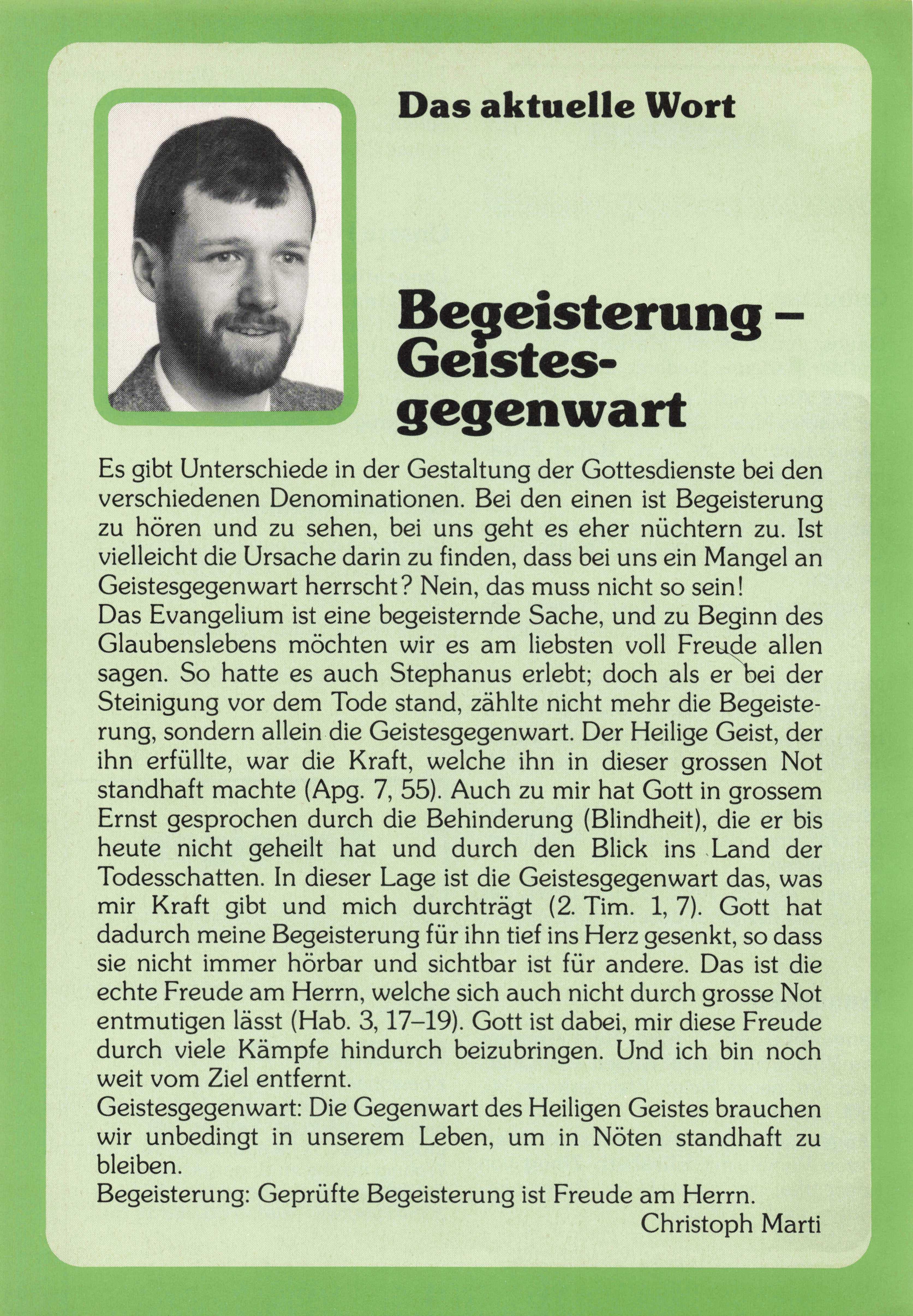 Es gibt Unterschiede in der Gestaltung der Gottesdienste bei den verschiedenen Denominationen. Bei den einen ist Begeisterung zu hören und zu sehen, bei uns geht es eher nüchtern zu. Ist vielleicht die Ursache darin zu finden, dass bei uns ein Mangel an Geistesgegenwart herrscht? Nein, das muss nicht so sein! Das Evangelium ist eine begeisternde Sache, und zu Beginn des Glaubenslebens möchten wir es am liebsten voll Freude allen sagen. So hatte es auch Stephanus erlebt; doch als er oei der Steinigung vor dem Tode stand, zählte nicht mehr die Begeiste rung, sondern allein die Geistesgegenwart. Der Heilige Geist, der ihn erfüllte, war die Kraft, welche ihn in dieser grossen Not standhaft machte (Apg. 7, 55). Auch zu mir hat Gott in grossem Ernst gesprochen durch die Behinderung (Blindheit), die er bis heute nicht geheilt hat und durch den Blick ins Land der Todesschatten. In dieser Lage ist die Geistesgegenwart das, was mir Kraft gibt und mich durchträgt (2. Tim. 1, 7). Gott hat dadurch meine Begeisterung für ihn tief ins Herz gesenkt, so dass sie nicht immer hörbar und sichtbar ist für andere. Das ist die echte Freude am Herrn, welche sich auch nicht durch grosse Not entmutigen lässt (Hab. 3,17-19). Gott ist dabei, mir diese Freude durch viele Kämpfe hindurch beizubringen. Und ich bin noch weit vom Ziel entfernt.