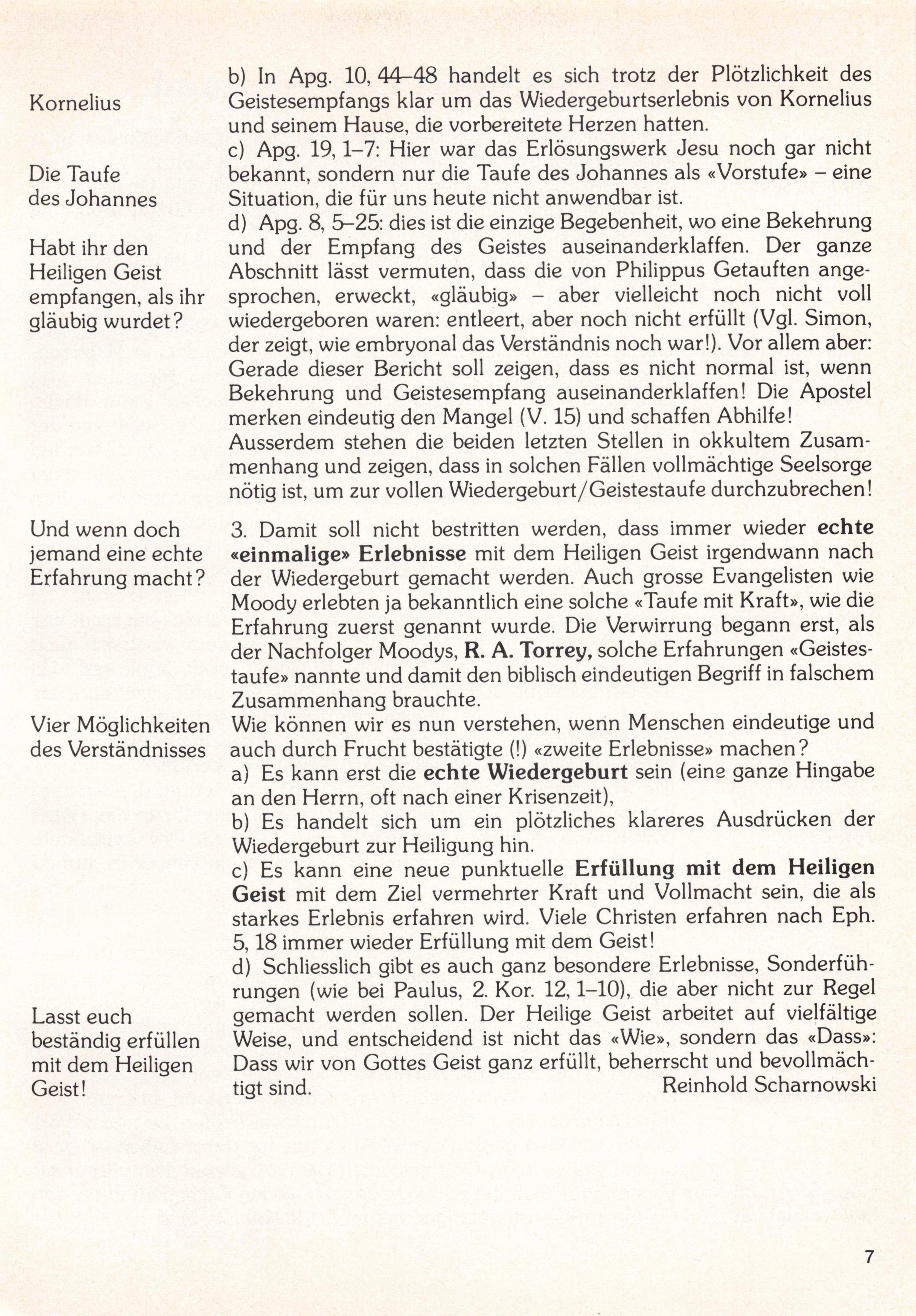 d) Schliesslich gibt es auch ganz besondere Erlebnisse, Sonderfüh rungen (wie bei Paulus, 2. Kor. 12,1-10), die aber nicht zur Regel gemacht werden sollen. Der Heilige Geist arbeitet auf vielfältige Weise, und entscheidend ist nicht das «Wie», sondern das «Dass»: Dass wir von Gottes Geist ganz erfüllt, beherrscht und bevollmächReinhold Scharnowski