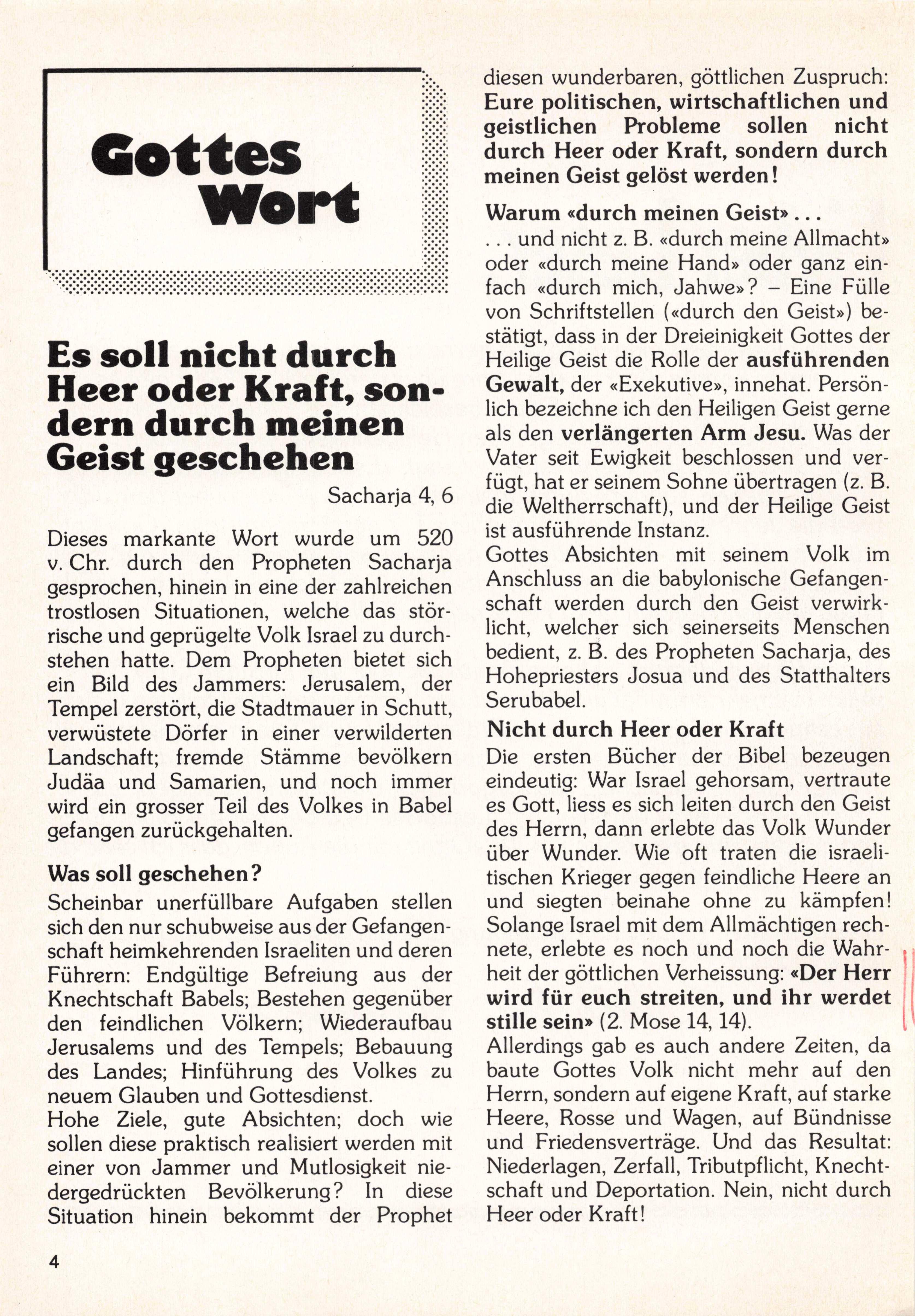 Dieses markante Wort wurde um 520 V. Chr. durch den Propheten Sacharja gesprochen, hinein in eine der zahlreichen trostlosen Situationen, welche das stör rische und geprügelte Volk Israel zu durch stehen hatte. Dem Propheten bietet sich ein Bild des Jammers: Jerusalem, der Tempel zerstört, die Stadtmauer in Schutt, verwüstete Dörfer in einer verwilderten Landschaft; fremde Stämme bevölkern Judäa und Samarien, und noch immer wird ein grosser Teil des Volkes in Babel gefangen zurückgehalten.