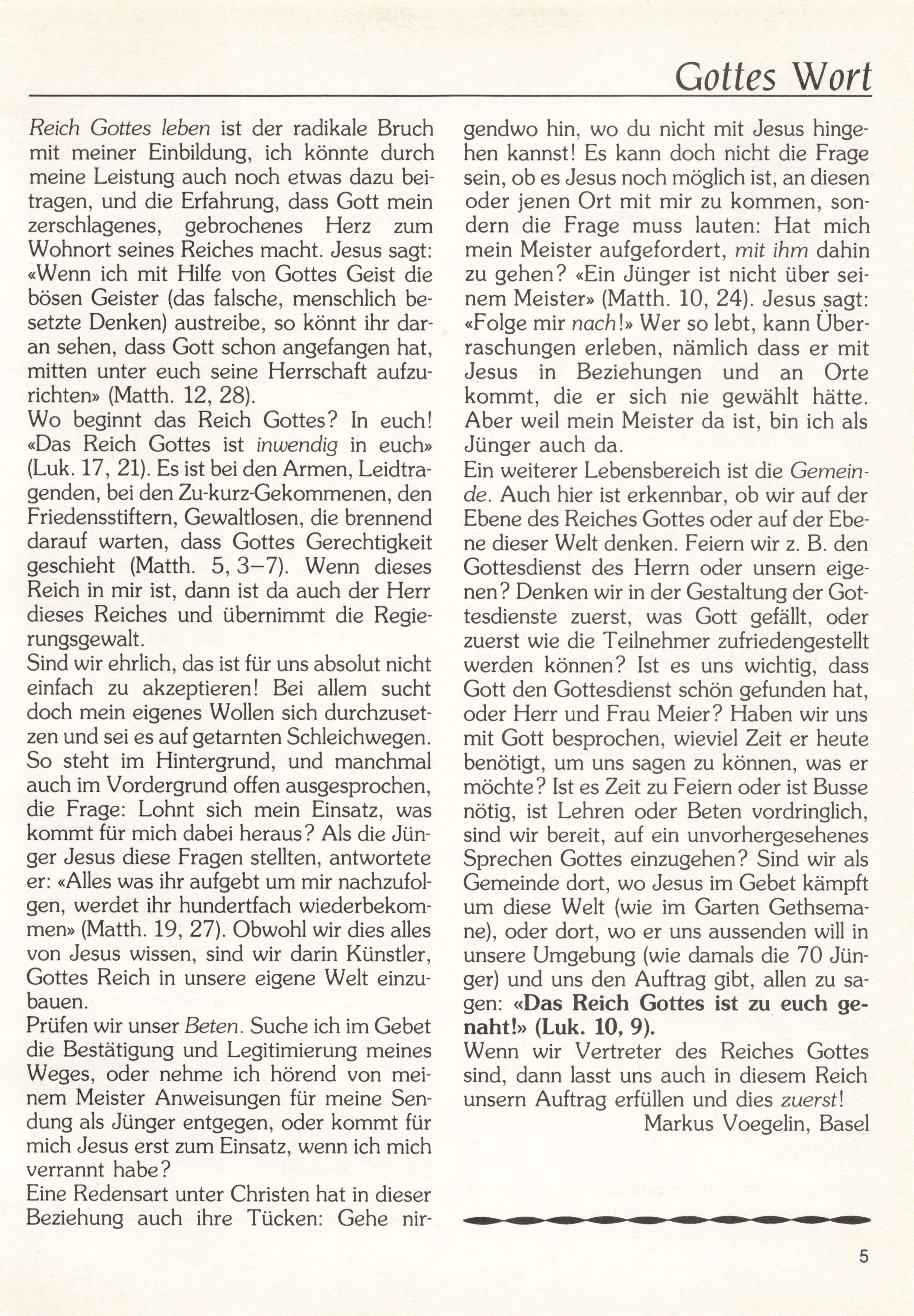 Ein weiterer Lebensbereich ist die Gemein de. Auch hier ist erkennbar, ob wir auf der Ebene des Reiches Gottes oder auf der Ebe ne dieser Welt denken. Feiern wir z. B. den Gottesdienst des Herrn oder unsern eige nen? Denken wir in der Gestaltung der Got tesdienste zuerst, was Gott gefällt, oder zuerst wie die Teilnehmer zufriedengestellt werden können? Ist es uns wichtig, dass Gott den Gottesdienst schön gefunden hat, oder Herr und Frau Meier? Haben wir uns mit Gott besprochen, wieviel Zeit er heute benötigt, um uns sagen zu können, was er möchte? Ist es Zeit zu Feiern oder ist Busse nötig, ist Lehren oder Beten vordringlich, sind wir bereit, auf ein unvorhergesehenes Sprechen Gottes einzugehen? Sind wir als Gemeinde dort, wo Jesus im Gebet kämpft um diese Welt (wie im Garten Gethsema ne), oder dort, wo er uns aussenden will in unsere Umgebung (wie damals die 70 Jün ger) und uns den Auftrag gibt, allen zu sa gen: «Das Reich Gottes ist zu euch ge naht!» (Luk. 10, 9).