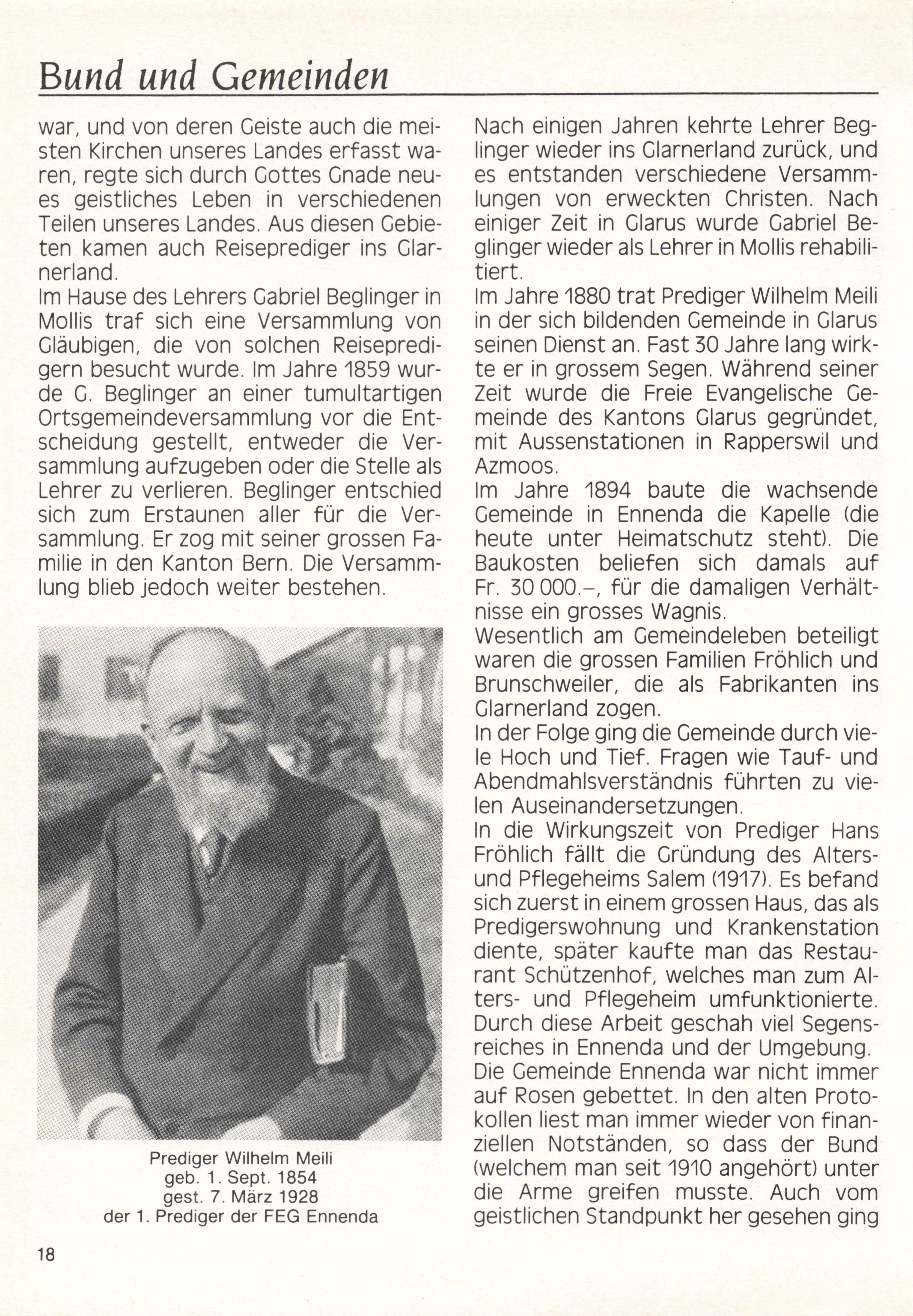 Im Jahre 1880 trat Prediger Wilhelm Meill In der sich bildenden Gemeinde in Glarus seinen Dienst an. Fast 30 Jahre lang wirk te er in grossem Segen. Während seiner Zeit wurde die Freie Evangelische Ge meinde des Kantons Glarus gegründet, mit Aussenstationen In RapperswII und Azmoos.