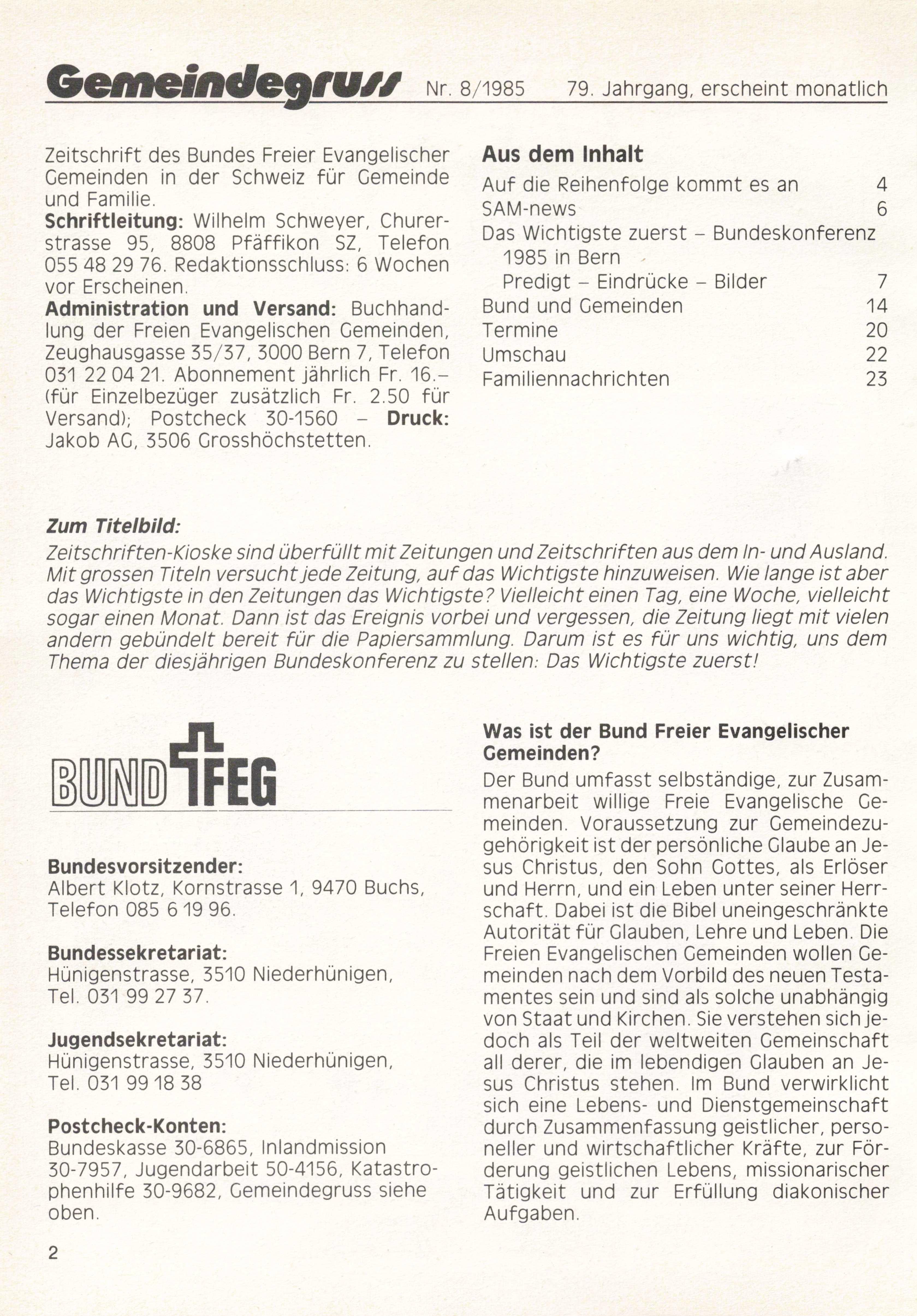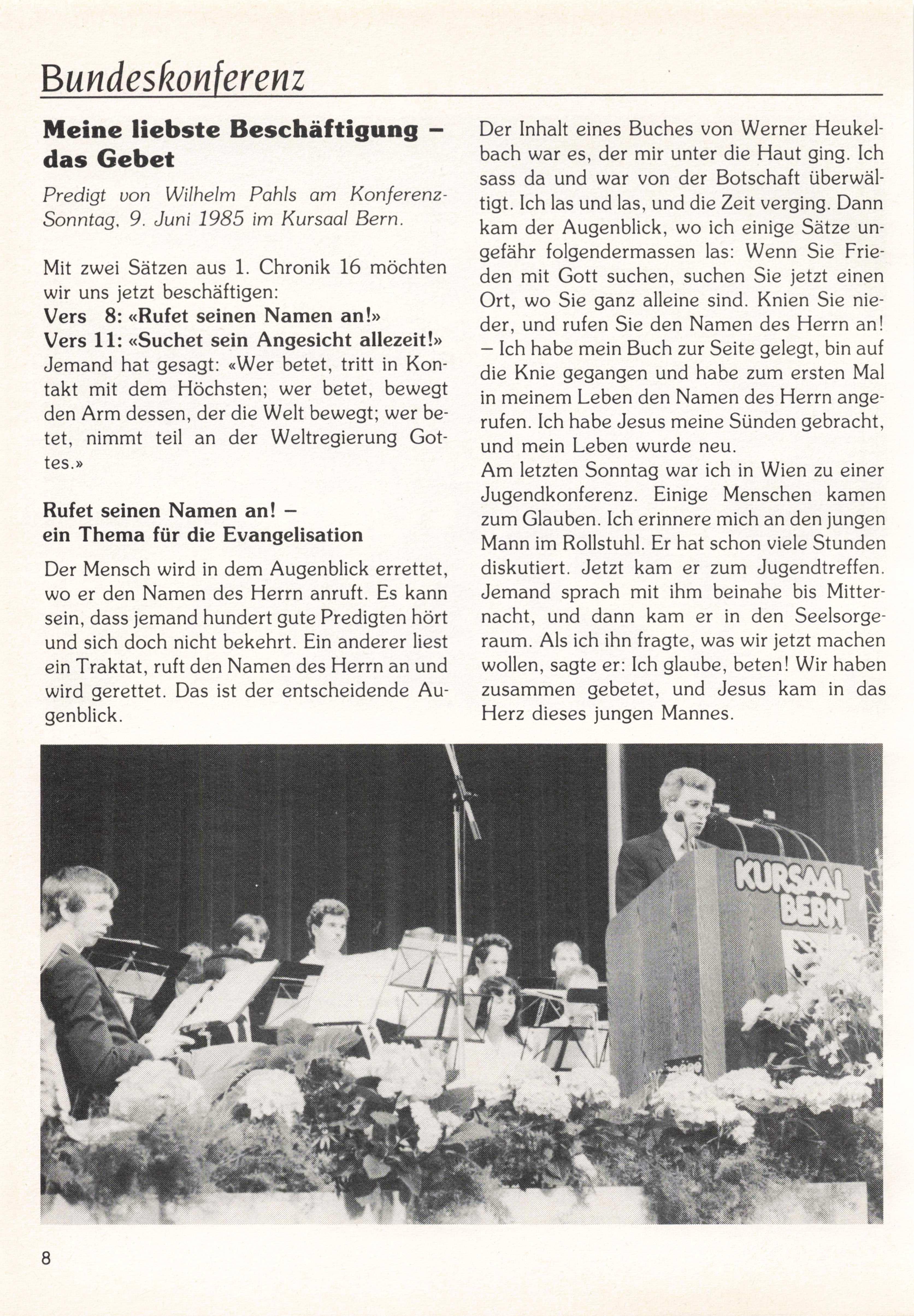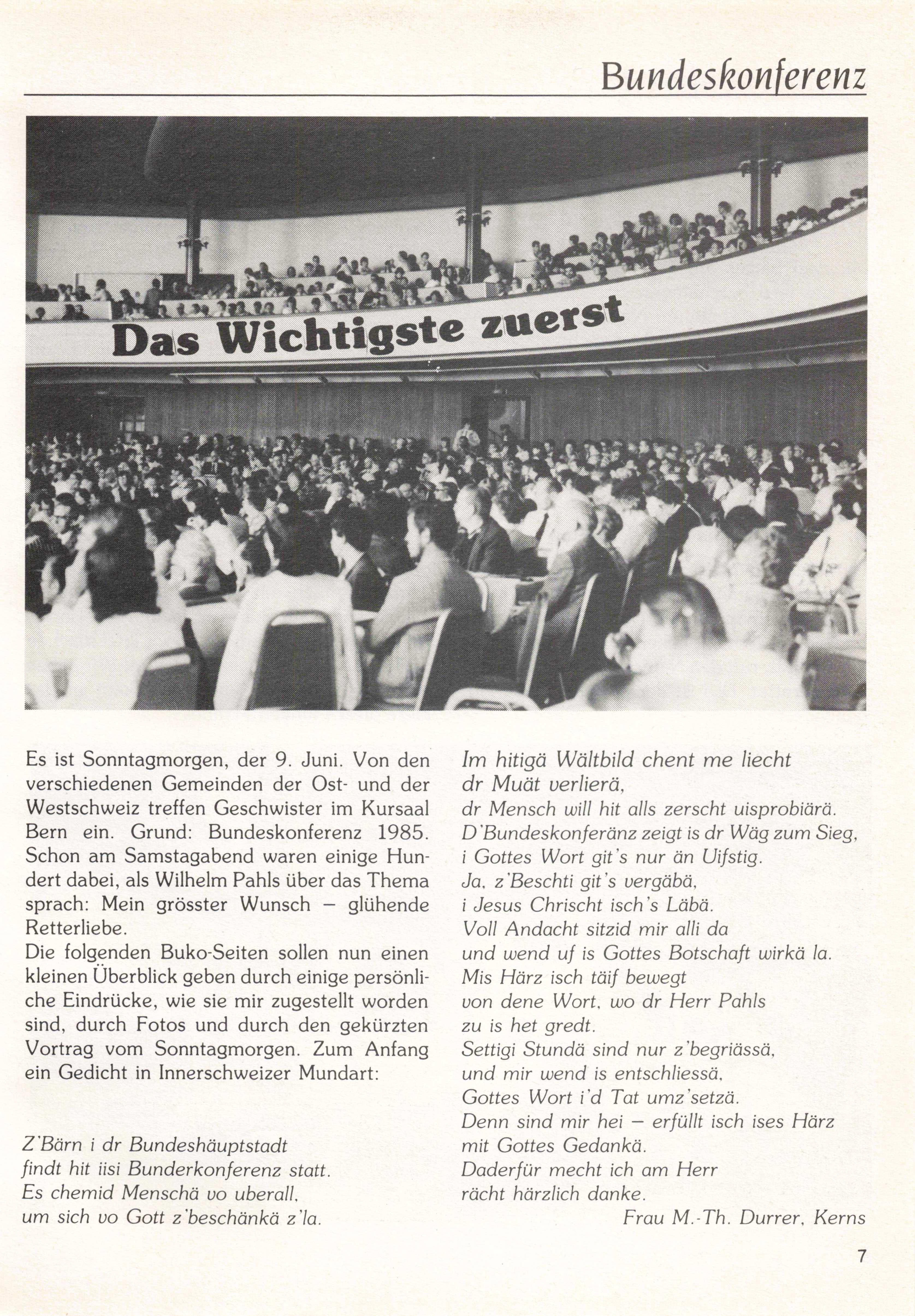 Das Wichtigste zuerst - Bundeskonferenz 1985 in Bern Predigt - Eindrücke - Bilder Bund und Gemeinden Termine Umschau