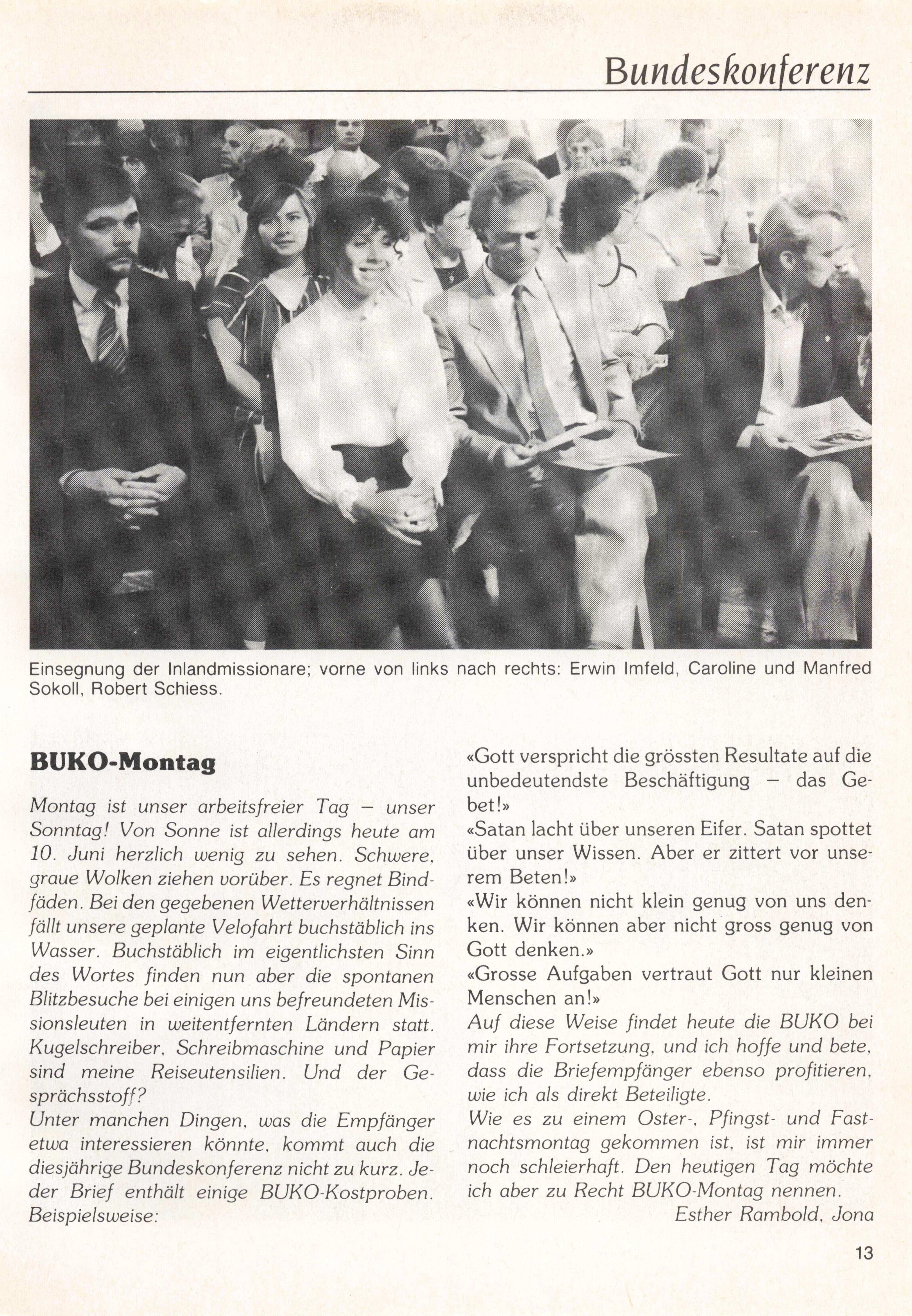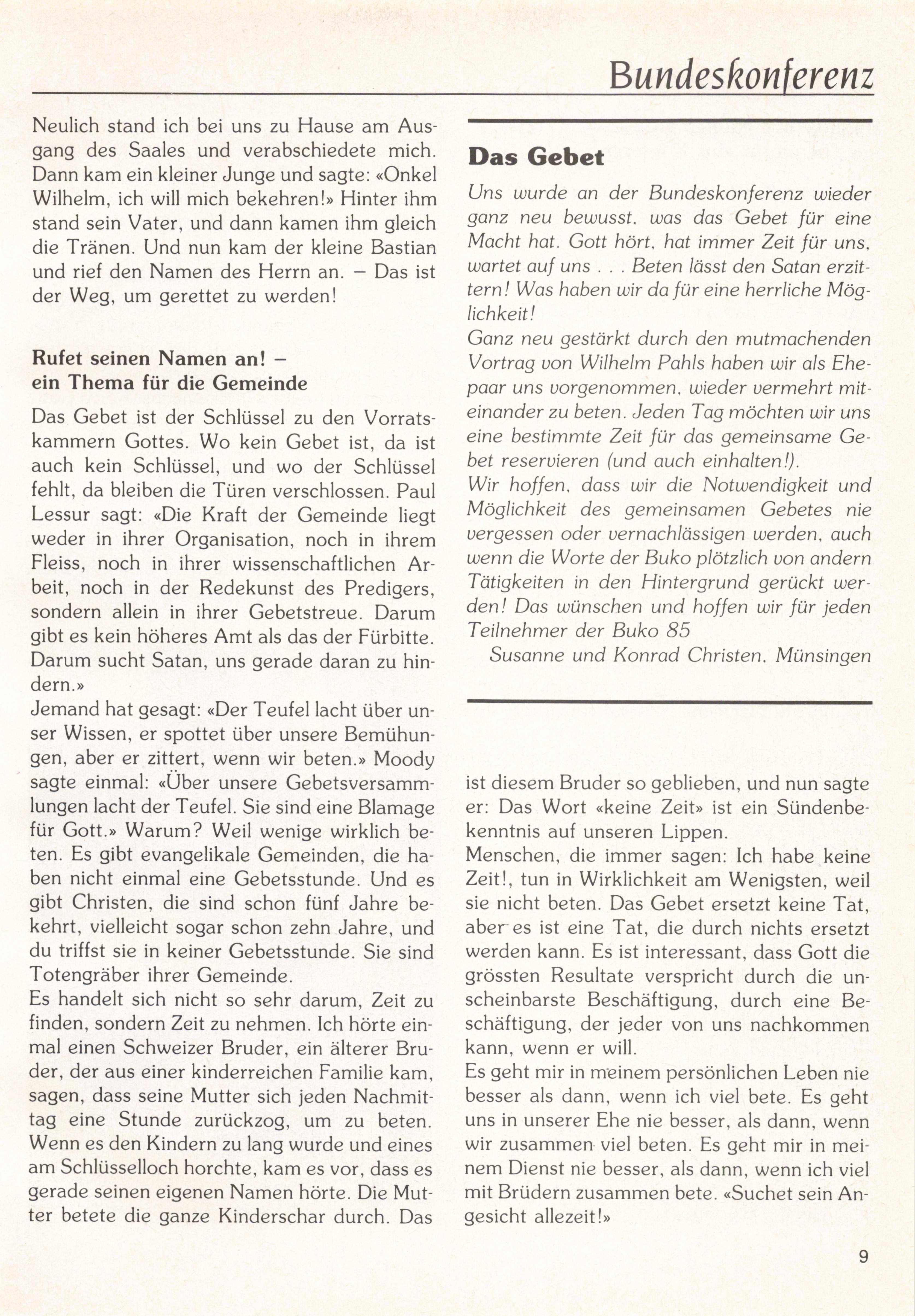 Wir hoffen, dass wir die Notwendigkeit und Möglichkeit des gemeinsamen Gebetes nie vergessen oder vernachlässigen werden, auch wenn die Worte der Buko plötzlich von andern Tätigkeiten in den Hintergrund gerückt wer den! Das wünschen und hoffen wir für jeden Teilnehmer der Buko 85 Susanne und Konrad Christen. Münsingen