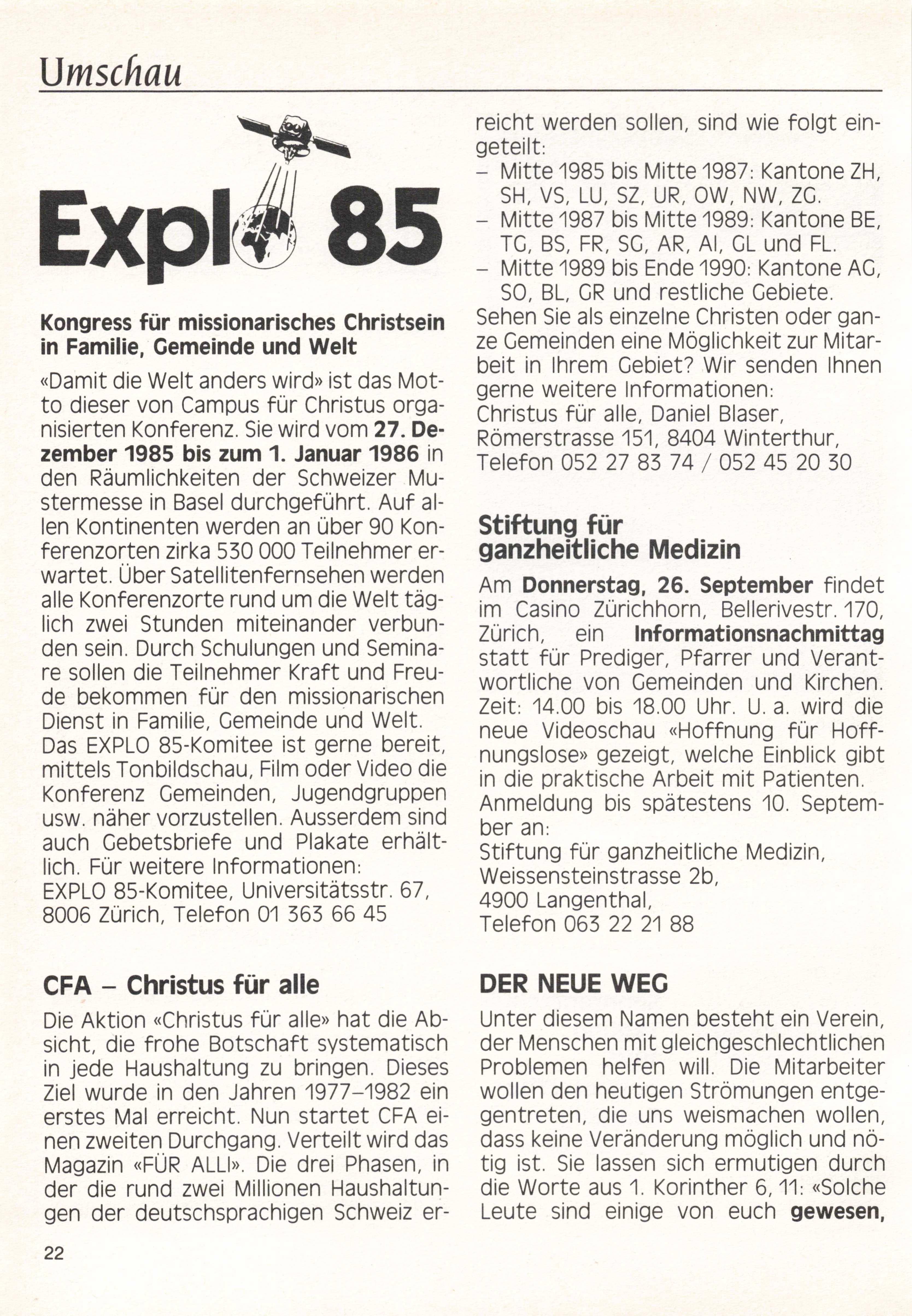 «Damit die Welt anders wird» ist das Mot to dieser von Campus für Christus orga nisierten Konferenz. Sie wird vom 27. De zember 1985 bis zum 1. Januar 1986 in den Räumlichkeiten der Schweizer Mu stermesse in Basel durchgeführt. Auf al len Kontinenten werden an über 90 Kon ferenzorten zirka 530 000 Teilnehmer er wartet, Über Satellitenfernsehen werden alle Konferenzorte rund um die Welt täg lich zwei Stunden miteinander verbun den sein. Durch Schulungen und Semina re sollen die Teilnehmer Kraft und Freu de bekommen für den missionarischen Dienst in Familie, Gemeinde und Welt. Das EXPLO 85-Komitee ist gerne bereit, mittels Tonbildschau, Film oder Video die Konferenz Gemeinden, Jugendgruppen usw. näher vorzustellen. Ausserdem sind auch Cebetsbriefe und Plakate erhält lich. Für weitere Informationen: EXPLO 85-Komitee, Universitätsstr. 67, 8006 Zürich, Telefon 01 363 66 45