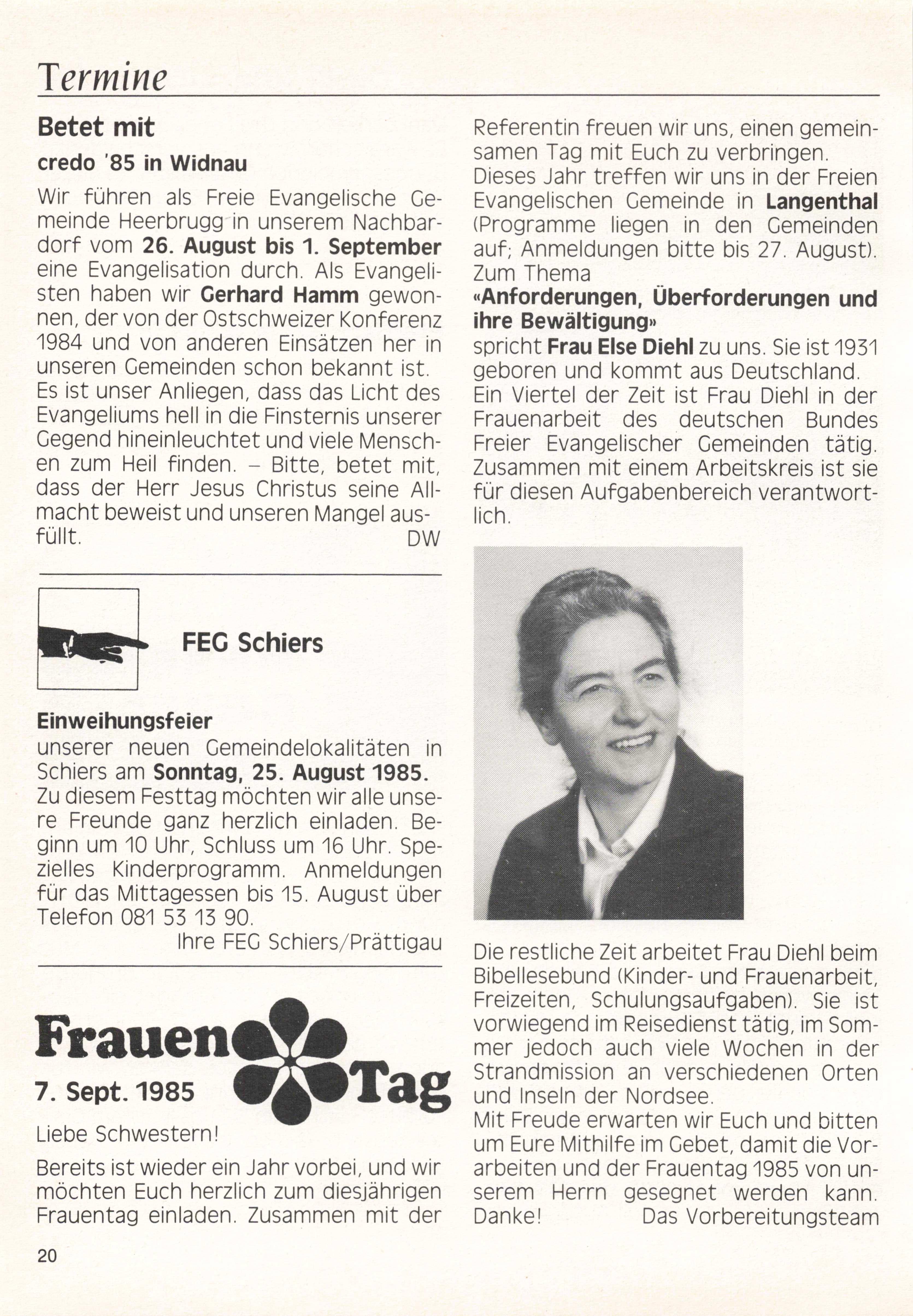 Die restliche Zeit arbeitet Frau Diehl beim Bibellesebund (Kinder- und Frauenarbeit, Freizeiten, Schulungsaufgaben). Sie ist vorwiegend im Reisedienst tätig, im Som mer Jedoch auch viele Wochen in der Strandmission an verschiedenen Orten und Inseln der Nordsee. Mit Freude erwarten wir Euch und bitten um Eure Mithilfe im Gebet, damit die Vor arbeiten und der Frauentag 1985 von un serem Herrn gesegnet werden kann. Danke!