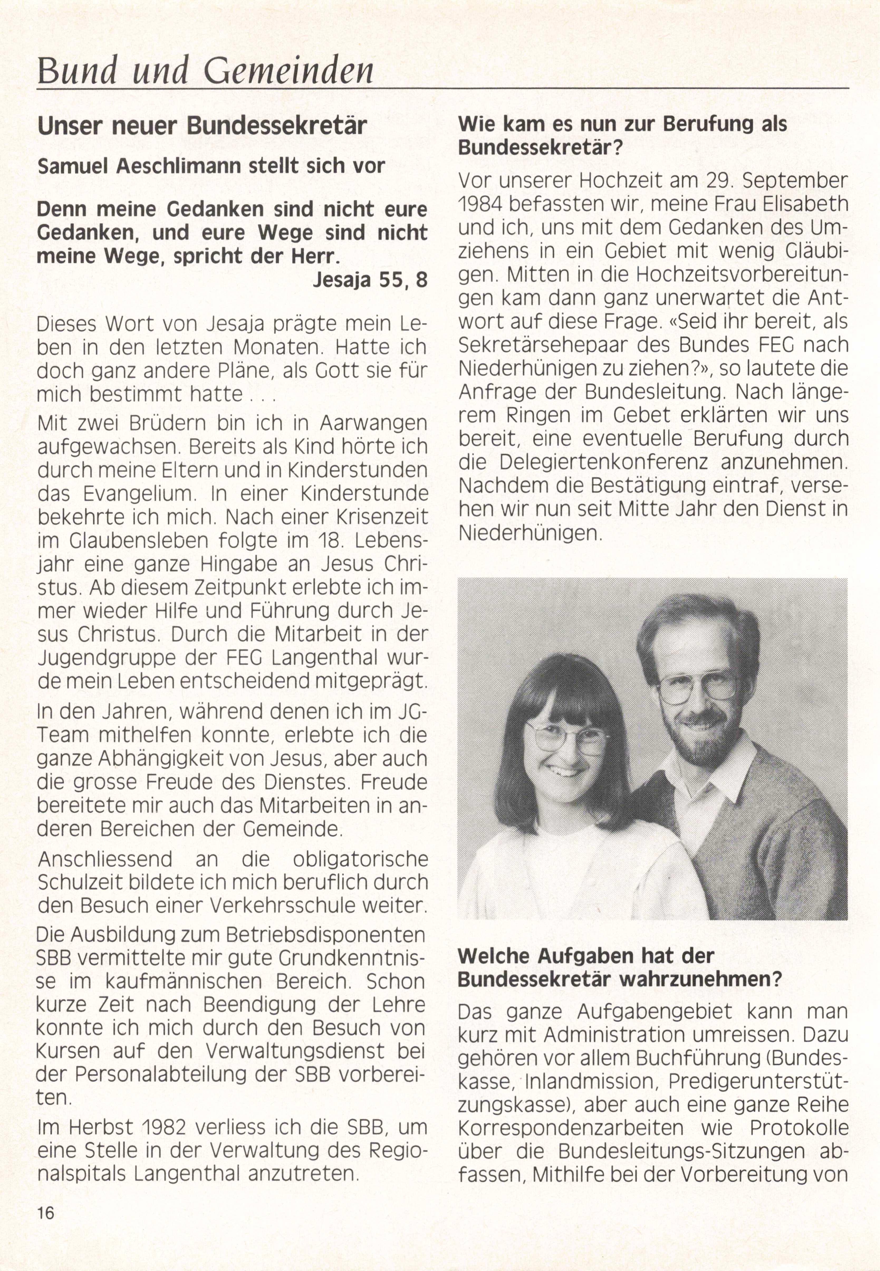 Vor unserer Hochzeit am 29. September 1984 befassten wir, meine Frau Elisabeth und ich, uns mit dem Gedanken des Um ziehens in ein Gebiet mit wenig Gläubi gen. Mitten in die Hochzeitsvorbereitun gen kam dann ganz unerwartet die Ant wort auf diese Frage. «Seid ihr bereit, als Sekretärsehepaar des Bundes FEG nach Niederhünigen zu ziehen?», so lautete die Anfrage der Bundesleitung. Nach länge rem Ringen im Gebet erklärten wir uns bereit, eine eventuelle Berufung durch die Delegiertenkonferenz anzunehmen. Nachdem die Bestätigung eintraf, verse hen wir nun seit Mitte Jahr den Dienst in Niederhünigen,