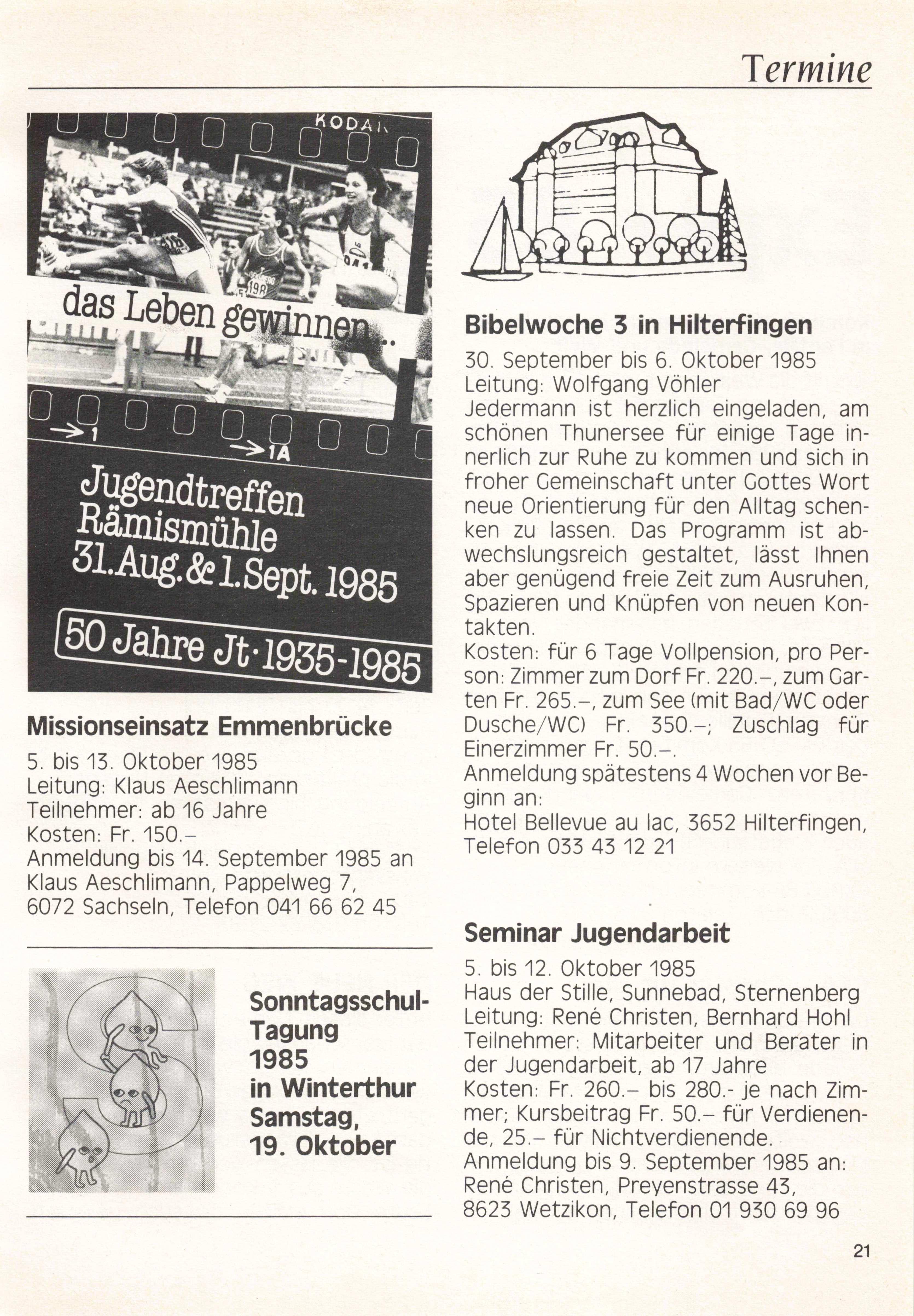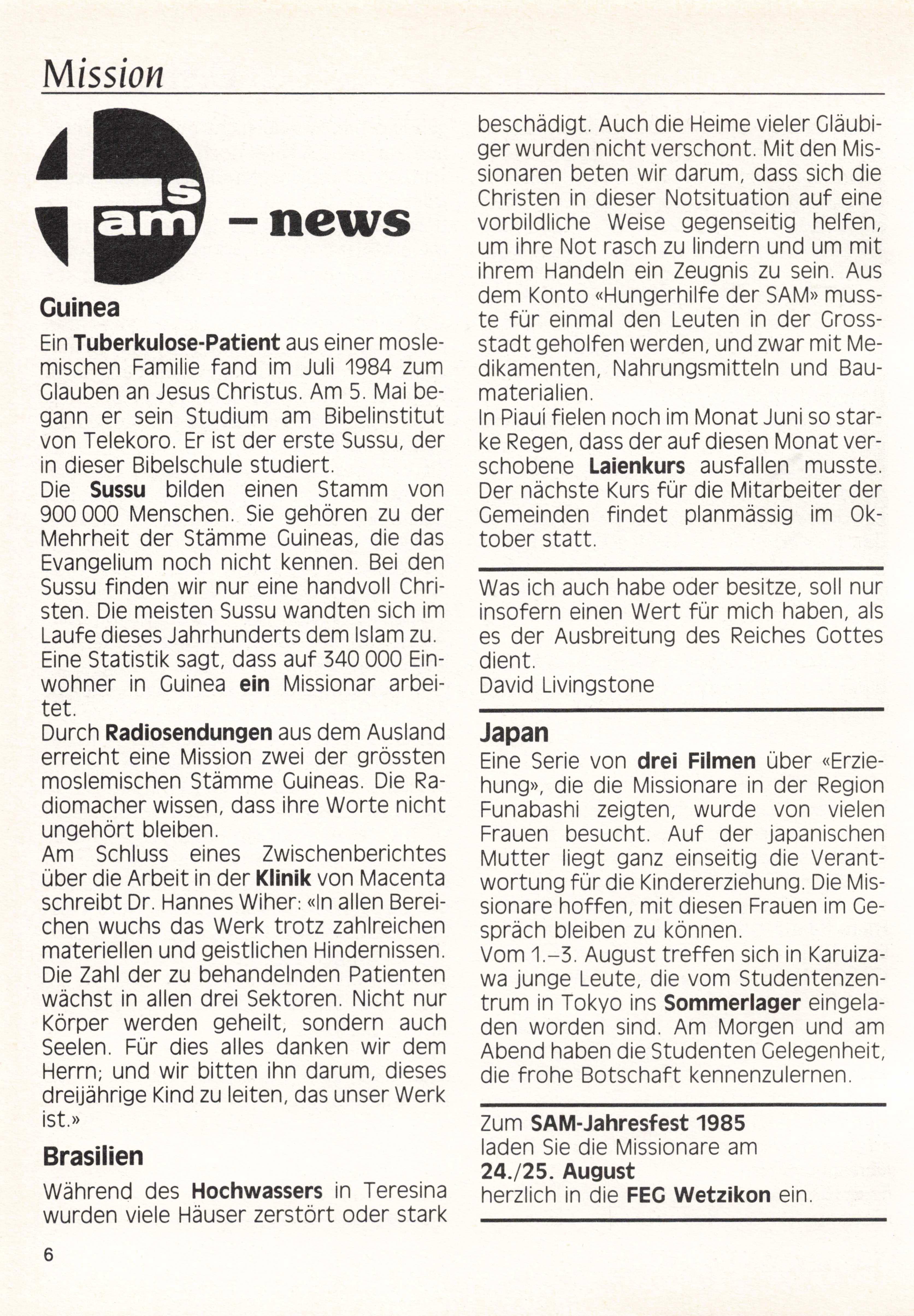 Zum SAM-Jahresfest 1985 laden Sie die Missionare am 24./2S. August herzlich in die FEG Wetzikon ein.