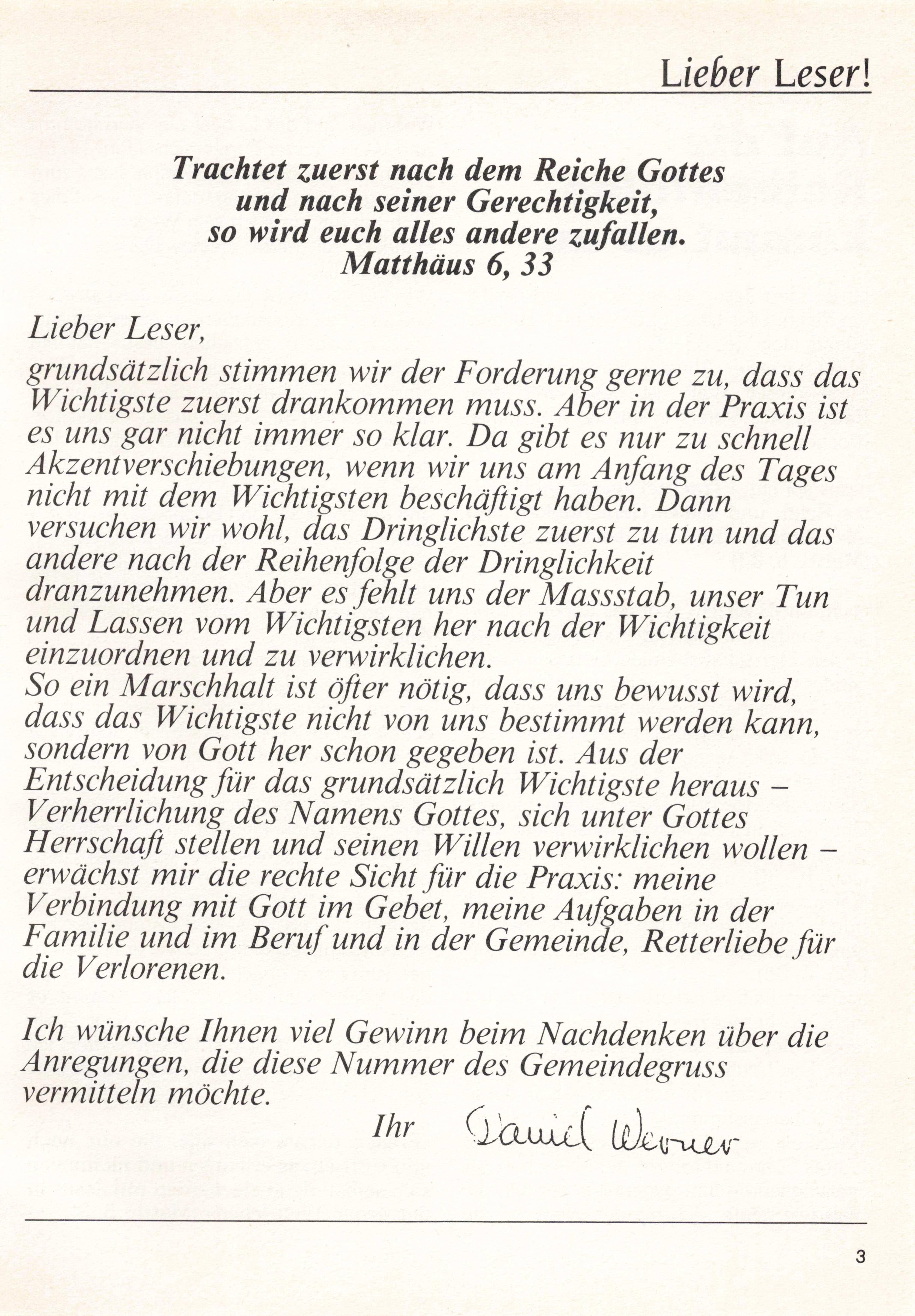 grundsätzlich stimmen wir der Forderung gerne zu, dass das Wichtigste zuerst drankommen muss. Aber in der Praxis ist es uns gar nicht immer so klar. Da gibt es nur zu schnell Akzentverschiebungen, wenn wir uns am Anfang des Tages nicht mit dem Wichtigsten beschäftigt haben. Dann versuchen wir wohl, das Dringlichste zuerst zu tun und das andere nach der Reihenfolge der Dringlichkeit dranzunehmen. Aber es fehlt uns der Massstab, unser Tun und Lassen vom Wichtigsten her nach der Wichtigkeit einzuordnen und zu verwirklichen. So ein Marschhalt ist öfter nötig, dass uns bewusst wird, dass das Wichtigste nicht von uns bestimmt werden kann, sondern von Gott her schon gegeben ist. Aus der Entscheidung für das grundsätzlich Wichtigste heraus - Verherrlichung des Namens Gottes, sich unter Gottes Herrschaft stellen und seinen Willen verwirklichen wollenerwächst mir die rechte Sicht für die Praxis: meine Verbindung mit Gott im Gebet, meine Aufgaben in der Familie und im Beruf und in der Gemeinde, Retterliebe für die Verlorenen.
