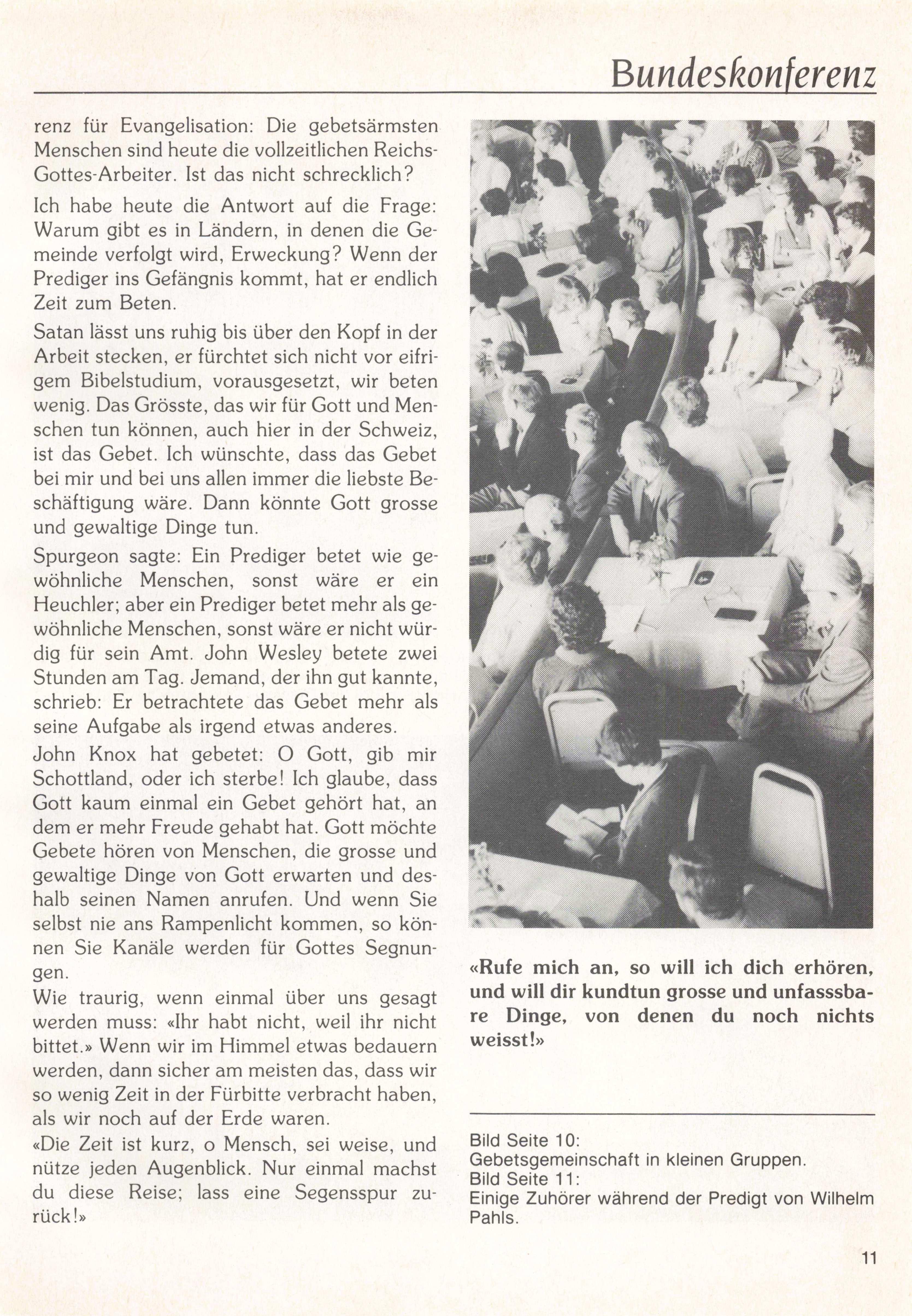 Ich lese zwei Bibelstellen, eine der schönsten im Neuen Testament, und eine der traurig sten: Matthäus 7, 7: «Bittet, so wird auch ge geben!» Das ist herrlich! Und eine der traurig sten: Jakobus 4, 2: «Ihr habt nicht, weil ihr nicht bittet.» In einem Lied singen wir: «Beter sind Wundervollbringer.» Es geschehen wenig Wunder, weil es so wenig wirkliche Beter gibt. Ich möchte hier ganz persönlich werden, lie ber Zuhörer: Sag, wie ist das bei Dir? Führst Du ein Gebetsleben? Hast Du ganz fest einge plante Gebetszeiten? Ich meine jetzt nicht das Tischgebet von 15 Sekunden; sondern ein wirkliches Gebetsleben. Erwartest Du von Gott grosse und gewaltige Dinge? (Jeremia 33, 3!) Wenn nicht, dann hältst Du den zum Narren, zu dem Du rufst. Wie der Junge, der an einer Haustür läutet und dann wegläuft. So machen das ja manche auch: Sie beten und er warten gar nichts. Dabei will Gott grosse und gewaltige Dinge tun. Er will aus muffligen Christen dankbare Christen machen. Er will einer Jugendgruppe, die fast nur aus Mädchen besteht, junge Männer geben. Denn wie soll das werden, wenn diese Mädchen heiraten möchten und es sind keine jungen Männer da? Auch dafür sollte man richtig beten! Wilhelm Pahls erzählte dann Beispiele aus sei nem persönlichen Erleben und auch aus dem Buch «Keine Erweckung ohne Busse»: da wird