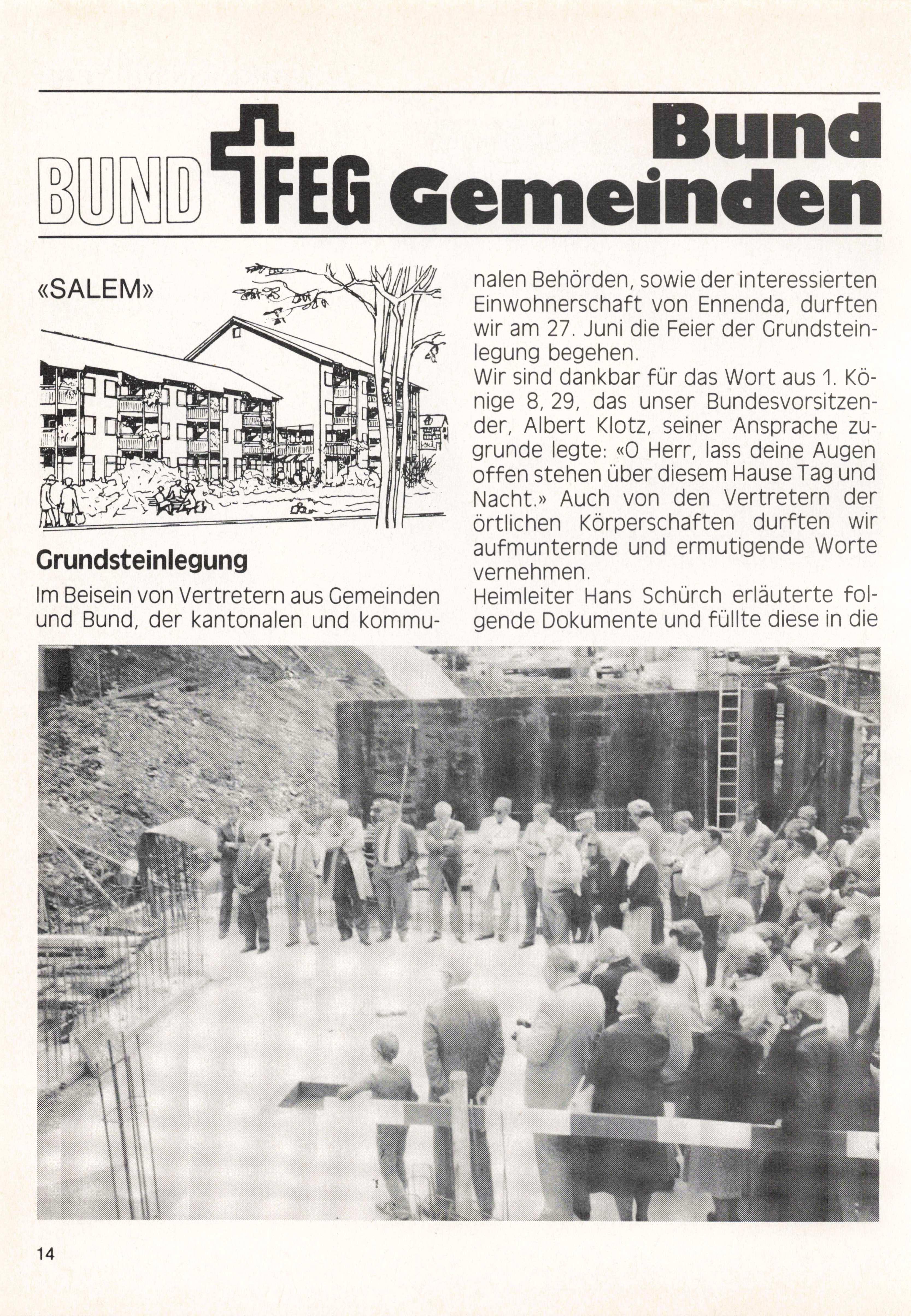 In die Wirkungszelt von Prediger Hans Fröhlich fällt die Gründung des Alters und Pflegeheims Salem (1917). Es befand sich zuerst In einem grossen Haus, das als Predigerswohnung und Krankenstation diente, später kaufte man das Restau rant Schützenhof, welches man zum Al ters- und Pflegeheim umfunktionierte. Durch diese Arbeit geschah viel Segens reiches in Ennenda und der Umgebung. Die Gemeinde Ennenda war nicht immer auf Rosen gebettet, ln den alten Proto kollen liest man immer wieder von finan ziellen Notständen, so dass der Bund (welchem man seit 1910 angehört) unter die Arme greifen musste. Auch vom geistlichen Standpunkt her gesehen ging