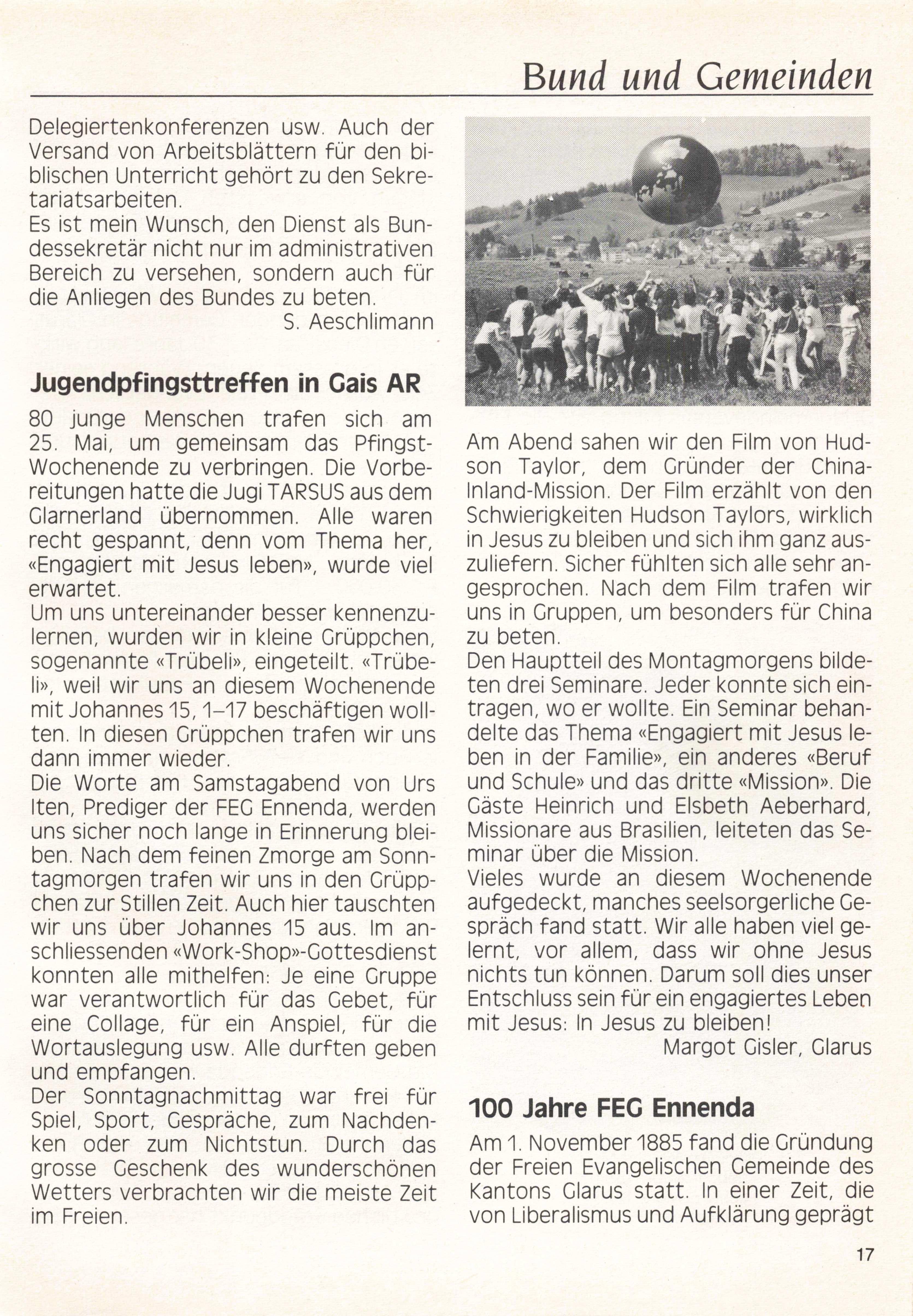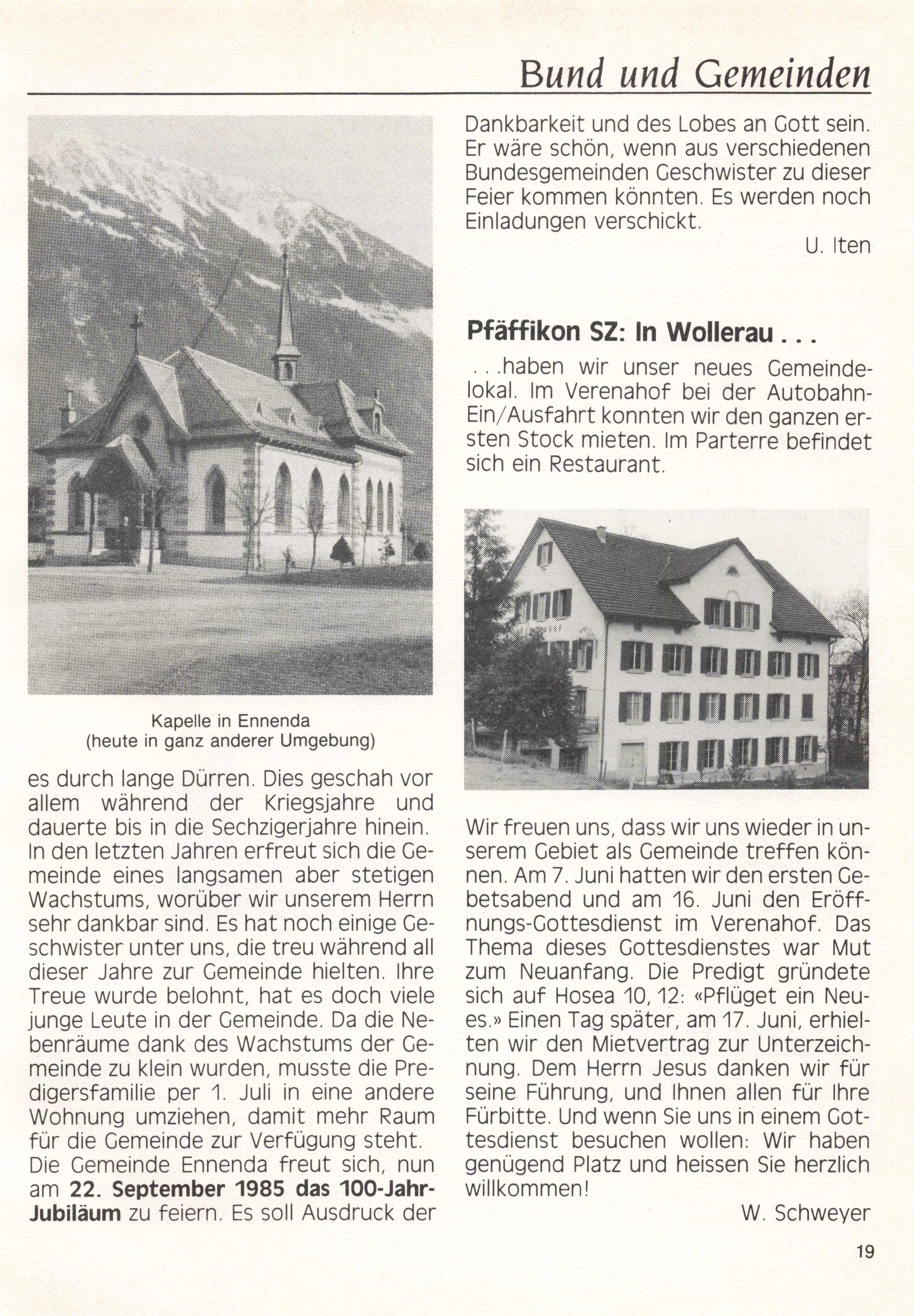 es durch lange Dürren. Dies geschah vor allem während der Kriegsjahre und dauerte bis in die Sechzigerjahre hinein. In den letzten Jahren erfreut sich die Ge meinde eines langsamen aber stetigen Wachstums, worüber wir unserem Herrn sehr dankbar sind. Es hat noch einige Ge schwister unter uns, die treu während all dieser Jahre zur Gemeinde hielten. Ihre Treue wurde belohnt, hat es doch viele junge Leute in der Gemeinde. Da die Ne benräume dank des Wachstums der Ge meinde zu klein wurden, musste die Pre digersfamilie per 1. Juli in eine andere Wohnung umziehen, damit mehr Raum für die Gemeinde zur Verfügung steht. Die Gemeinde Ennenda freut sich, nun am 22. September 1985 das 100-JahrJubiläum zu feiern. Es soll Ausdruck der