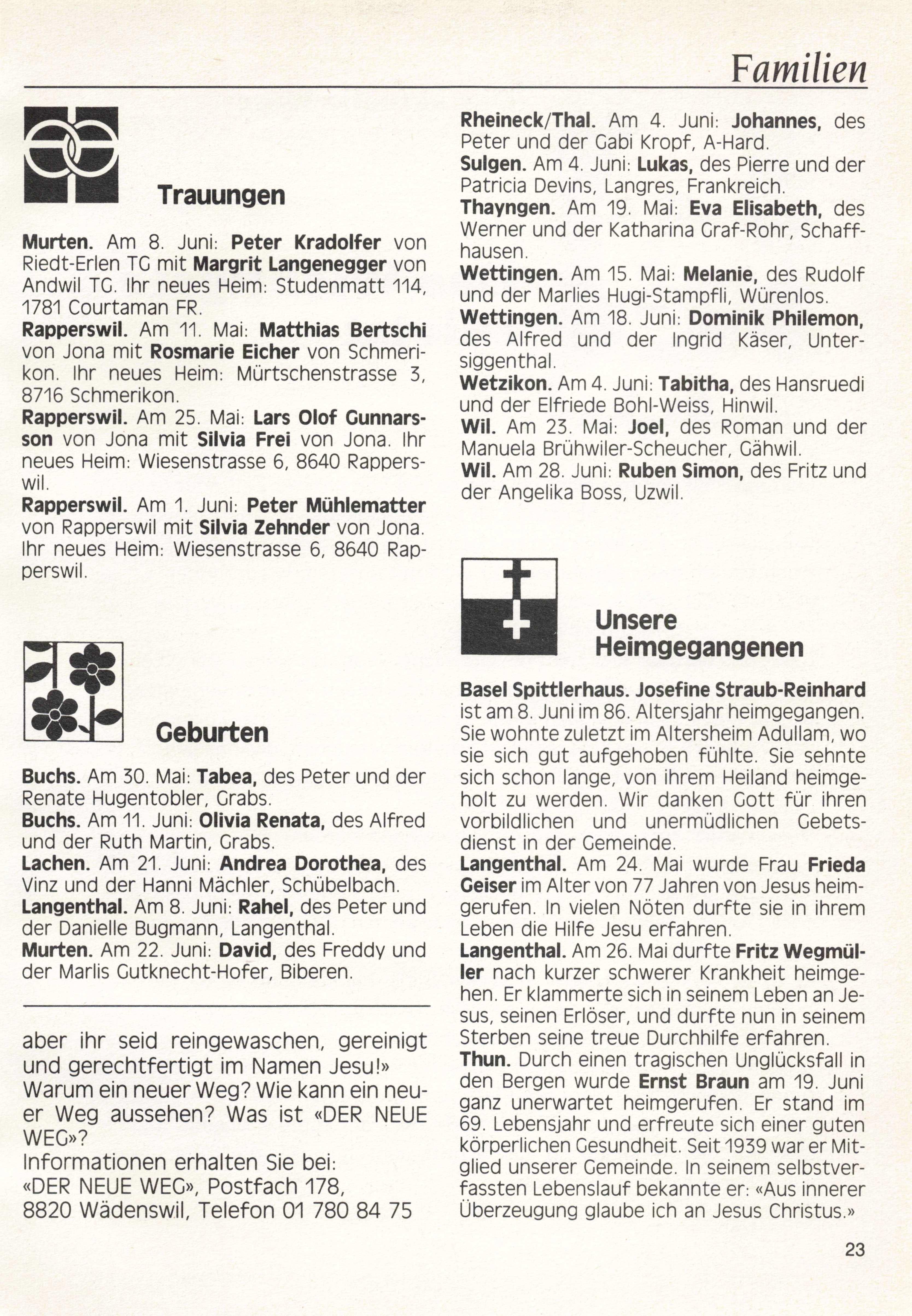 Buchs. Am 50. Mai: Tabea, des Peter und der Renate Hugentobler, Grabs. Buchs. Am 11. Juni: Olivia Renata, des Alfred und der Ruth Martin, Grabs. Lachen. Am 21 Juni: Andrea Dorothea, des Vinz und der Hanni Mächler, Schübelbach. Langenthal. Am 8. Juni: Rahel, des Peter und der Danielle Bugmann, Langenthal. Murten. Am 22. Juni: David, des Freddy und der Marlis Gutknecht-Hofer, Biberen.