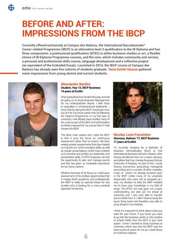 Currently offered exclusively at Campus des Nations, the International Baccalaureate® Career-related Programme (IBCP) is an alternative level 3 qualification to the IB Diploma and has three components: a professional qualification (BTEC) in either business studies or art, a flexible choice of IB Diploma Programme courses, and the core, which includes community and service, a personal and professional skills course, language development and a reflective project (an equivalent of the Extended Essay). Launched in 2014, the IBCP course at Campus des Nations has already seen five cohorts of students graduate. Tania Gentet Ganose gathered some impressions from young alumni and current students.