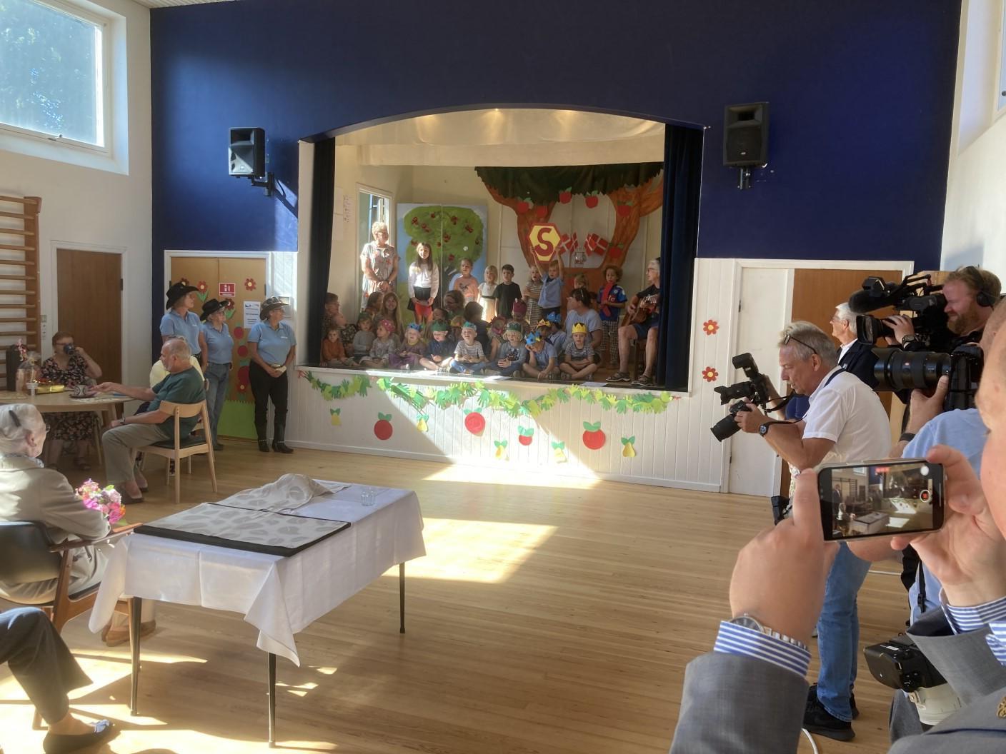 Tv.erarkivlederSørenSkouigangmedgeneralprøvenpåtalenforDronningen,hvorhanpræsentererFejø-bægeret.Ovenforerfotografernei gangigymnastiksalen.Fotos:Anne-GretheLaursen.