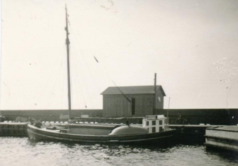 agter enden ind, efter at vi først havde lagt anker ud. Der lå vi så, med en tredjedel af Mæfikkens styrbord side mod et andet skib som lå halvt ude af havnehullet.
