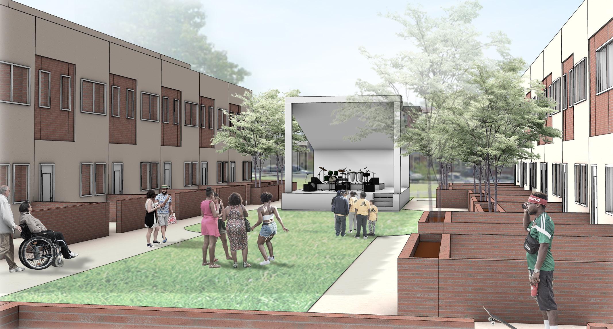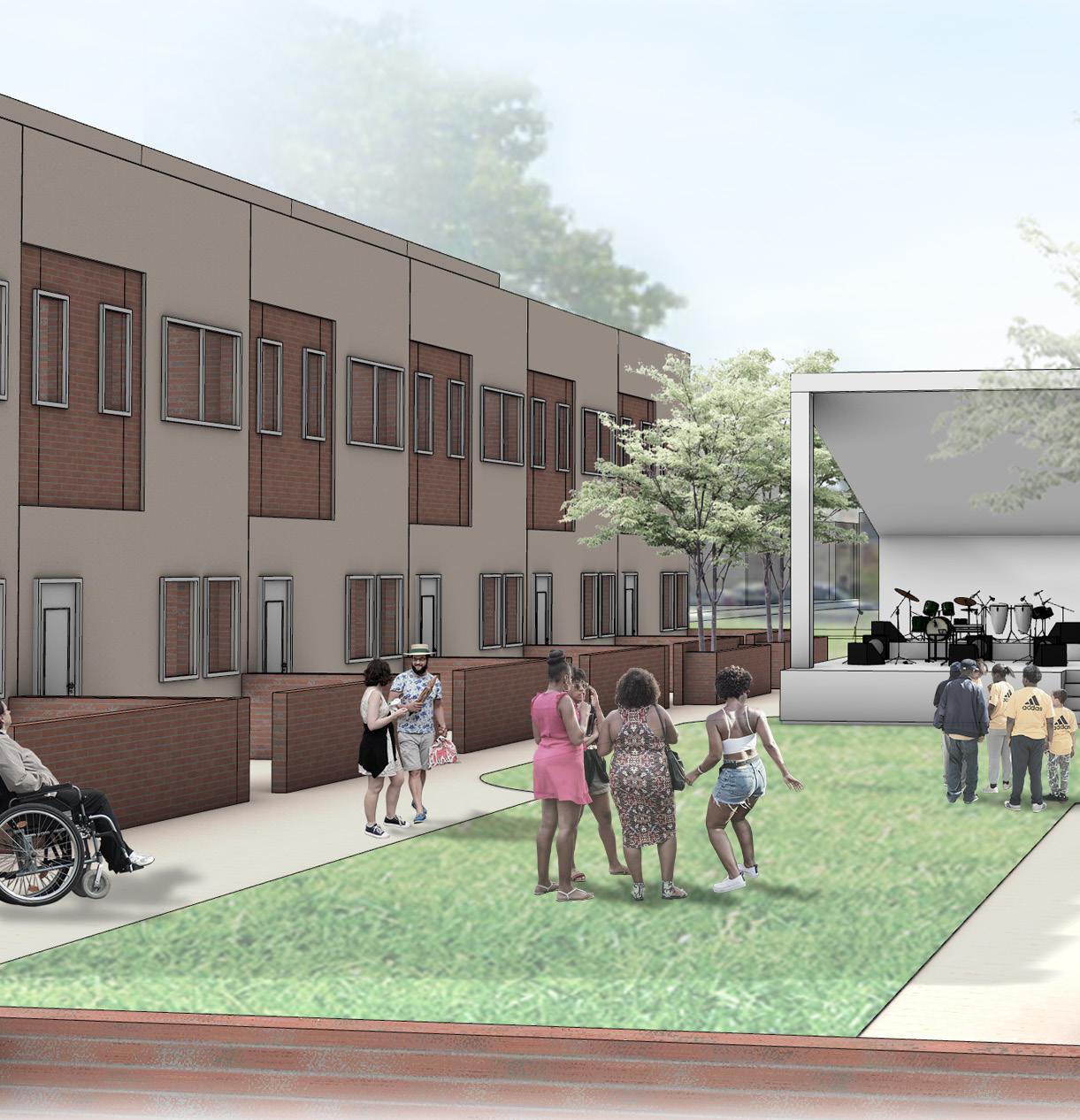 The row house project focuses on reducing heat islands, bringing the divided community together through music, while matching the materiality of the surrounding.