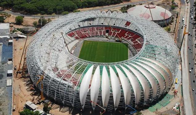 Dito isso, resolvemos mostrar a parte da estrutura interna de outro projeto com características similares ao nosso, o Estádio Gigante da Beira Rio, localizado em Porto Alegre. O projeto conta com estrutura em aço coberta por membranas de policarbonato, além de ter uma forma curva.