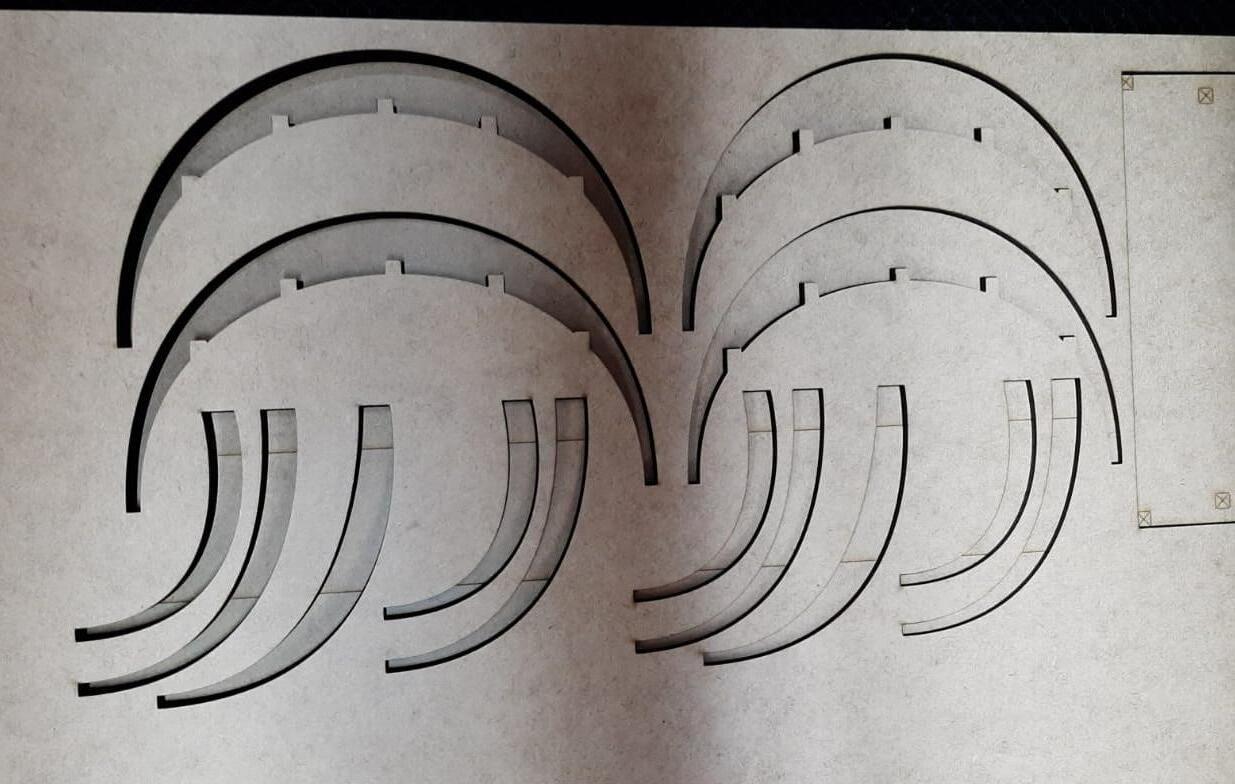 Feito o algortimo, resolvemos tentar a fabricação por impressão 3D, feita em filamento PLA (polímero termoplástico ácido polilático) de diâmetro 2,85 mm, após devidamente desenvolver o algoritmo, buscamos realizar a impressão 3d, até o momento da fabricação, o algoritmo provou não funcionar para esse método, tanto pela estrutura não ter sido reconhecida plenamente pelo software de impressão 3d, imprimir a nossa geometria se mostrou muito custosa, sendo os suportes para sustentar as partes da estrutura. Vendo que a impressão 3d não obteve sucesso, percebemos que a abordagem ideal para nosso módulo, seria a impressão por corte a laser. sendo assim, usamos de um MDF cru espessura nominal 3 mm (espessura real aproximada 2,85 mm), marca Berneck, para servir de matéria prima de fabricação do módulo. Buscamos planificar a estrutura, porém não conseguimos organizar plenamente no software, por isso tivemos que optar por levar a planificação desorganizada para o software AutoCad e organizar, obtendo sucesso. Optamos por fazer o modelo final com duas camadas de Mdf, o que fez com que os encaixes não ficassem muito justos, mas ainda assim, encaixavam