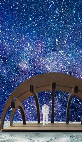 Como partido de criação, se pensou em um pavilhão expositor/ observatório. Onde seriam exibidos estudos sobre o local e ao mesmo tempo, mostrar o estudado. Um local para a realização de palestras, ou um espaço de estar e lazer, para observar a imensidão da galáxia. Sendo um pavilhão itinerante, poderia ser desmontado e remontado em diversos lugares e acompanhar a topografia acidentada da Lua e seus formatos orgânicos. O importante é que se possa olhar ao redor e não esconder a beleza ao redor.