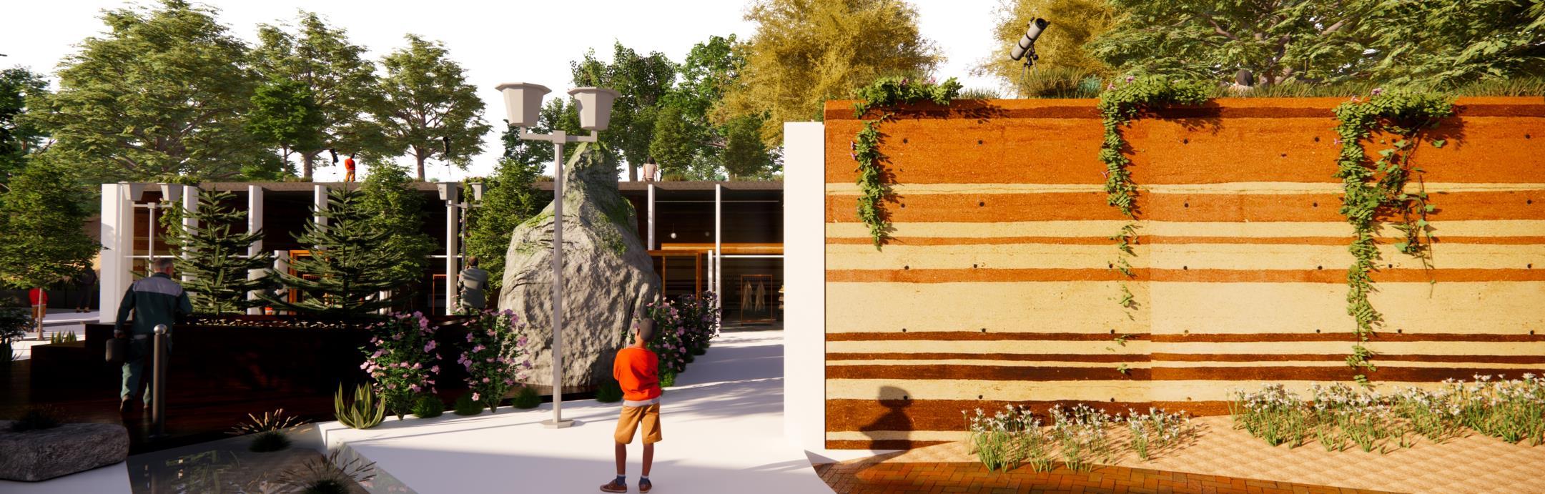 Se aprovecha la variedad de vegetación y preexistencias como grandes rocas para la implantación del proyecto, así mismo se juega con la vegetación con el fin de crear espacios adecuados para el mirarí y el planetario.