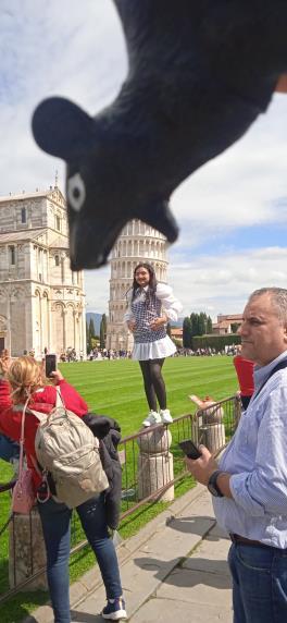 La idea era fer una foto graciosa a la torre de Pisa, però al final es va convertir en la protagonista del viatge. Va fer-li fotografies, va portar-la a tots els llocs possibles, va menjar amb ella... i moltes més coses. Ella diu que va començar sent una broma i va acabar sent la seua companya