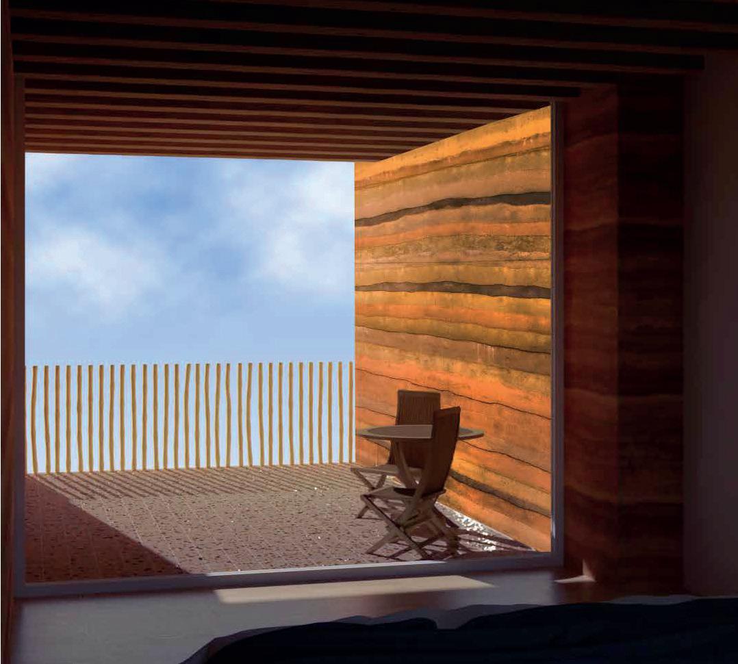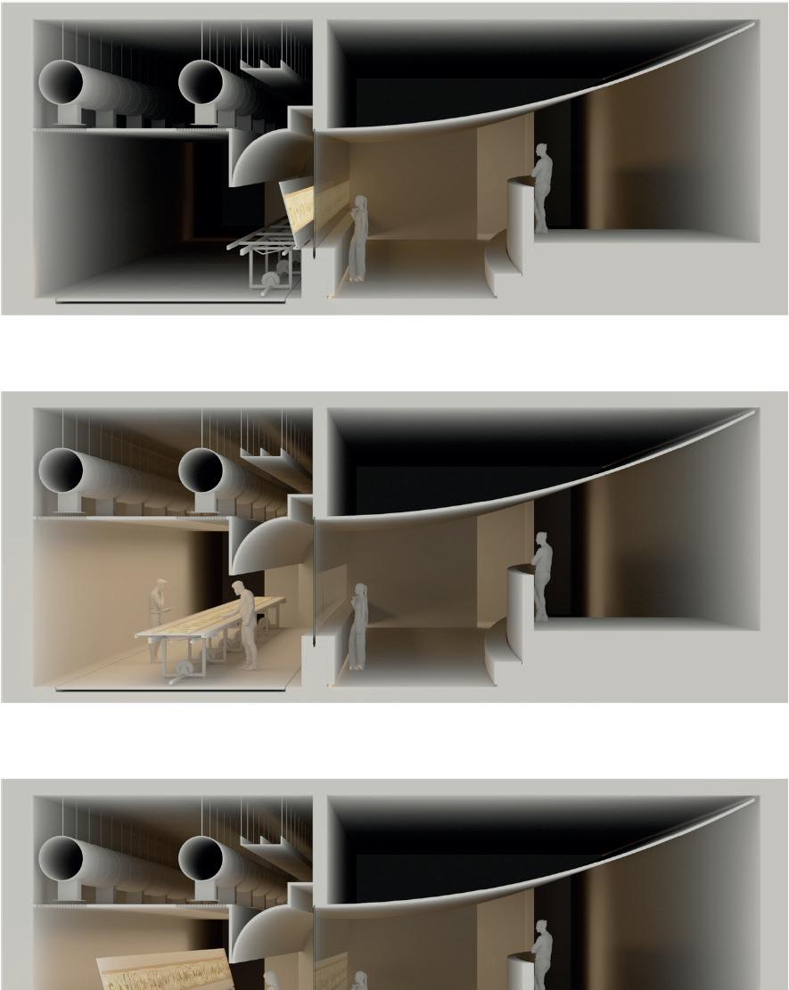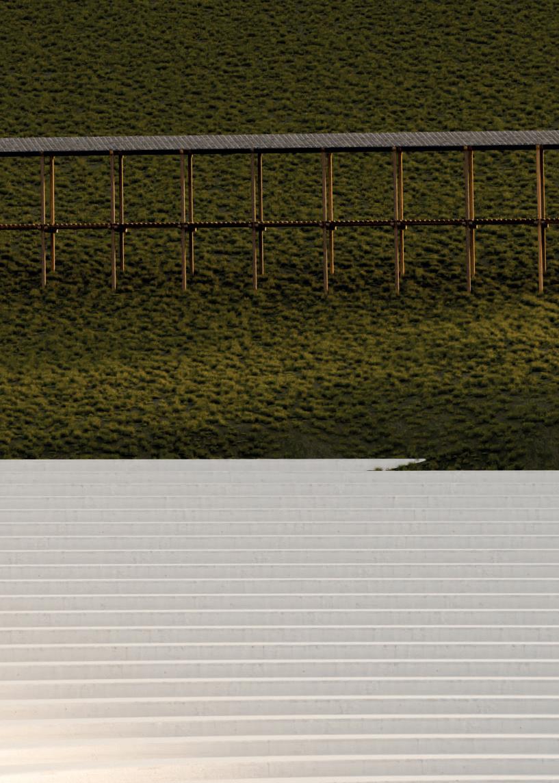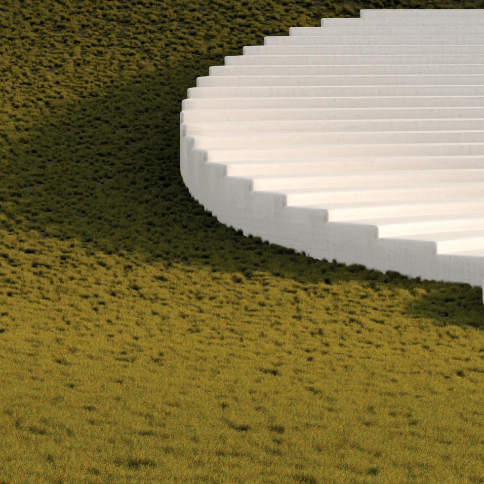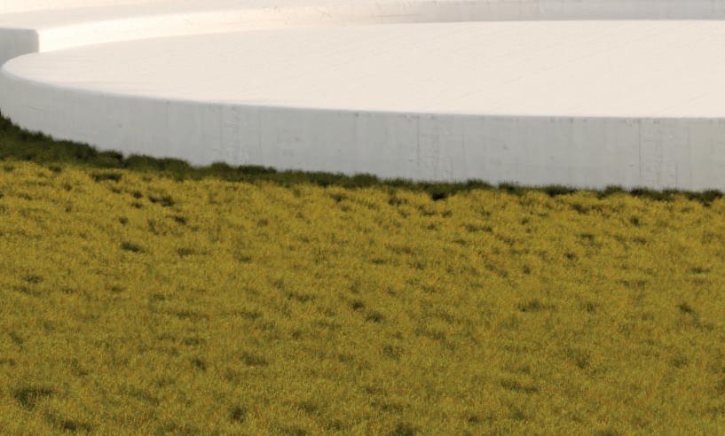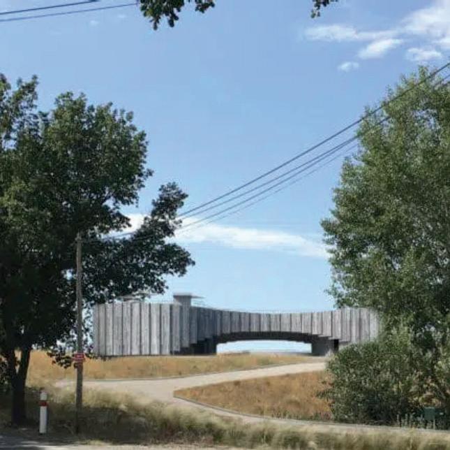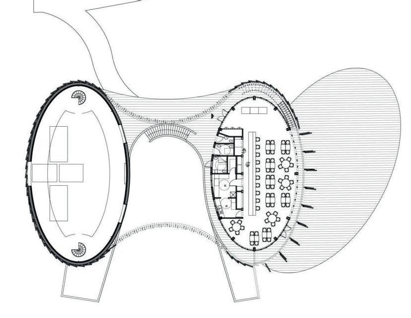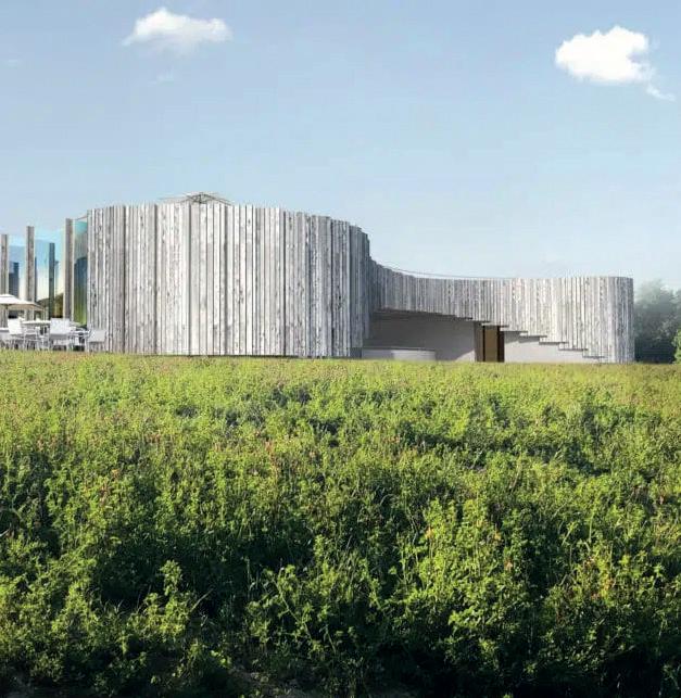 Implanté dans la partie Sud du terrain, le bâtiment vinicole s’harmonise avec le paysage environnant, dominé par les vignobles et les massifs forestiers du Luberon et de la montagne Sainte-Victoire. Sa silhouette courbe, inspirée des formes naturelles, varie en hauteur de 4 à 6 mètres, et est habillée de panneaux en bois pré-grisé. Le rezde-chaussée accueille un restaurant et une boutique, tandis que les locaux de production sont situés au sous-sol, exploitant la déclivité naturelle pour le processus gravitaire de vinification. Trois hangars, aux façades en enduit ton pierre et toitures en tuiles de terre cuite, complètent l’ensemble dans la partie Nord du terrain. Le projet s’intègre discrètement dans le paysage, respectant l’histoire et l’identité du lieu.