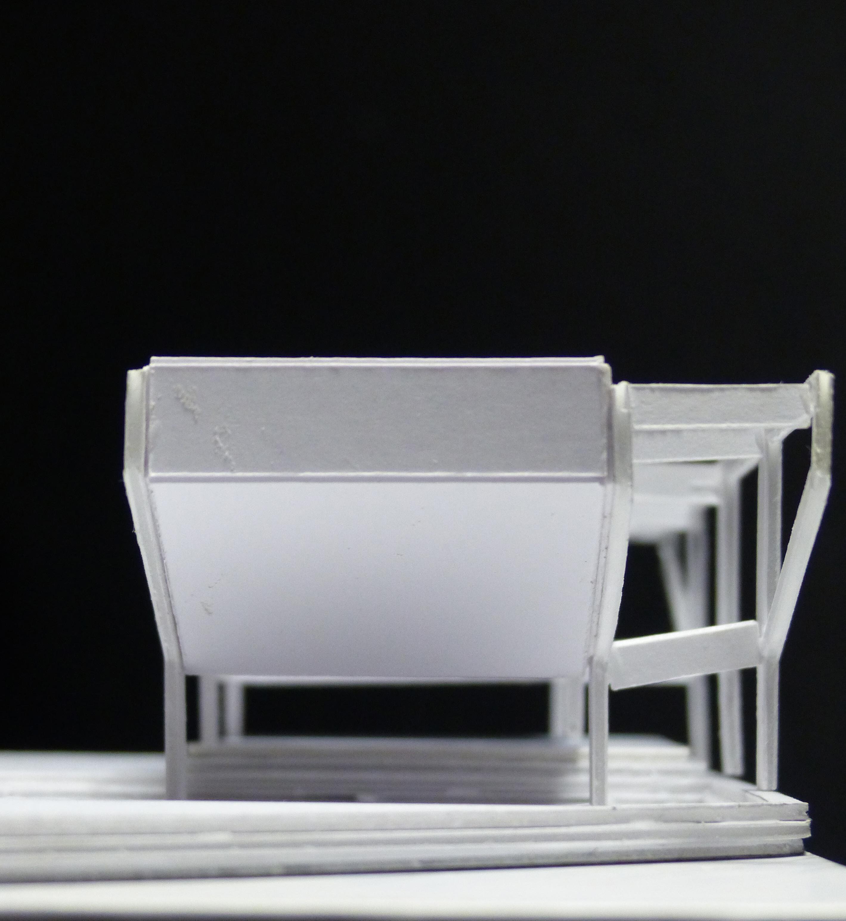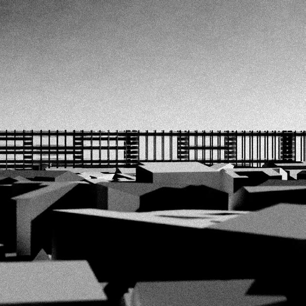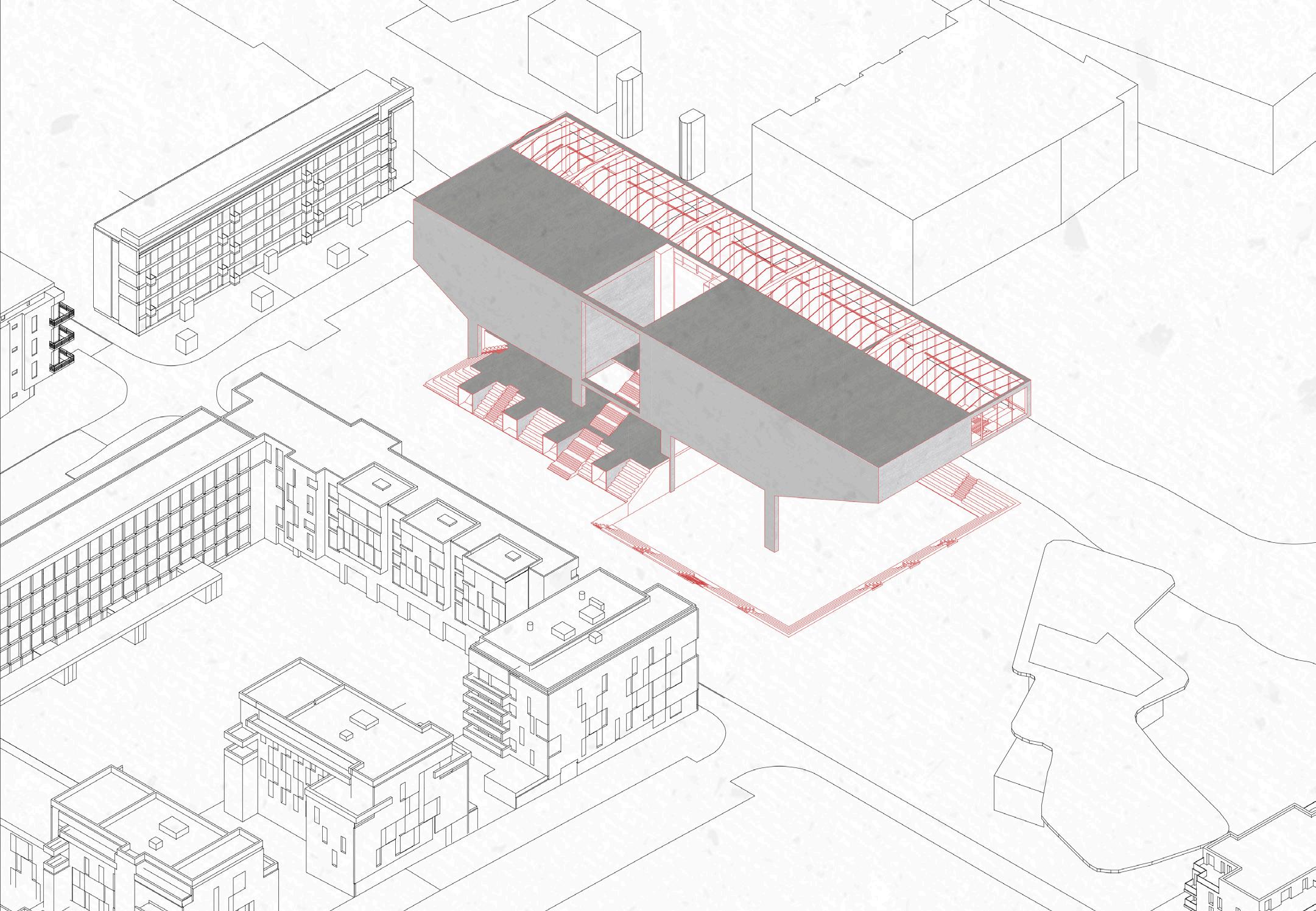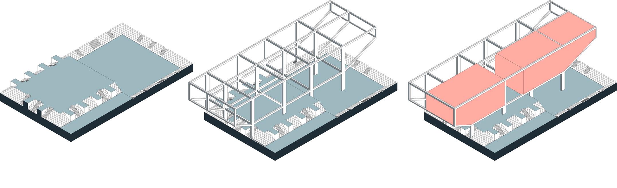 C’est dans ce but que naît l’idée d’un « bâtiment signal » avec une esthétique forte qu’elle plaise ou non. Basée sur une méga structure assez «simple», les deux salles sont surélevées et dominent d’un coté la gare et de l’autre la place et le parc. Cette action de soulever le bâtiment permet la création d’un espace publique abrité sans pour autant casser la dynamique existante de la place. De plus un jeu d’excavation et de surélévation viens créer une scène publique indépendantes du théâtre ayant pour objectif d’être de facilité l’intégration de ce bâtiment nouveau dans le quotidien des habitants.