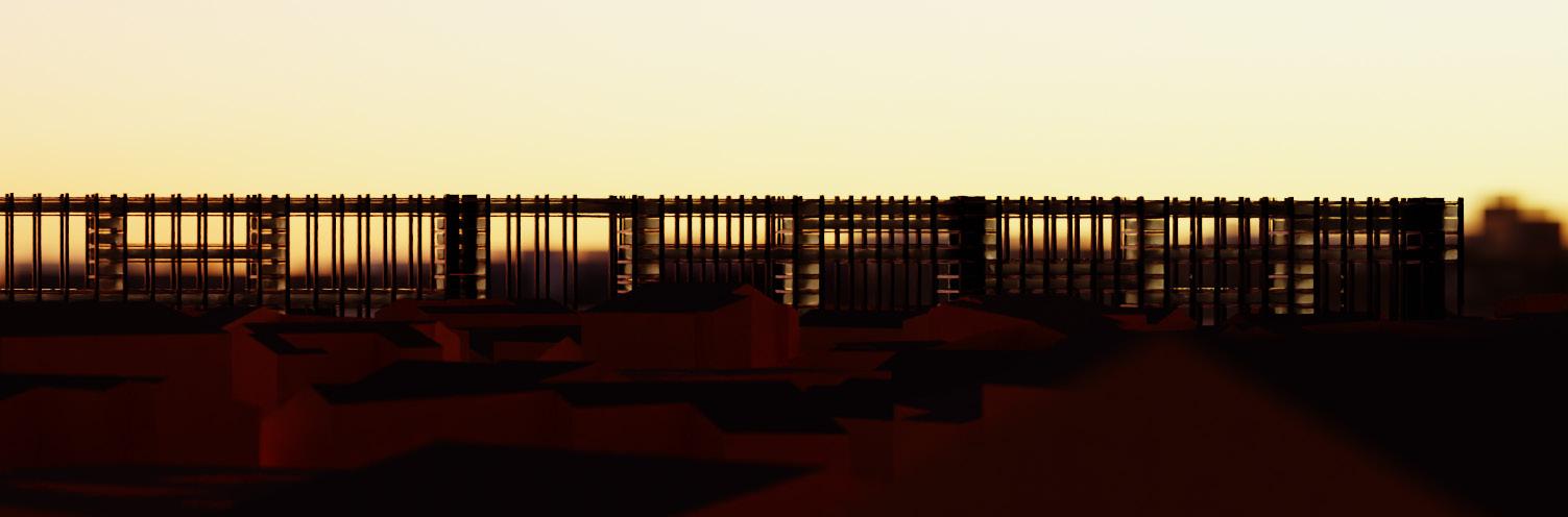 Tel un mur de scène, le bâtiment se veut monumental mais garde une certaine transparence comme un geste de politesse envers le voisinage, une invitation à regarder de loin se dérouler la grande pièce de théâtre qu’est la vie de ce bâtiment..